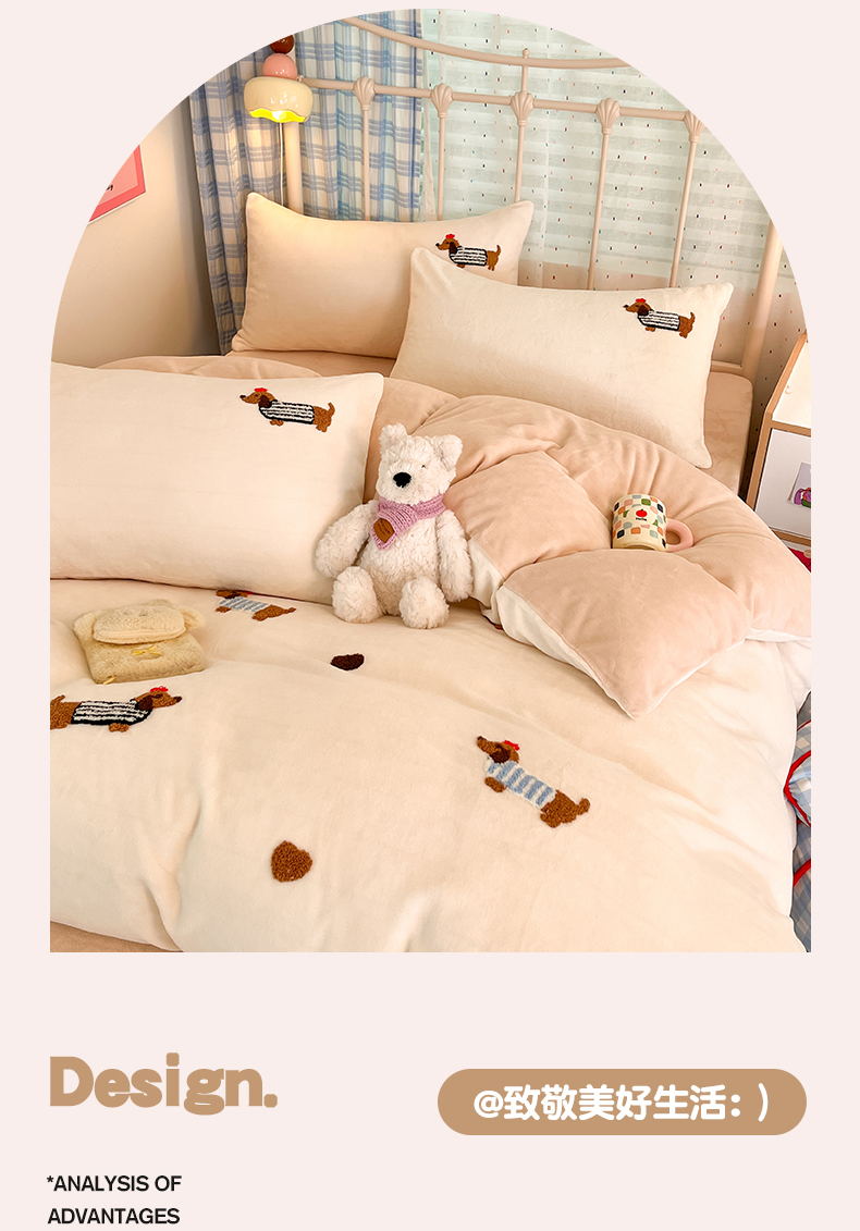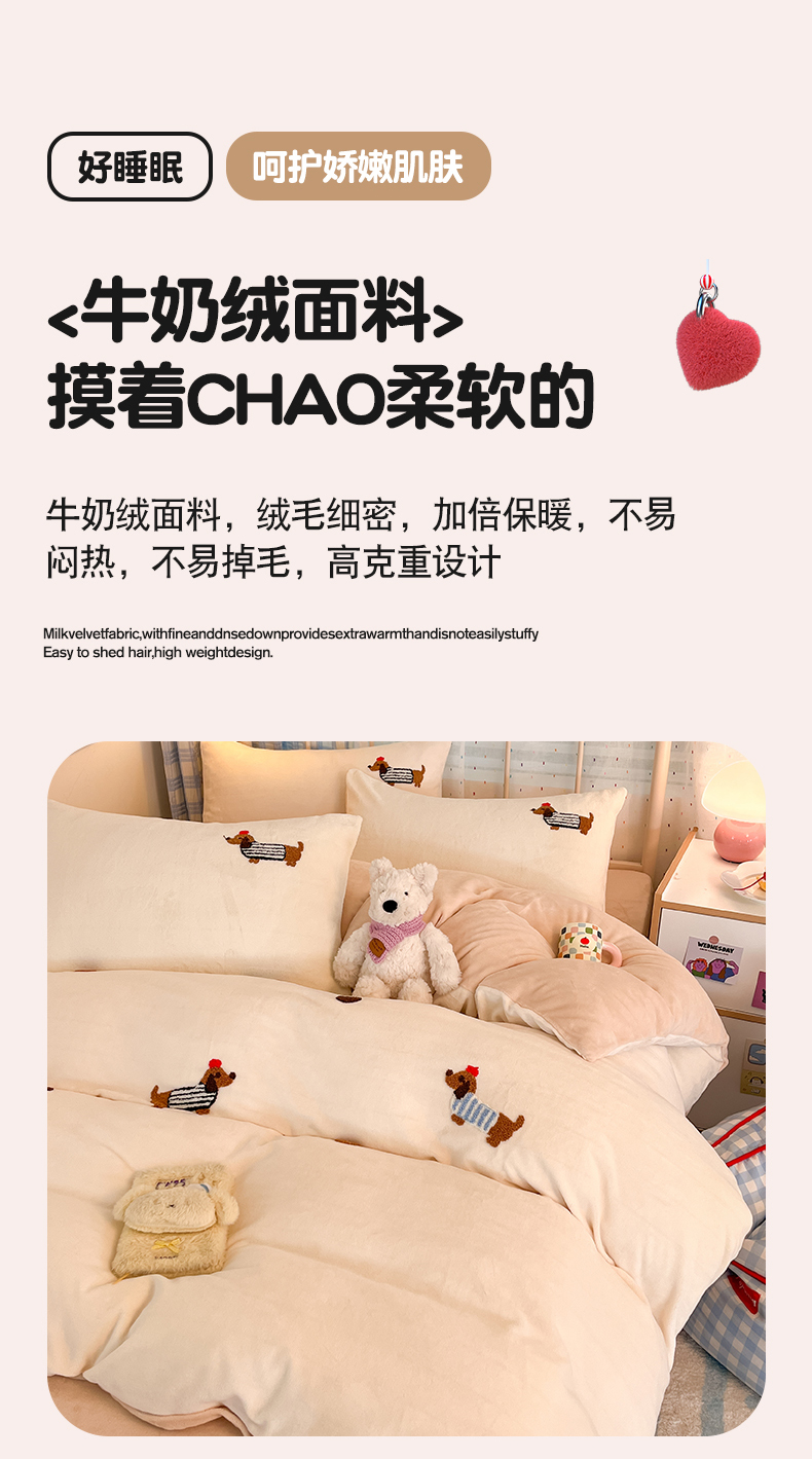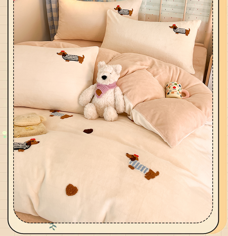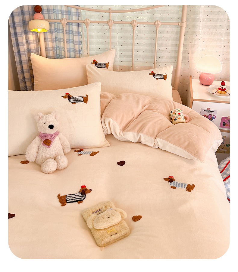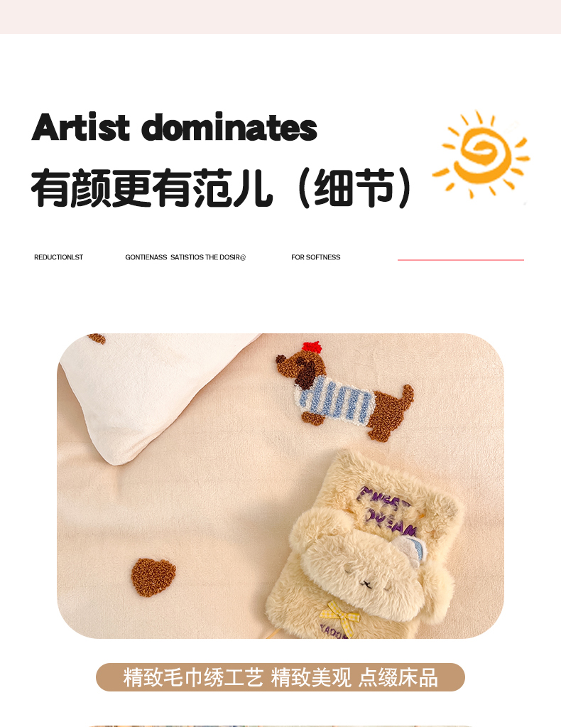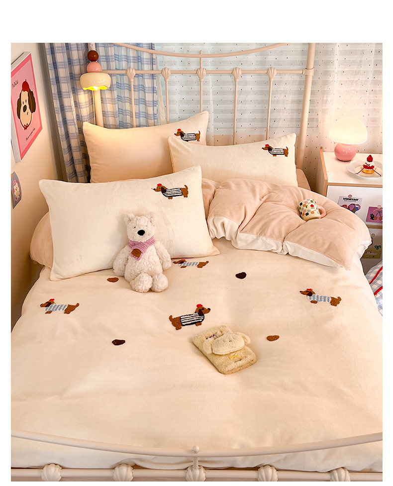 商品名称:羚羊语家纺 2025新款牛奶绒手作款樱桃女孩四件套毛巾绣刺绣花秋冬加厚法莱绒法兰绒珊瑚绒三件套 毛巾绣-腊肠狗
