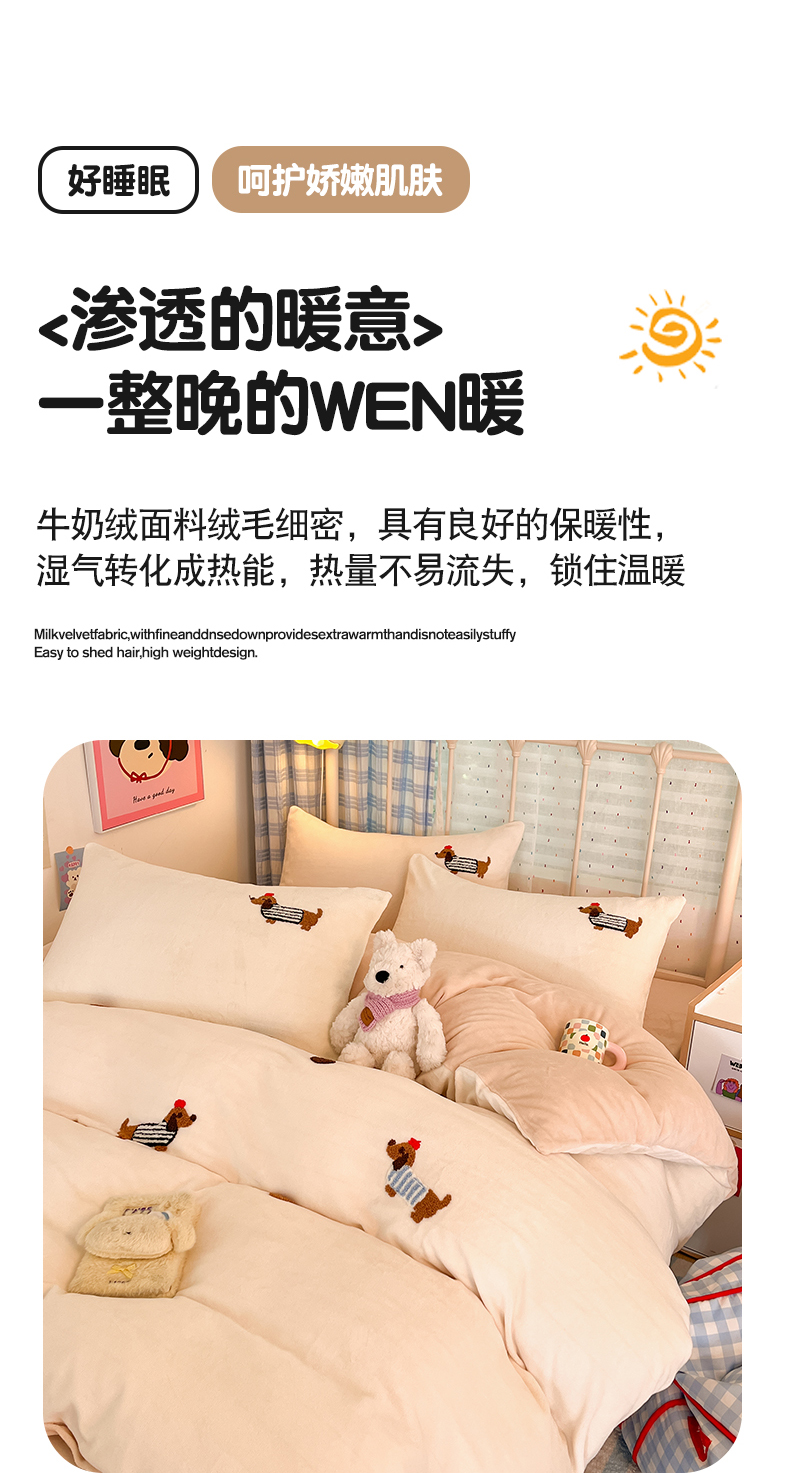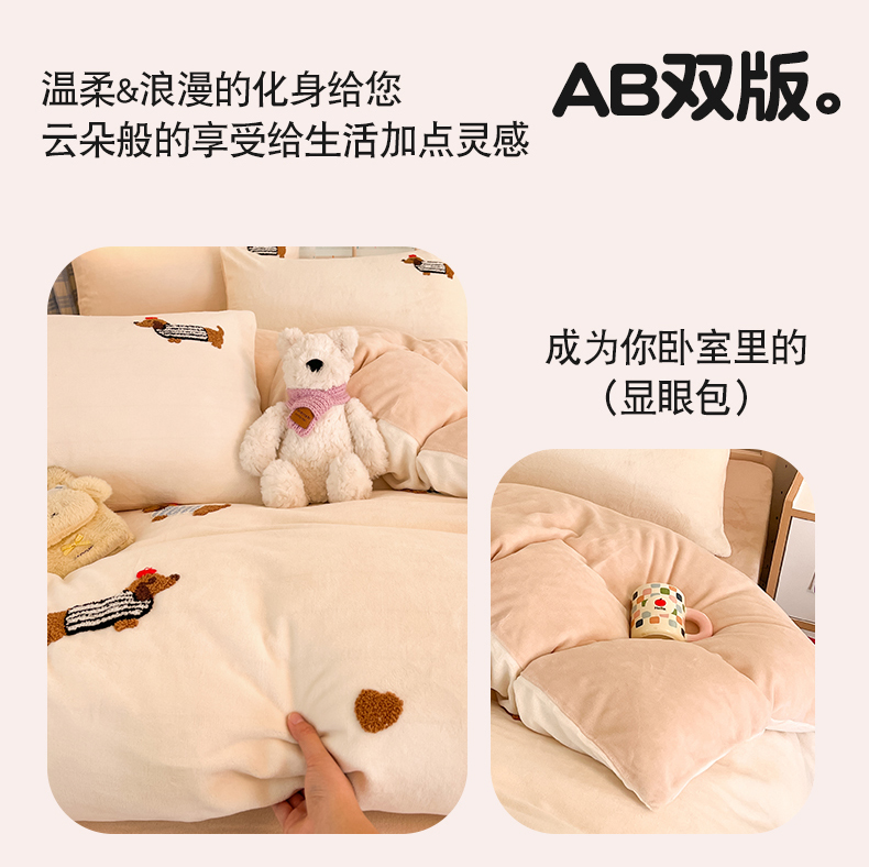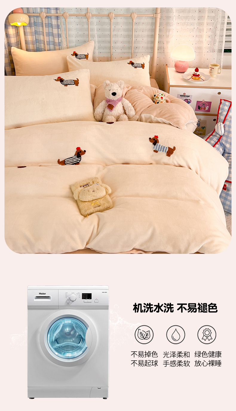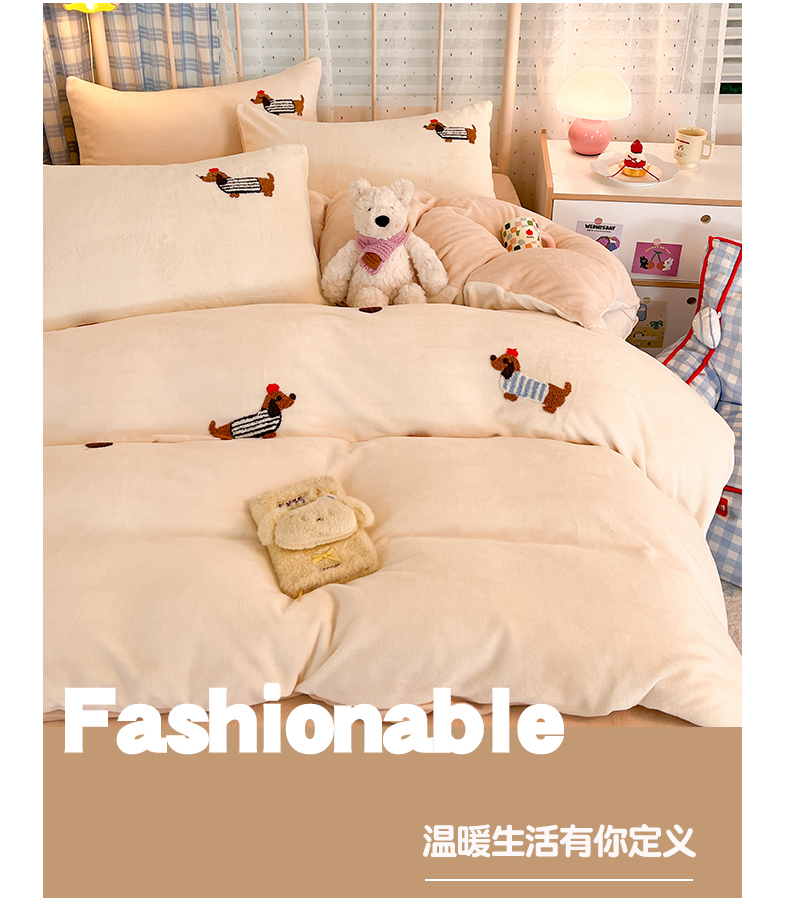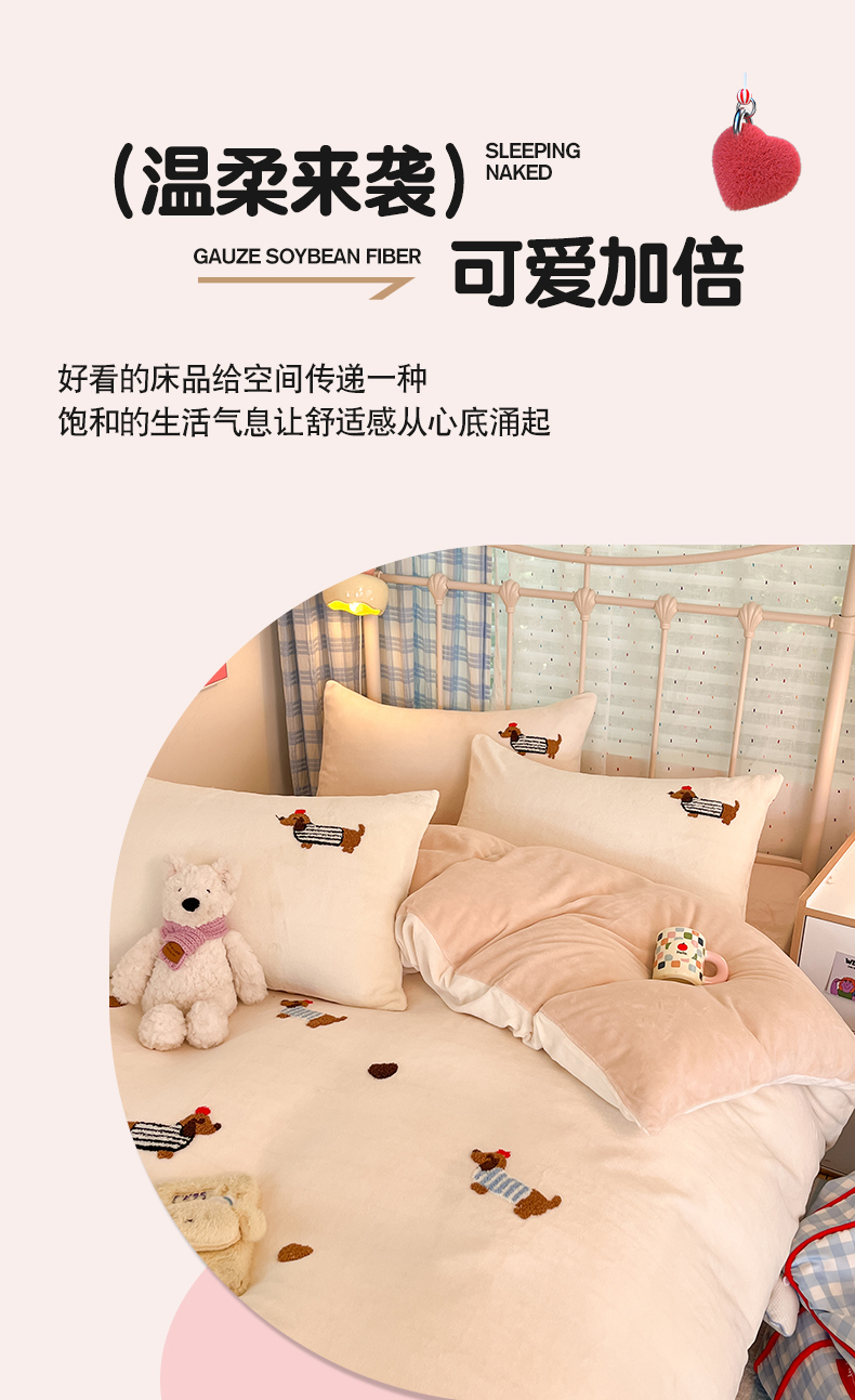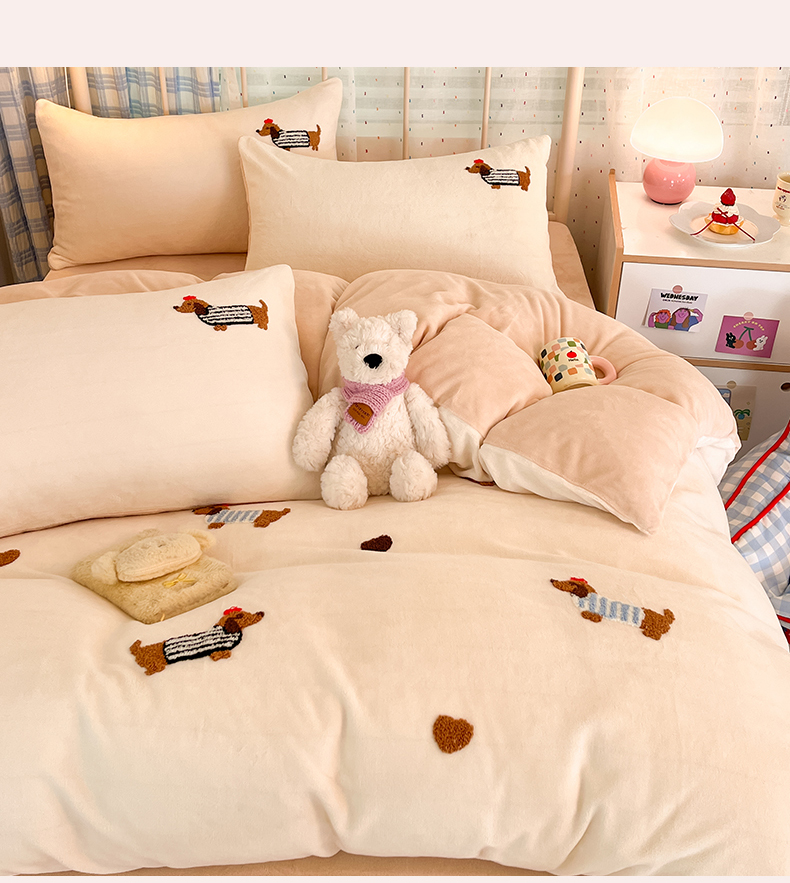 商品名称:羚羊语家纺 2025新款牛奶绒手作款樱桃女孩四件套毛巾绣刺绣花秋冬加厚法莱绒法兰绒珊瑚绒三件套 毛巾绣-腊肠狗