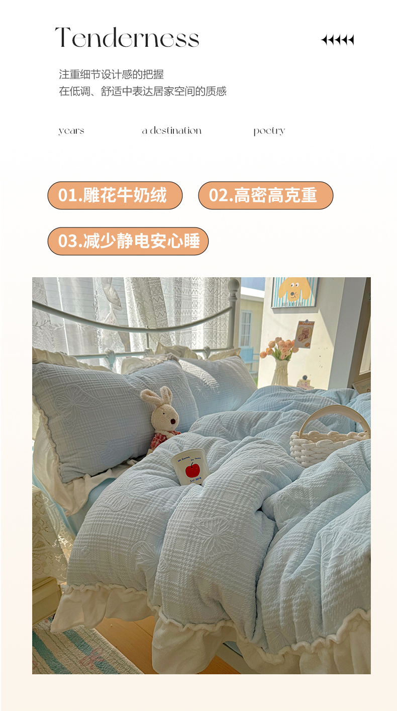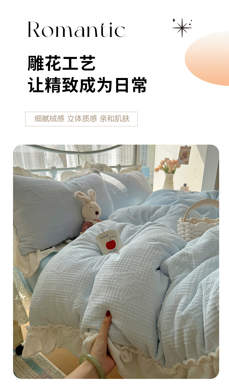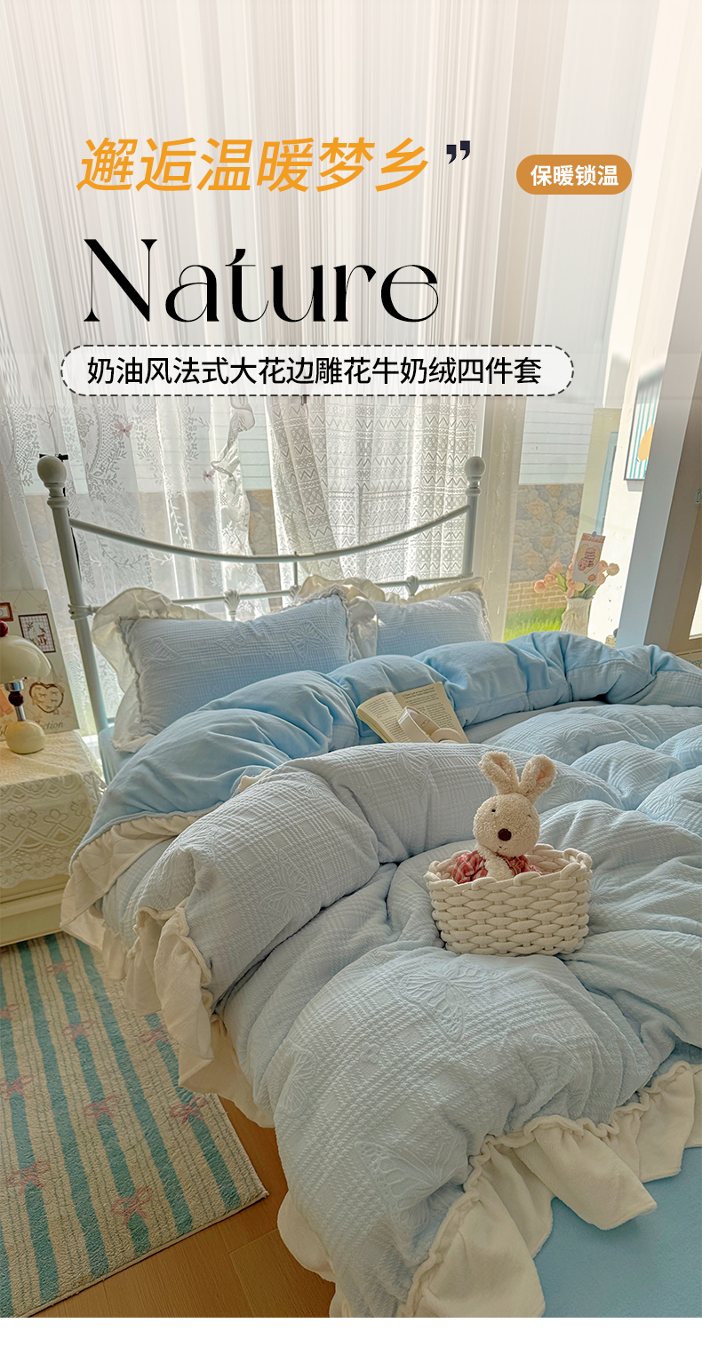 当前位置: 91家纺网 > 商品网购 > 床品套件 > 四件套 > 牛奶绒四件套 > 捌月 2025新款奶油风法式大花边雕花牛奶绒四件套 化蝶-晴空蓝
