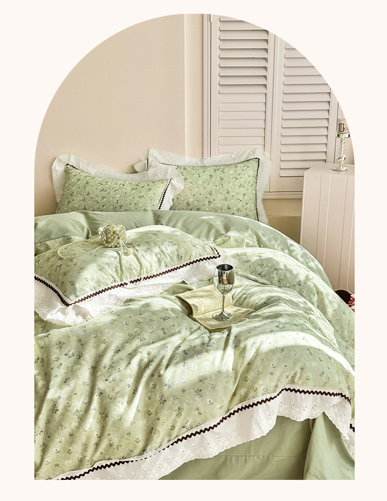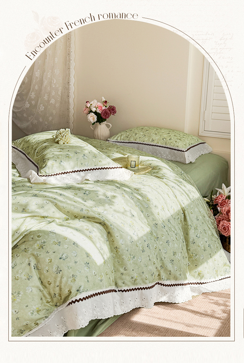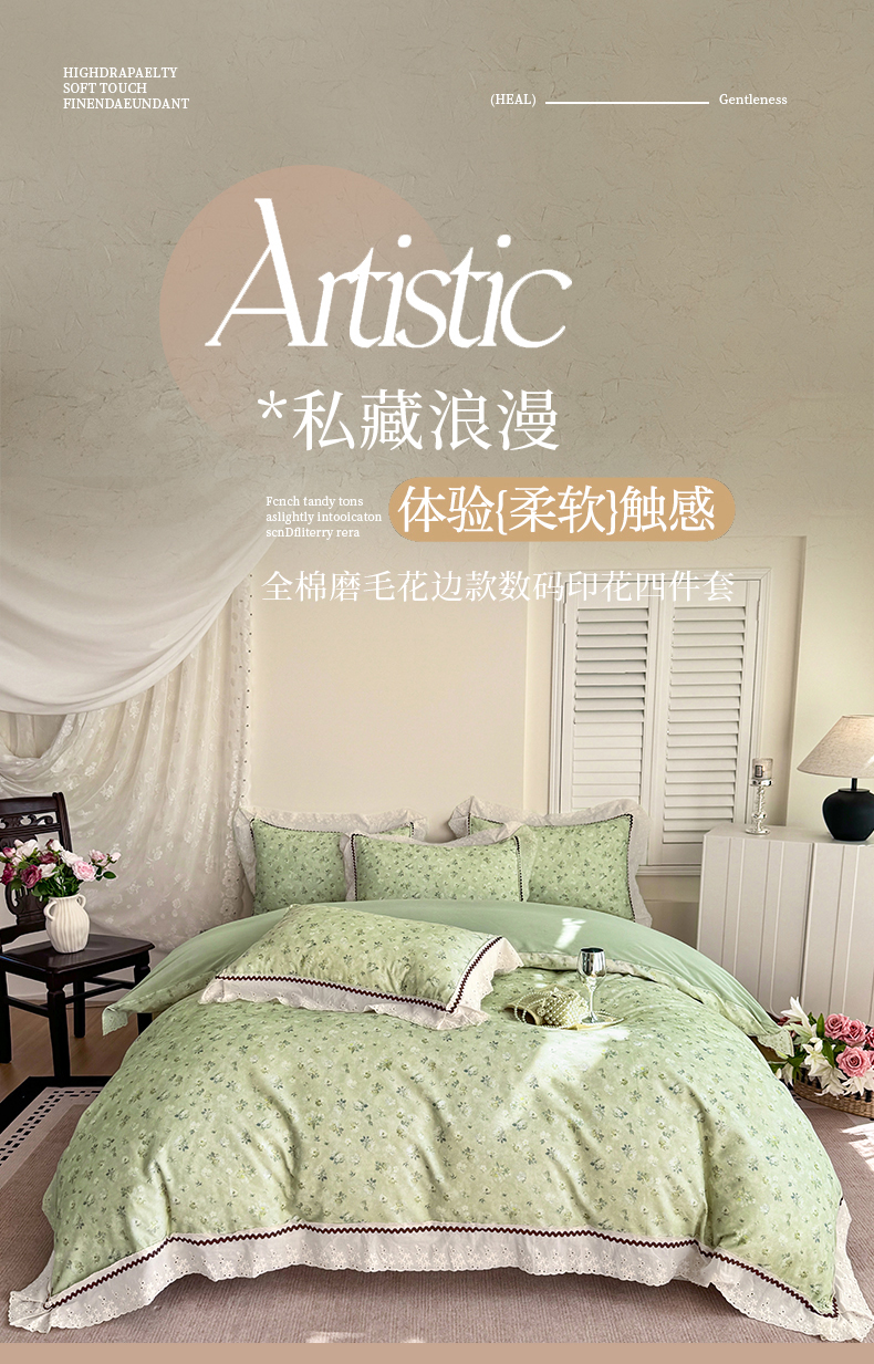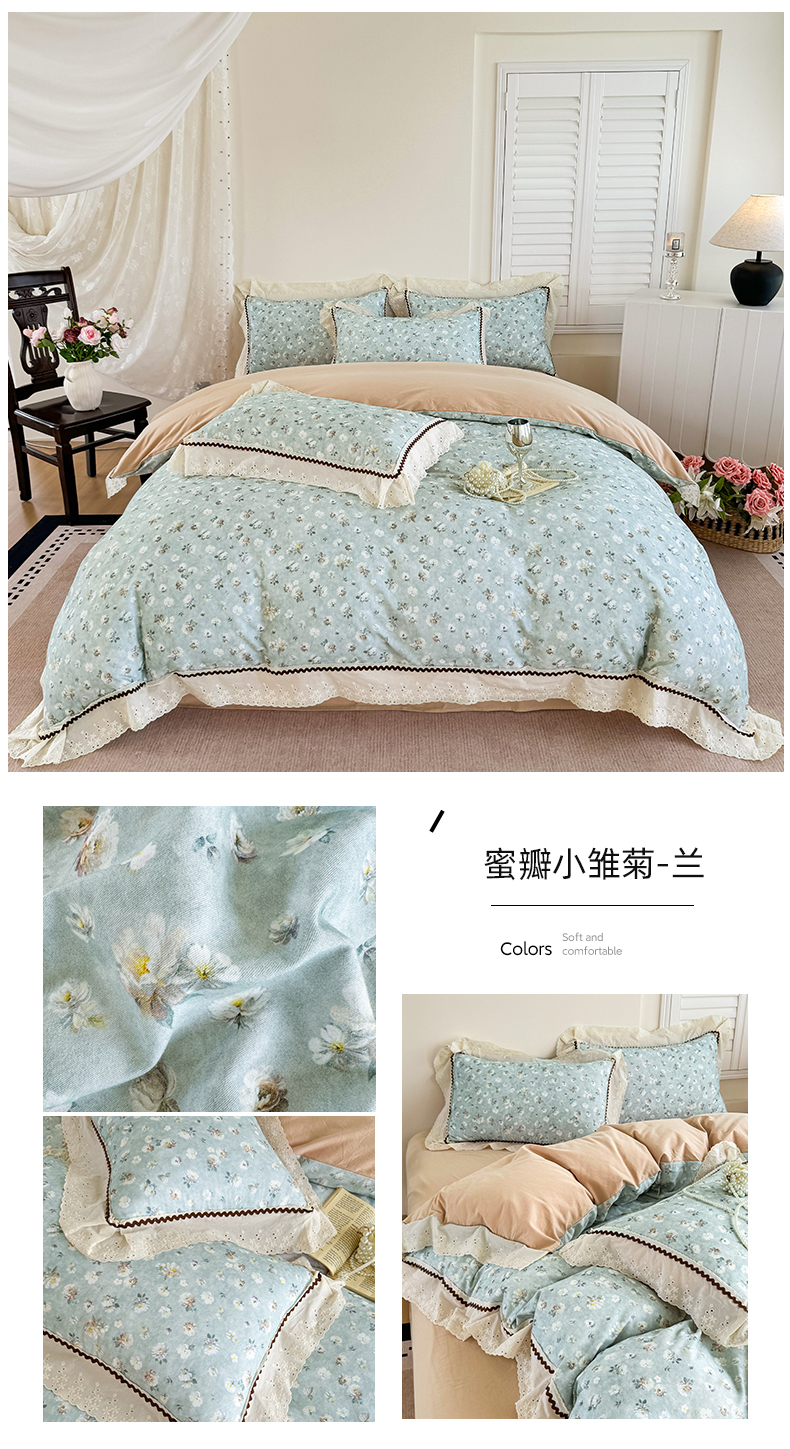 商品名称:星座家纺 2025新款秋冬全棉花边数码印花磨毛四件套 蜜瓣小雏菊-兰
