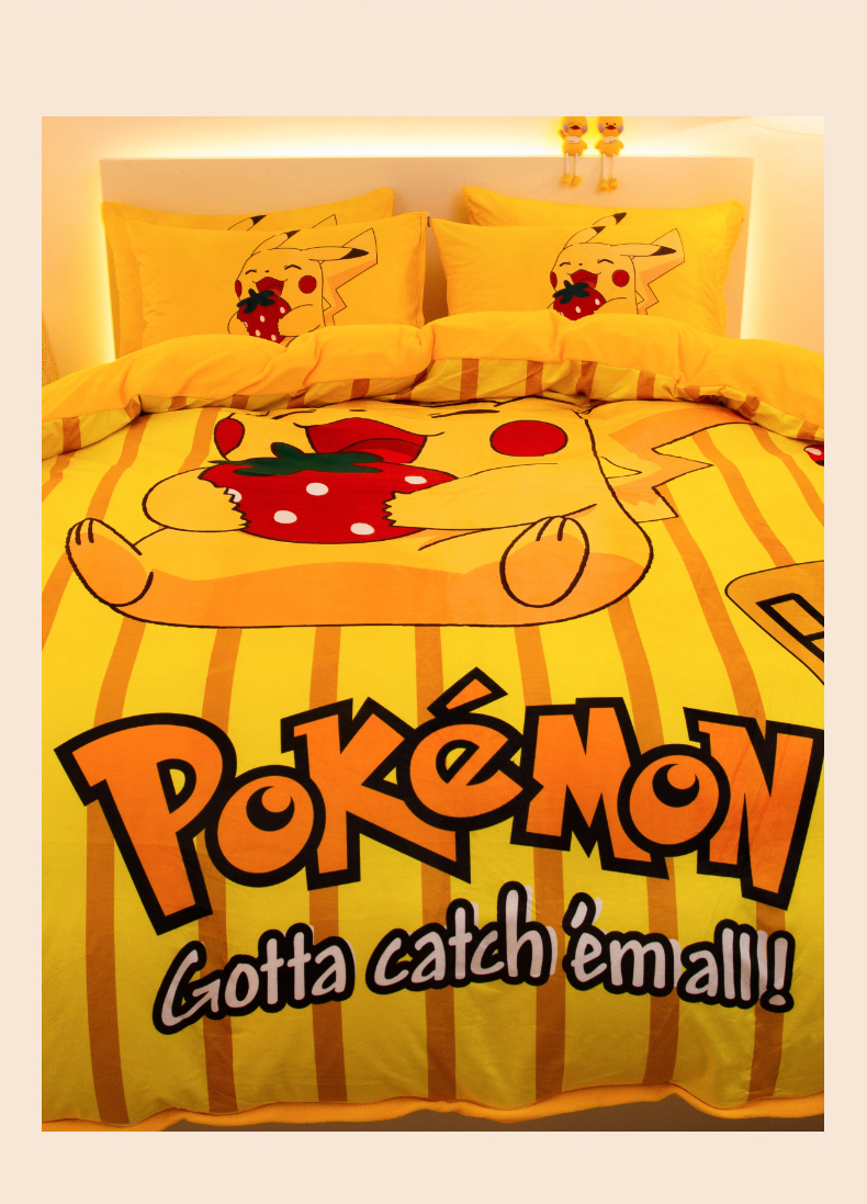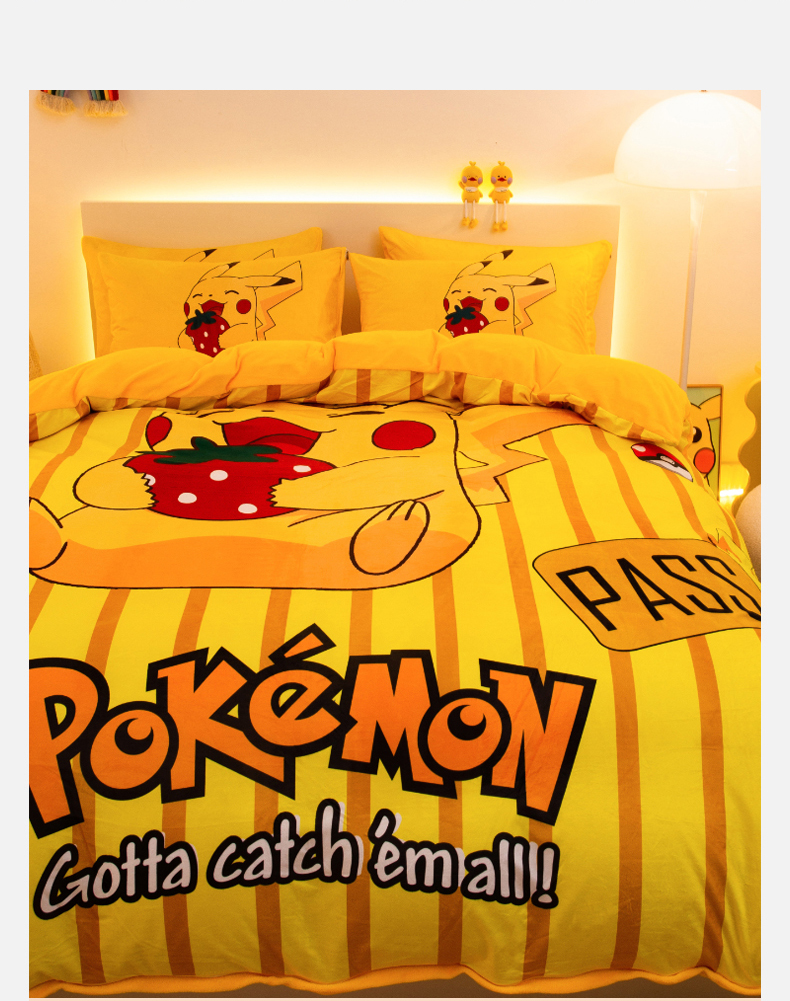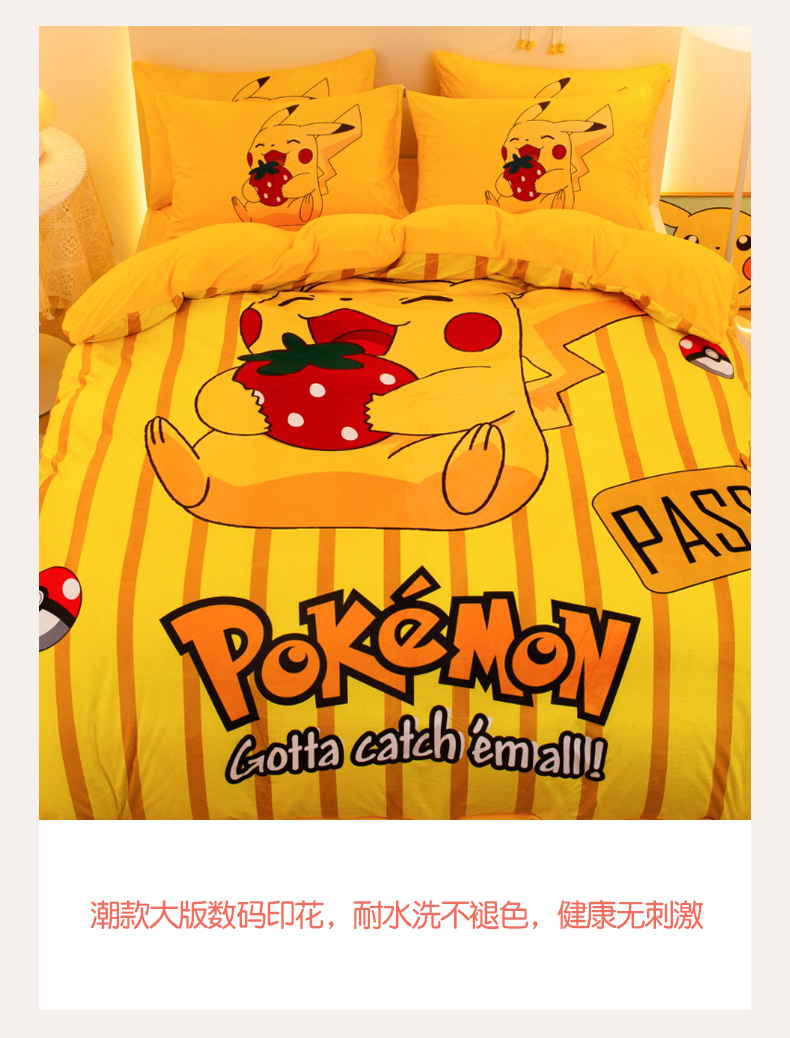 商品名称:一电 2025外贸跨境电商儿童卡通床上四件套亲肤牛奶绒学生三件床单被套加大珊瑚宝宝卡通 草莓皮卡丘