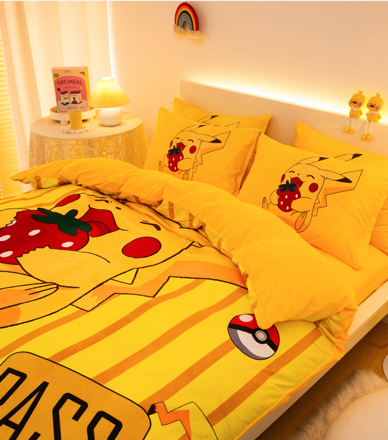 一电 2025外贸跨境电商儿童卡通床上四件套亲肤牛奶绒学生三件床单被套加大珊瑚宝宝卡通 草莓皮卡丘