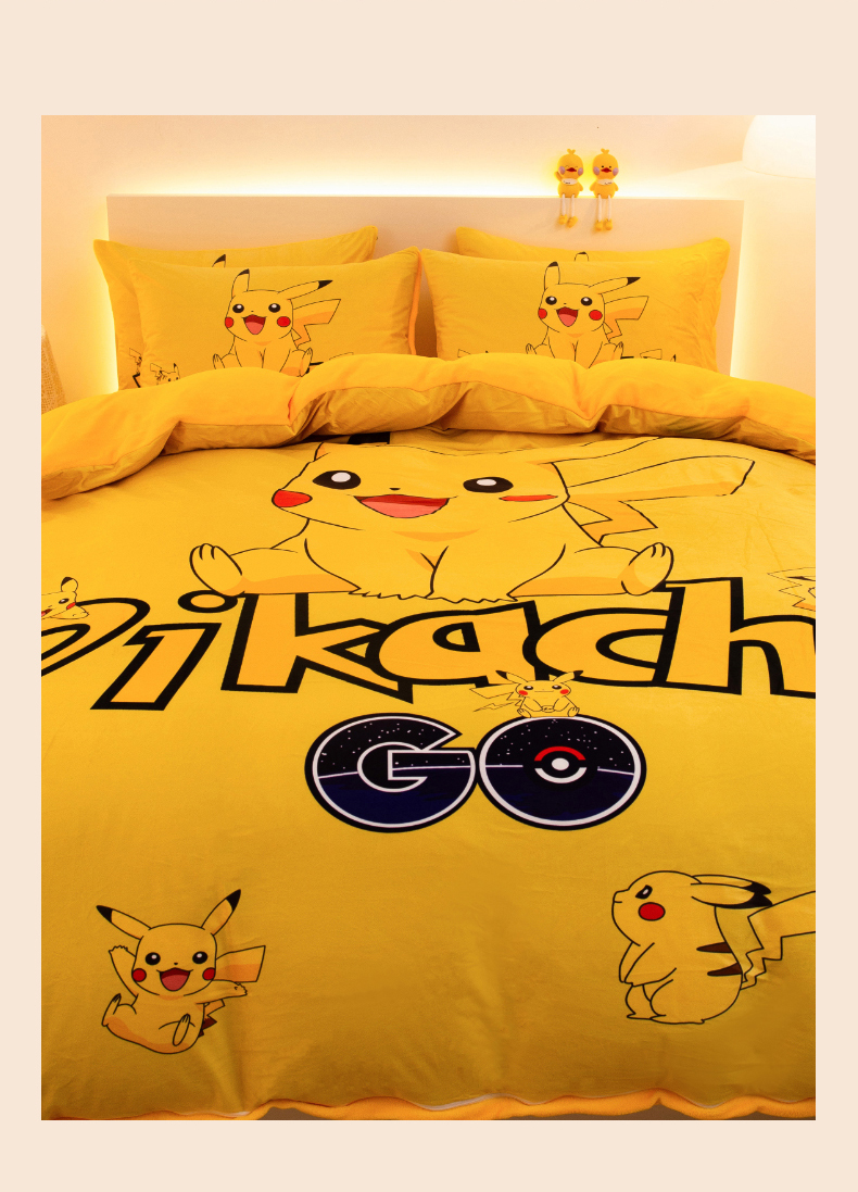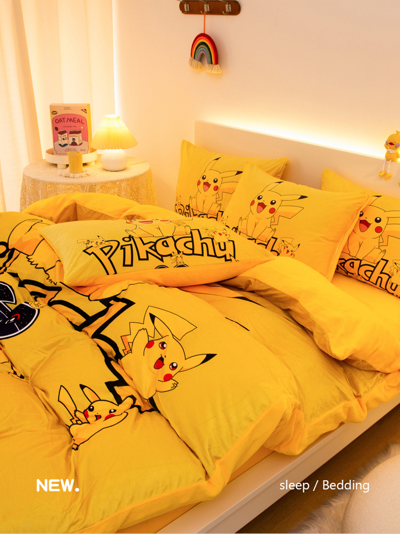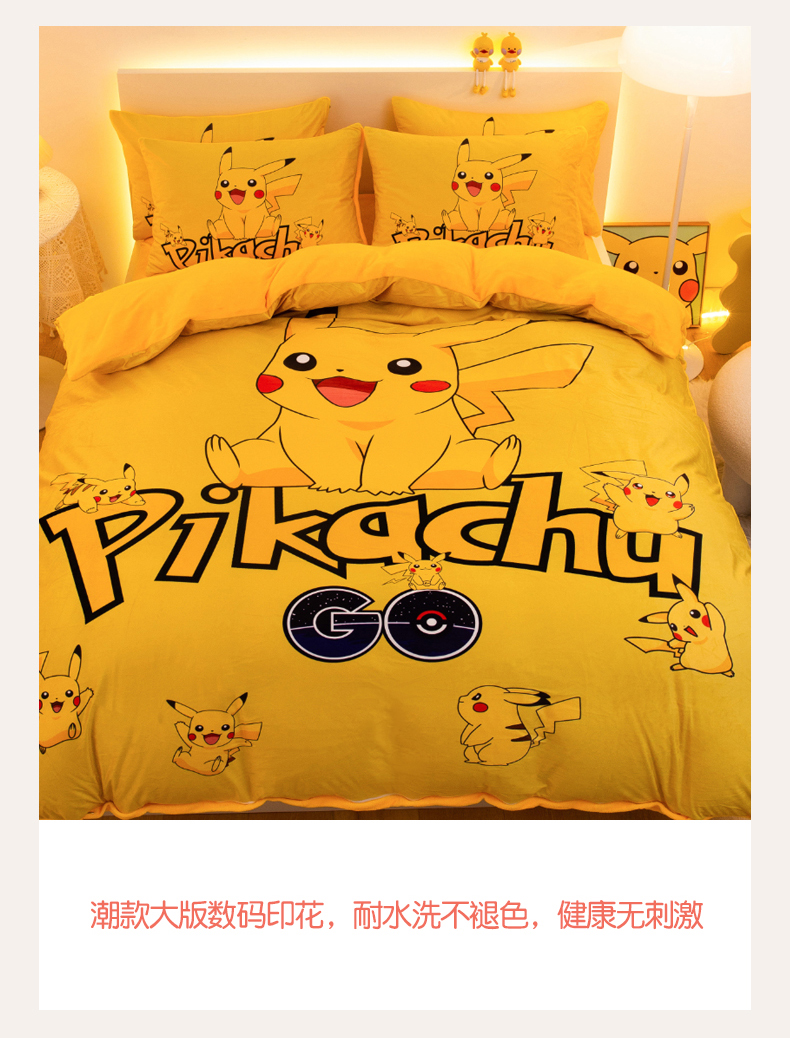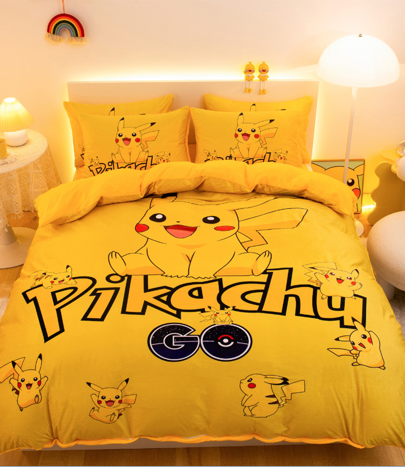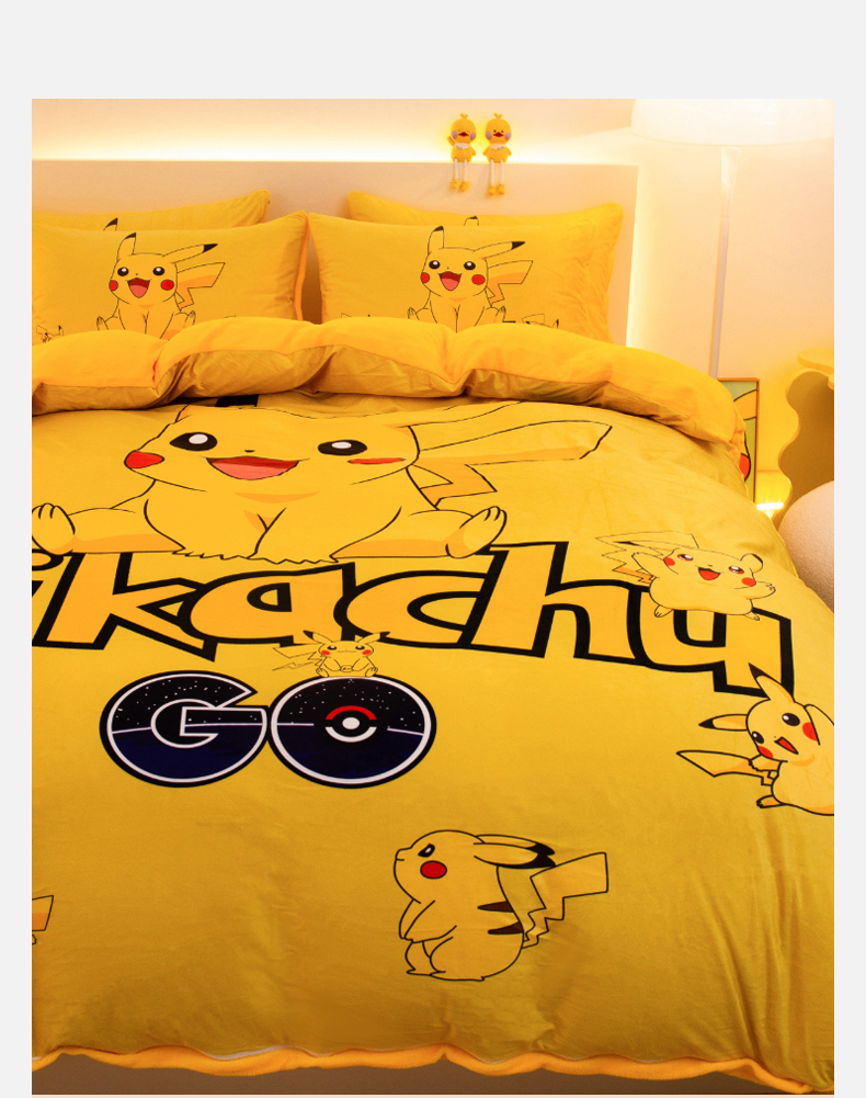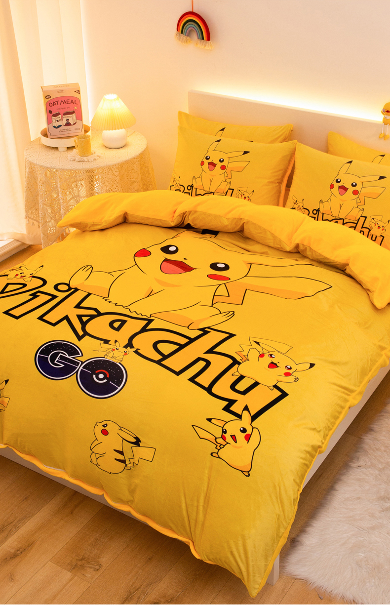 一电 2025外贸跨境电商儿童卡通床上四件套亲肤牛奶绒学生三件床单被套加大珊瑚宝宝卡通 皮卡丘家族