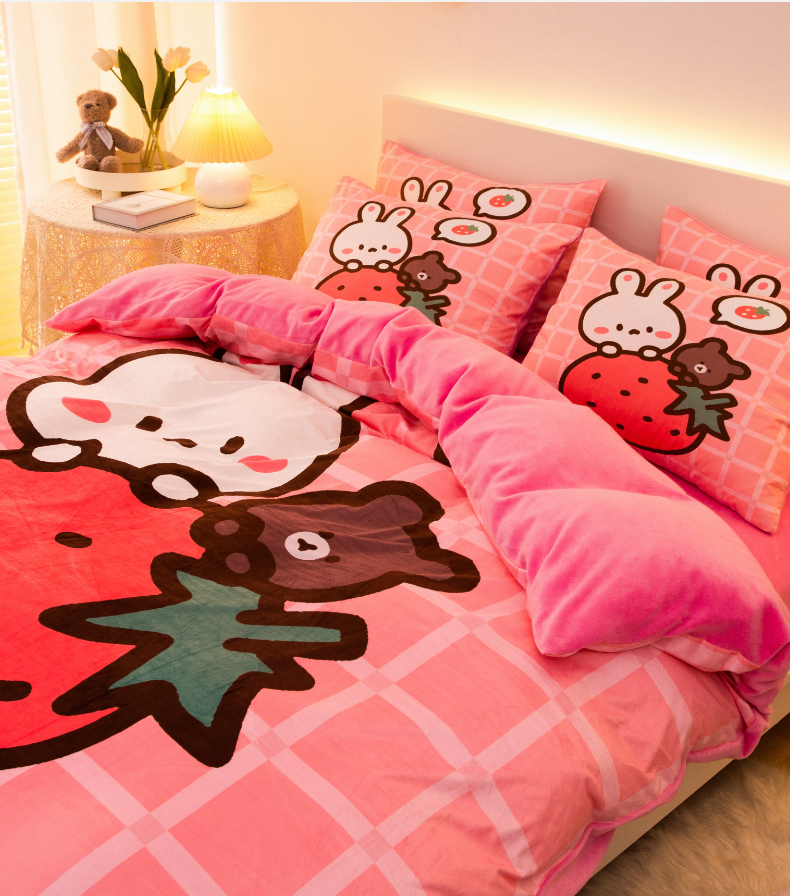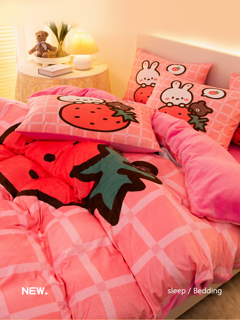 一电 2025外贸跨境电商儿童卡通床上四件套亲肤牛奶绒学生三件床单被套加大珊瑚宝宝卡通单被套 草莓动物