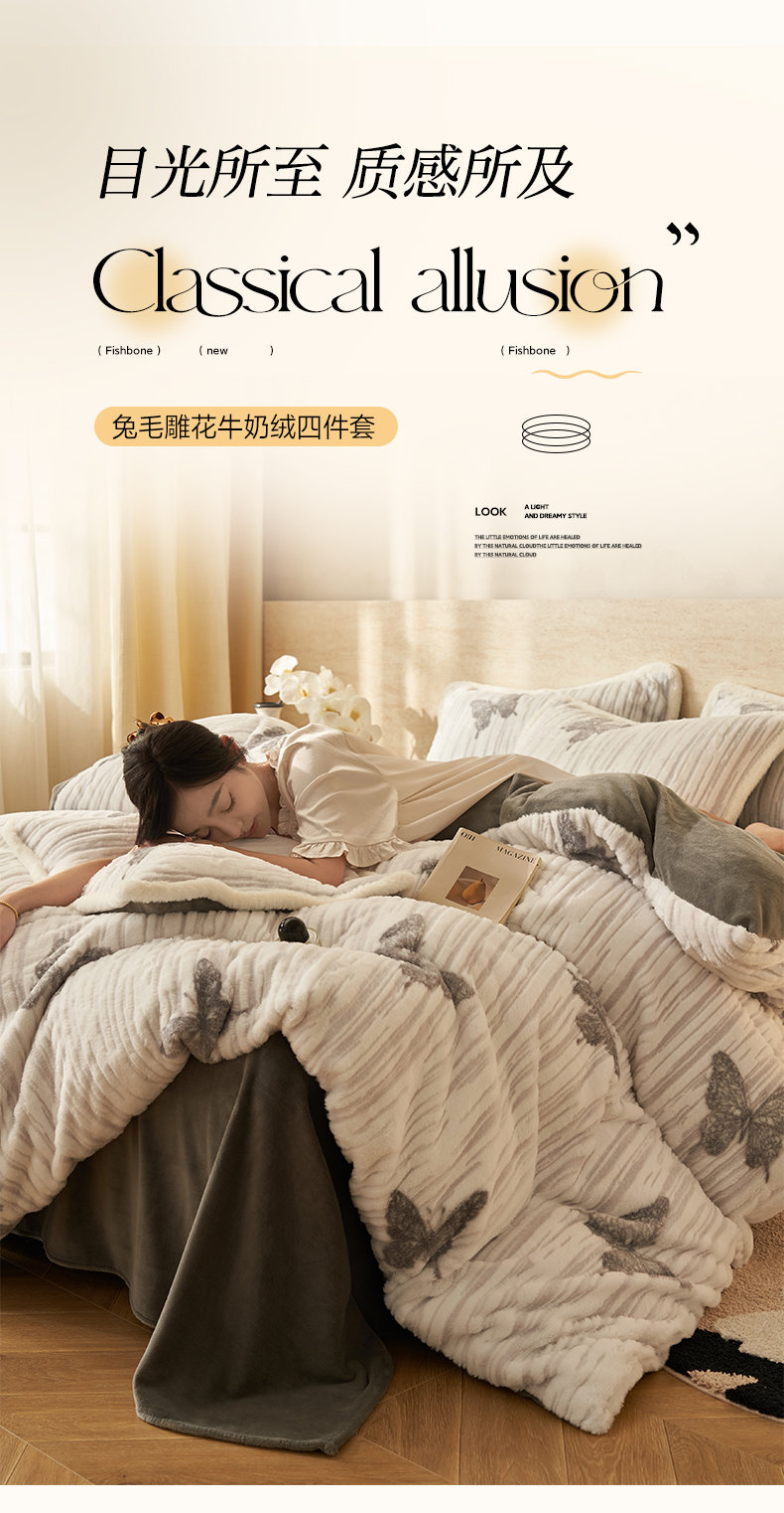 当前位置: 91家纺网 > 商品网购 > 床品套件 > 四件套 > 雕花绒四件套 > 寐绸家纺 2025秋冬新款350g兔毛雕花牛奶绒四件套 花语