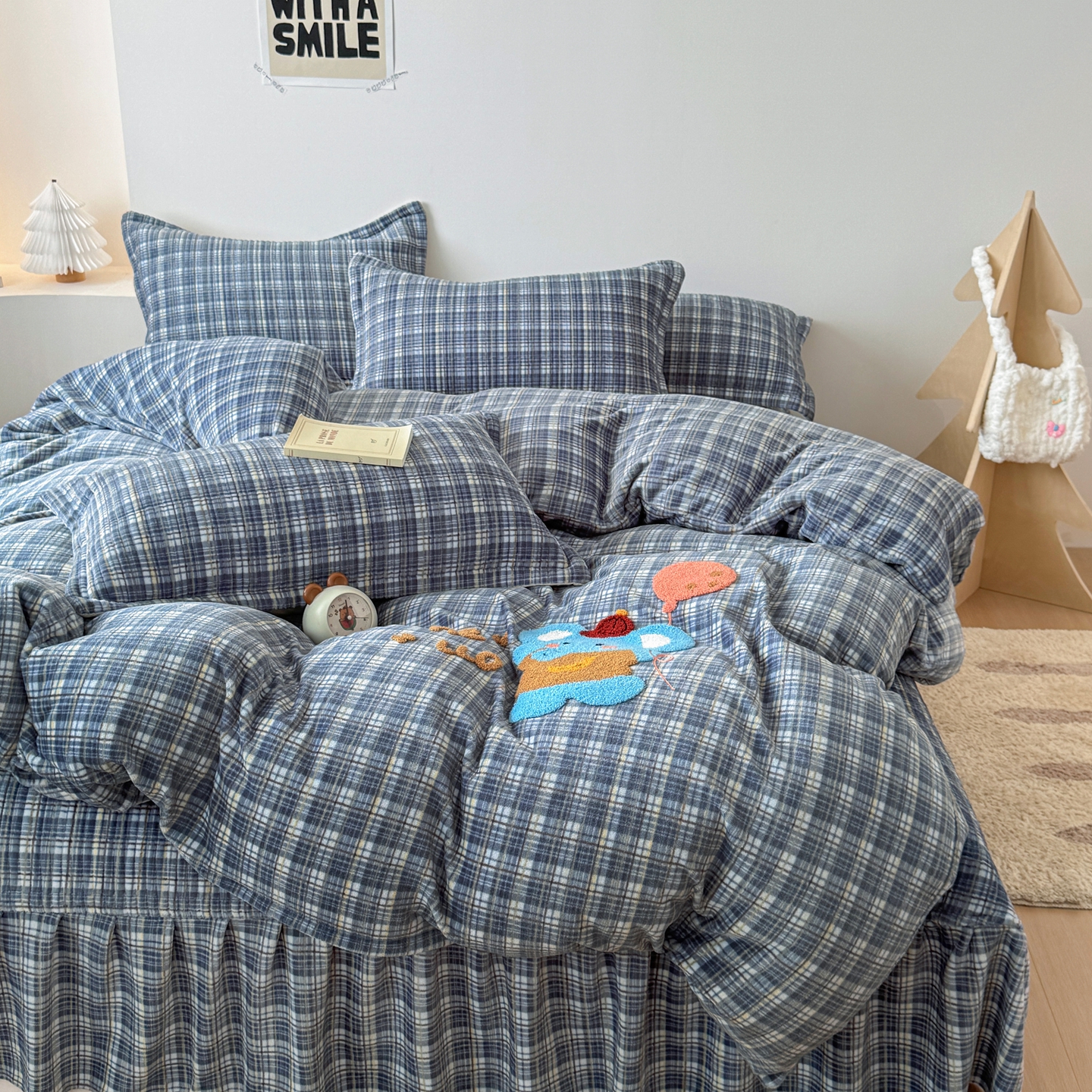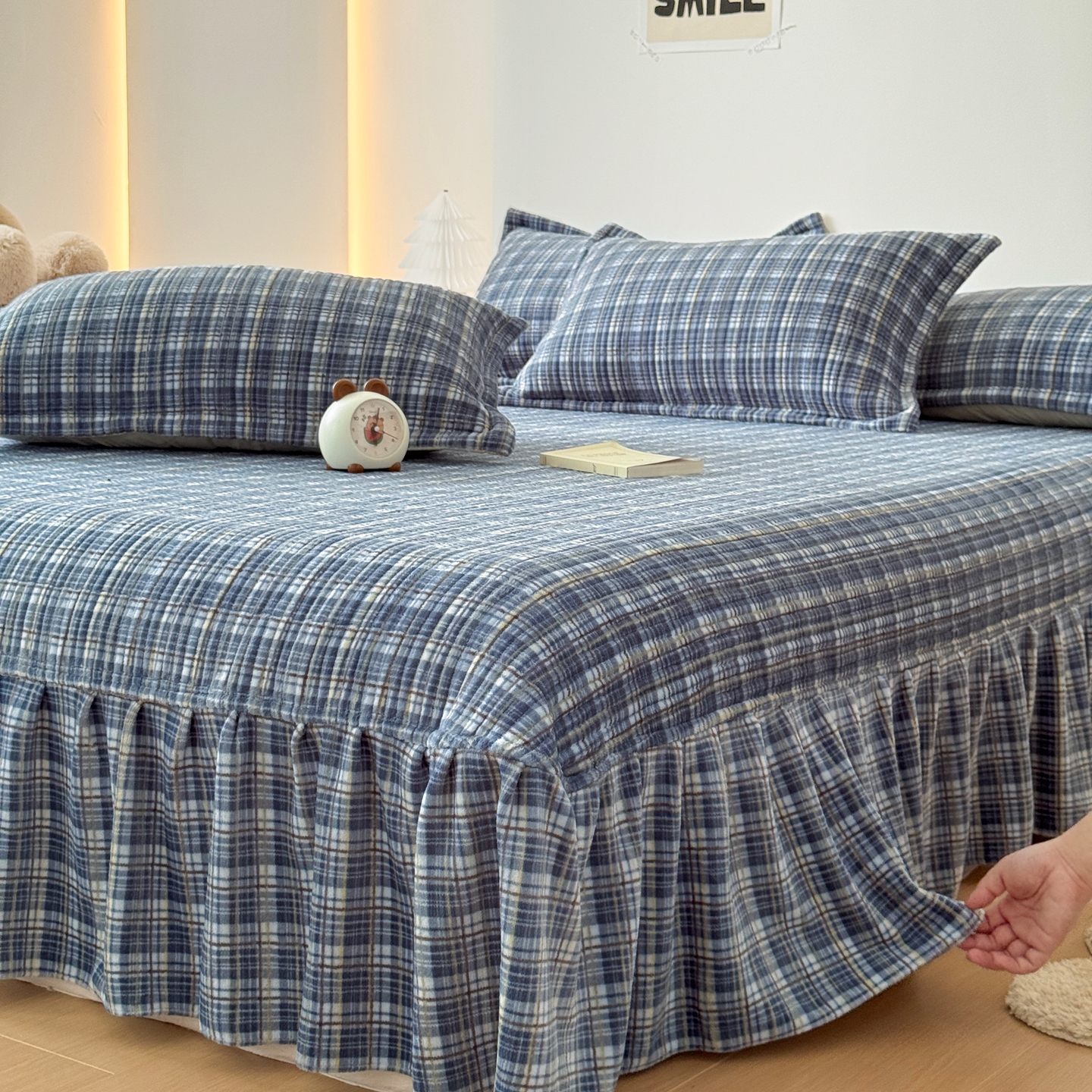 (总)希朵家纺 2025新款木棉皱皱纱活套多功能床盖夏被四件套,红格,蓝格,绿咖格,紫格