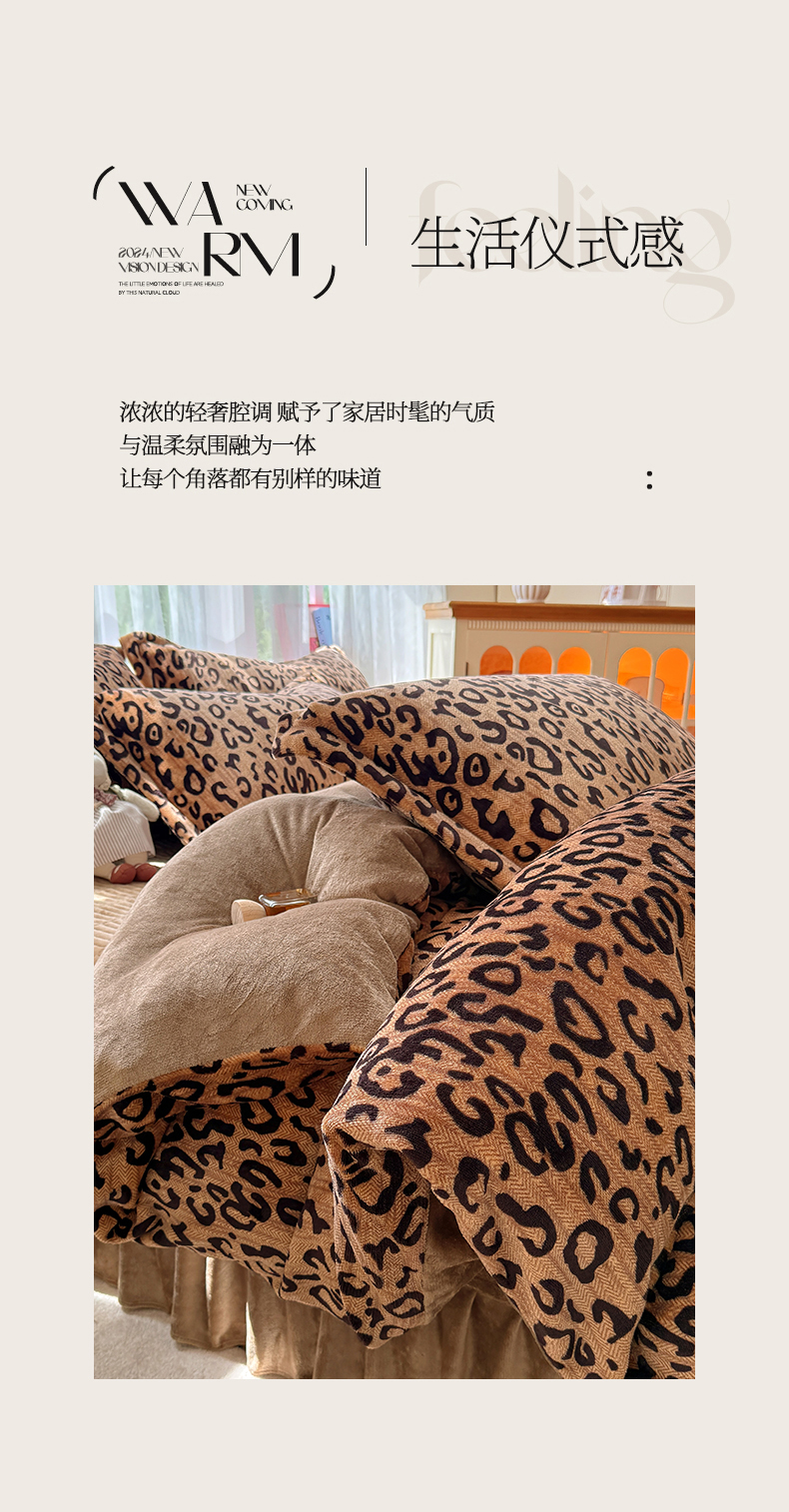 当前位置: 91家纺网 > 商品网购 > 床品套件 > 四件套 > 牛奶绒四件套 > 梵克保罗 2025秋冬新款印花牛奶绒床盖炕垫炕盖四件套-云裳 云裳-经典豹纹