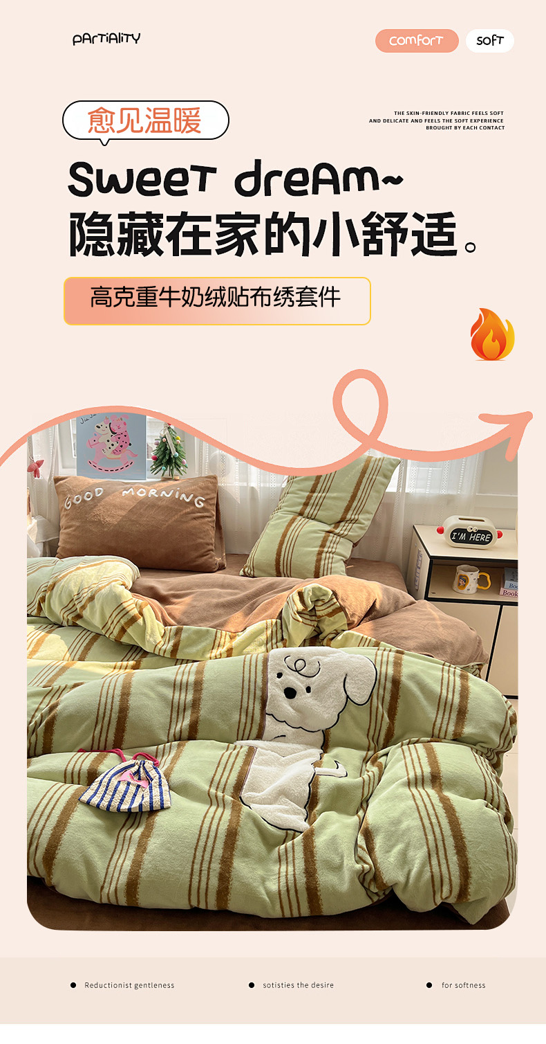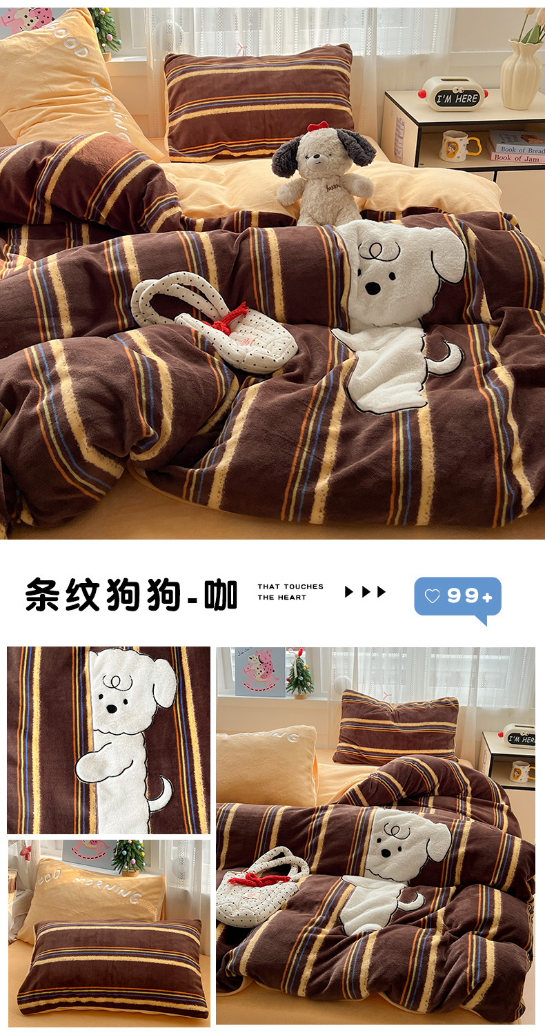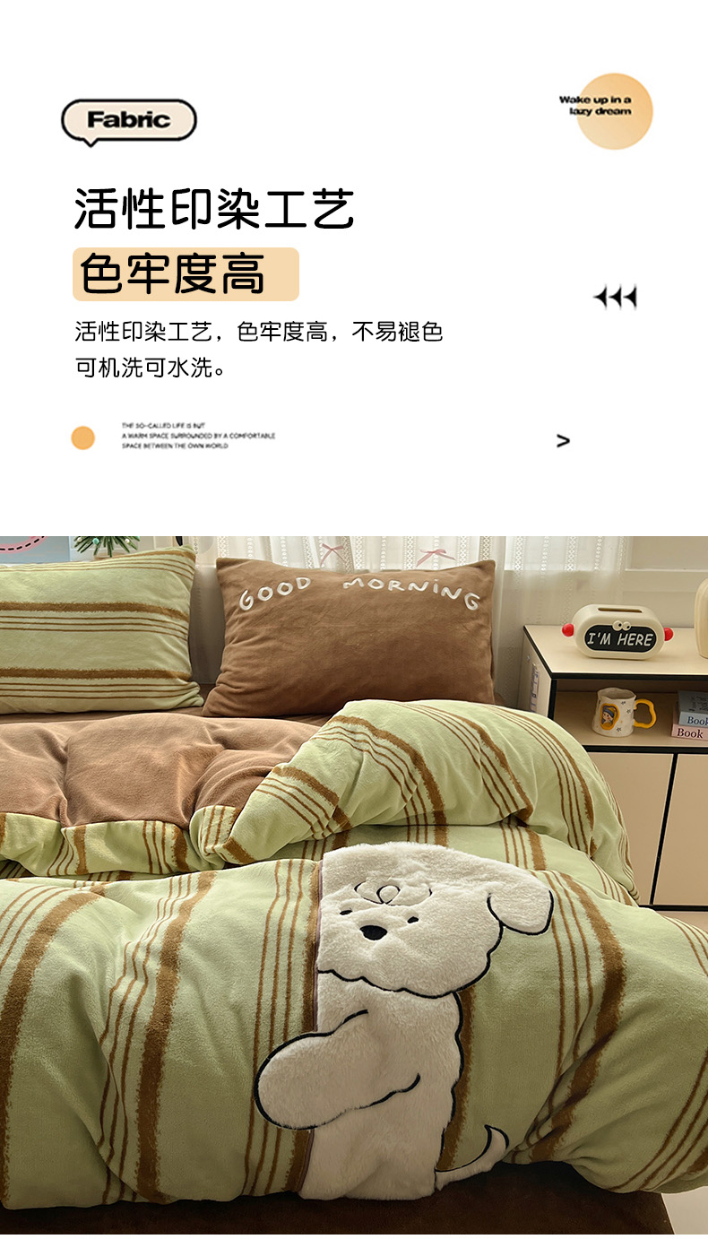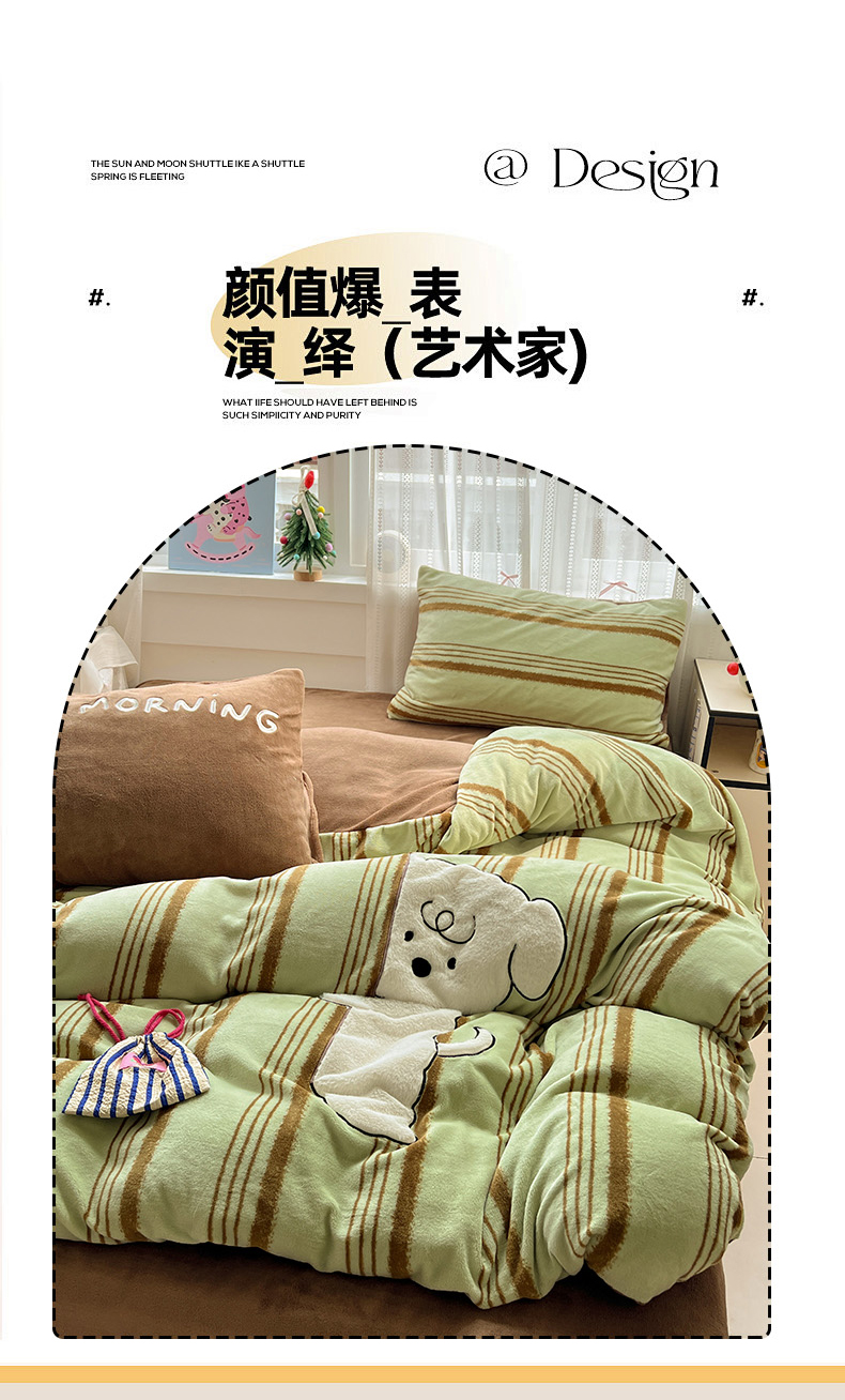 品乐家纺 2025秋冬新款高克重牛奶绒贴布绣四件套 条纹狗狗-绿
