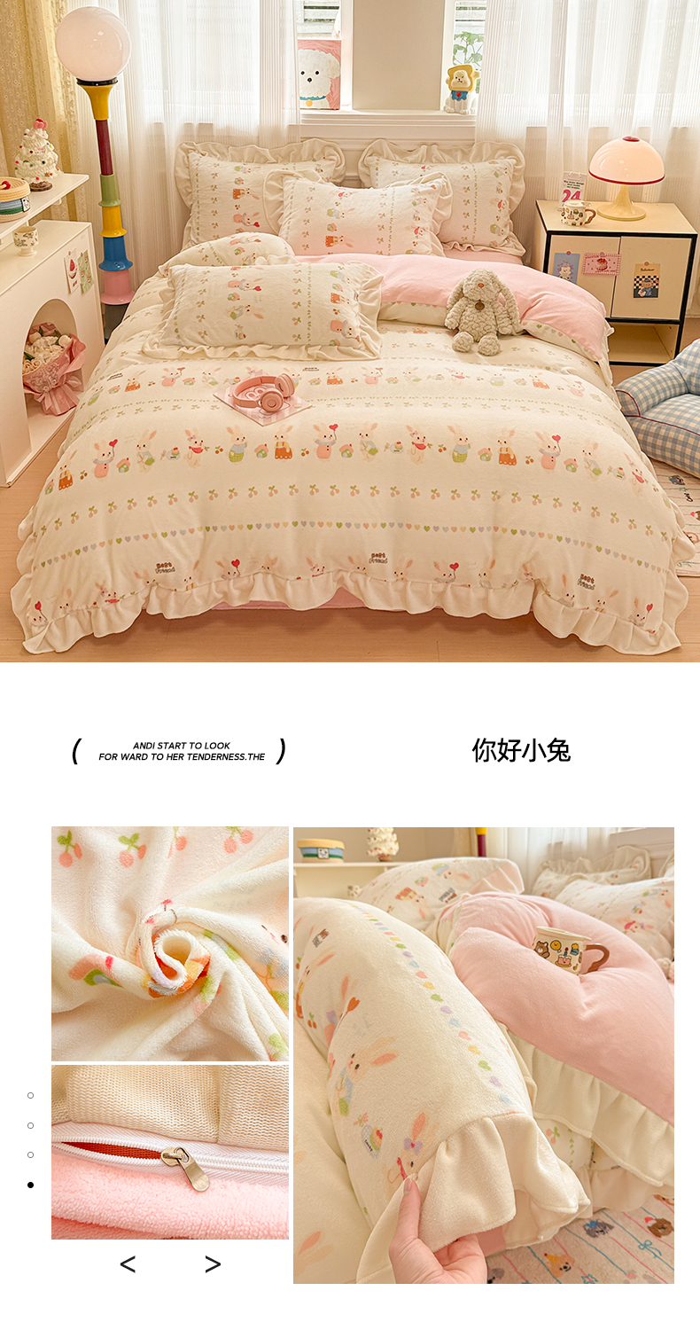 米莱家纺 2025新款牛奶绒印花花边四件套 你好小兔