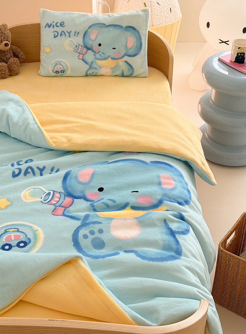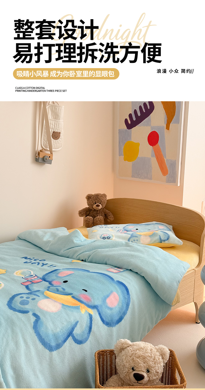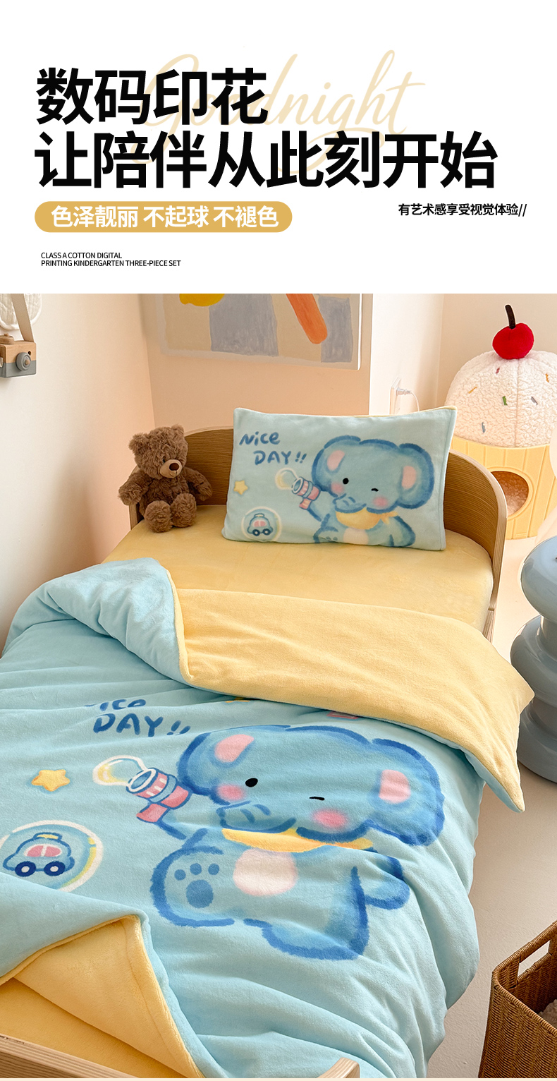 当前位置: 91家纺网 > 商品网购 > 床品套件 > 三件套 > 嗨生活 2025新款牛奶绒数码印花原创大版卡通幼儿园套件幼儿园三件套 快乐小象
