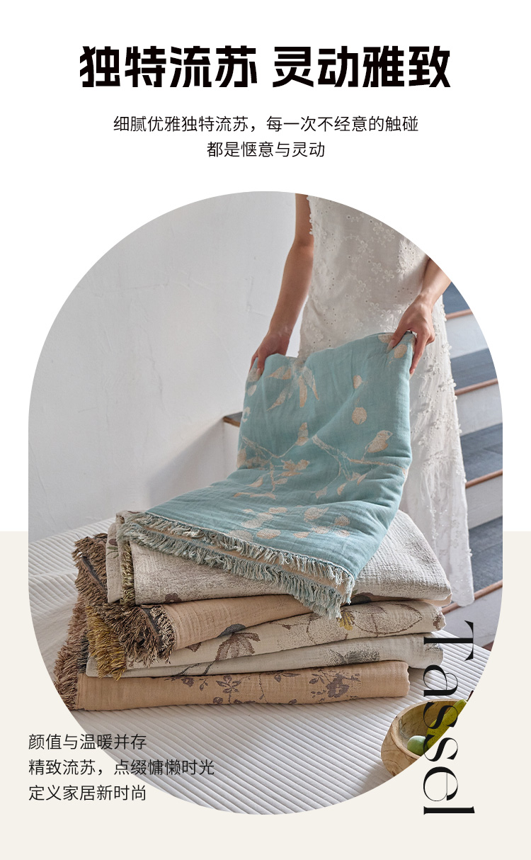 商品名称:沐瑟家纺 2025新款四层纱布全棉流苏毯子纱布床盖毛巾被纯棉棉纱夏凉被午睡盖毯 椛湉-咖色
