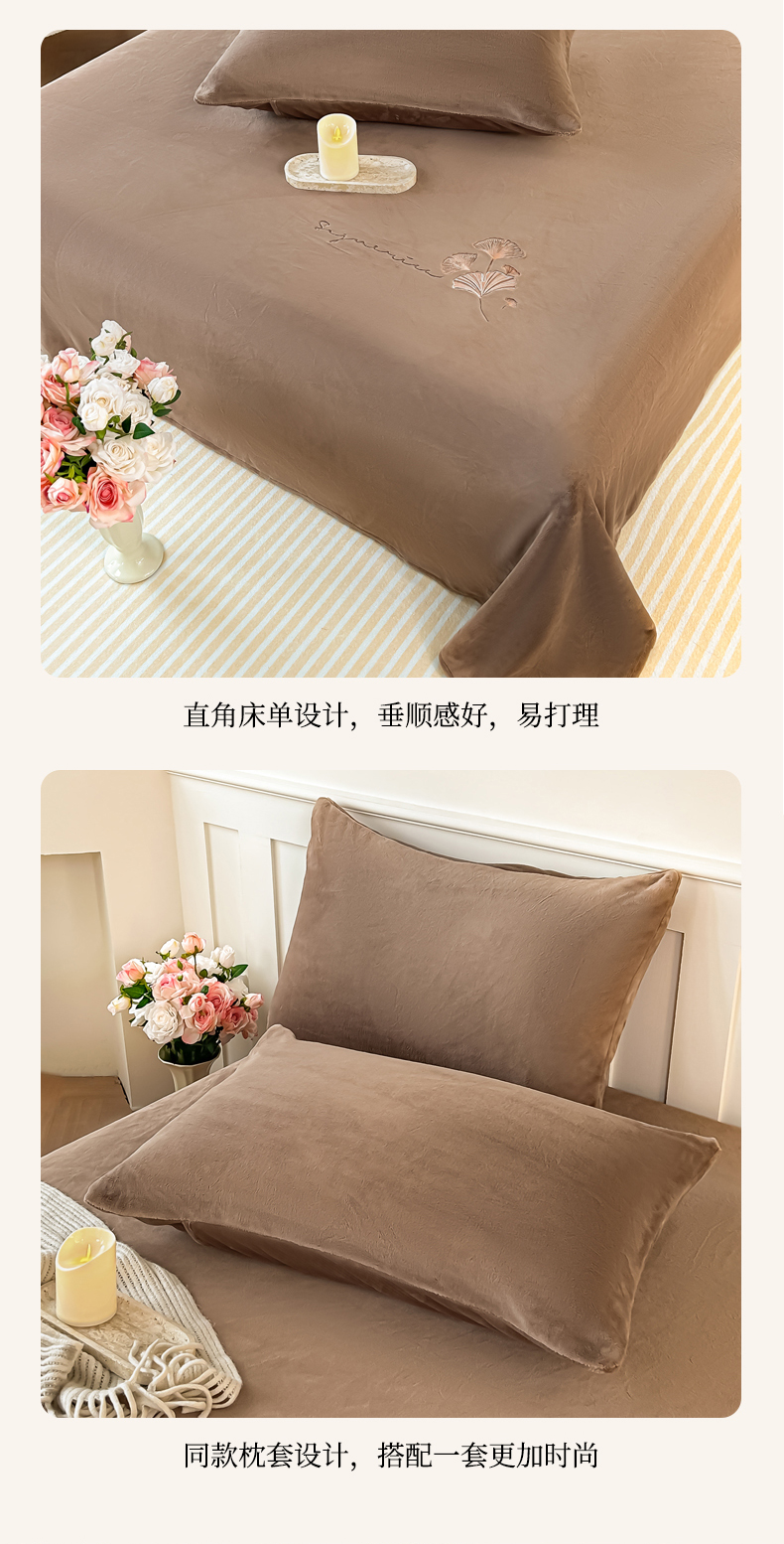 商品名称:卓缦家纺 2025新款秋冬牛奶绒刺绣床单加厚三件套单品 摩卡棕