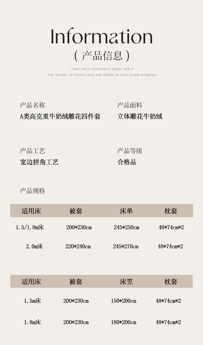 (总)米奈家居 2024新款A类牛奶雕花绒四件套-瑞丽,巴赫(卡其),巴赫(紫粉),花漾(淡雅粉),花漾(香槟),水墨(豆沙),水墨(卡其),邂逅(咖色),邂逅(绿色)