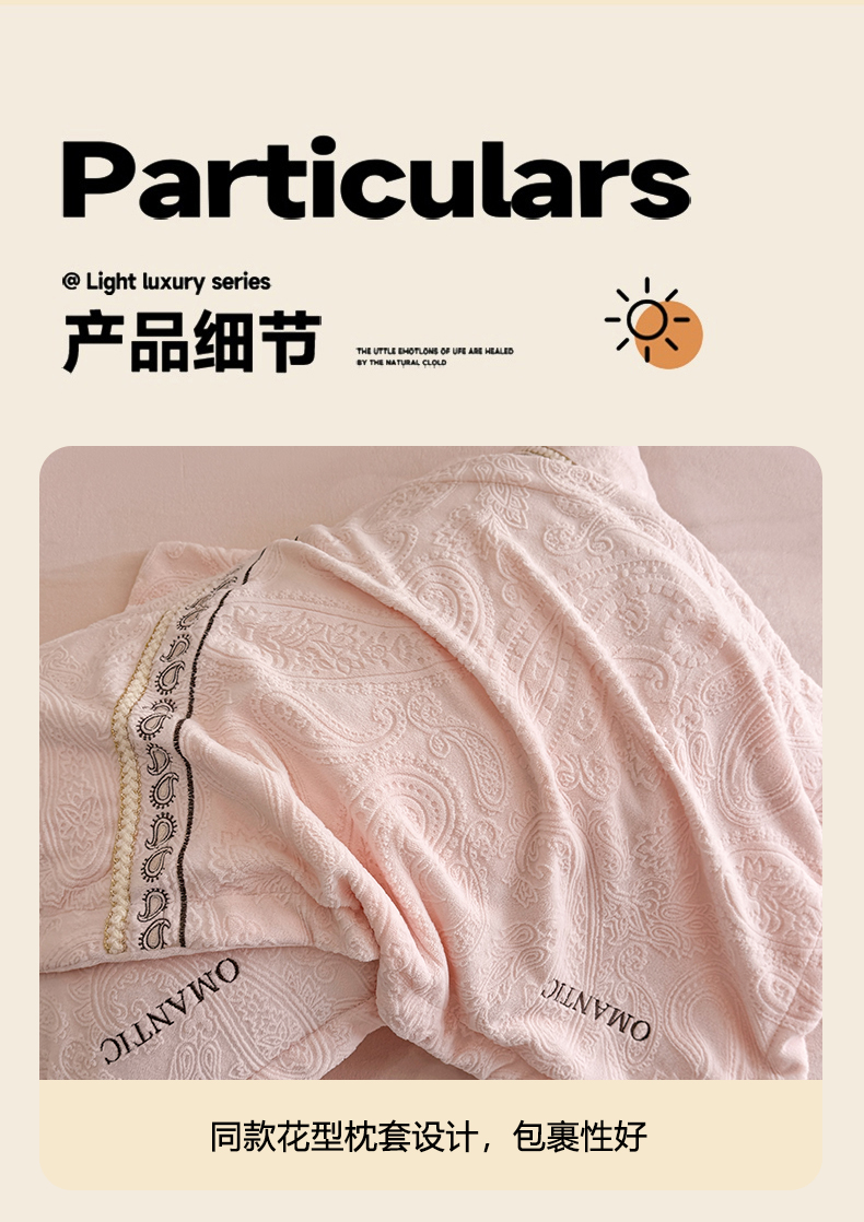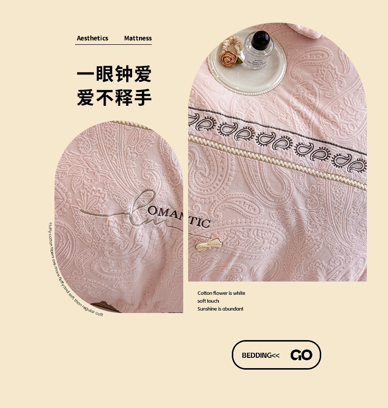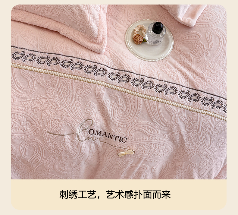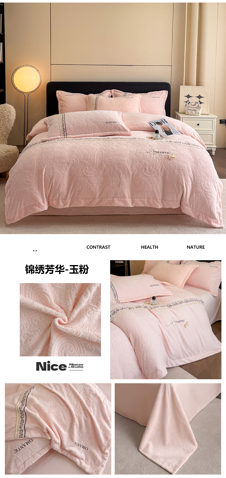 商品名称:慕木家纺 2025新款A类高克重高端雕花绒工艺款刺绣拼接四件套锦绣芳华系列(直播热款)提供买家秀 锦绣芳华-玉粉