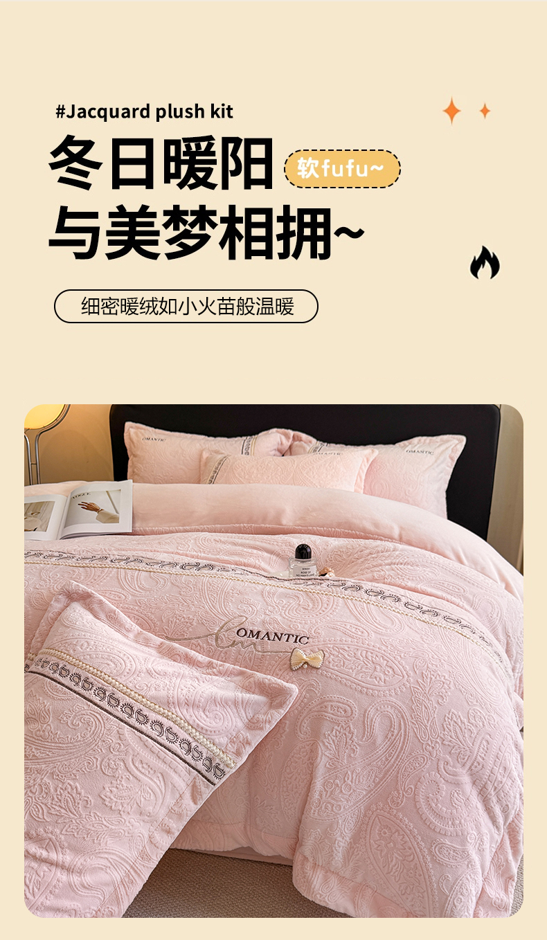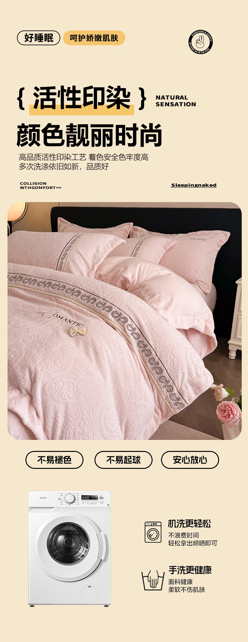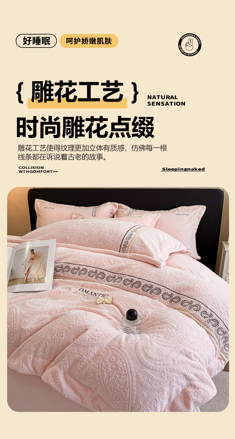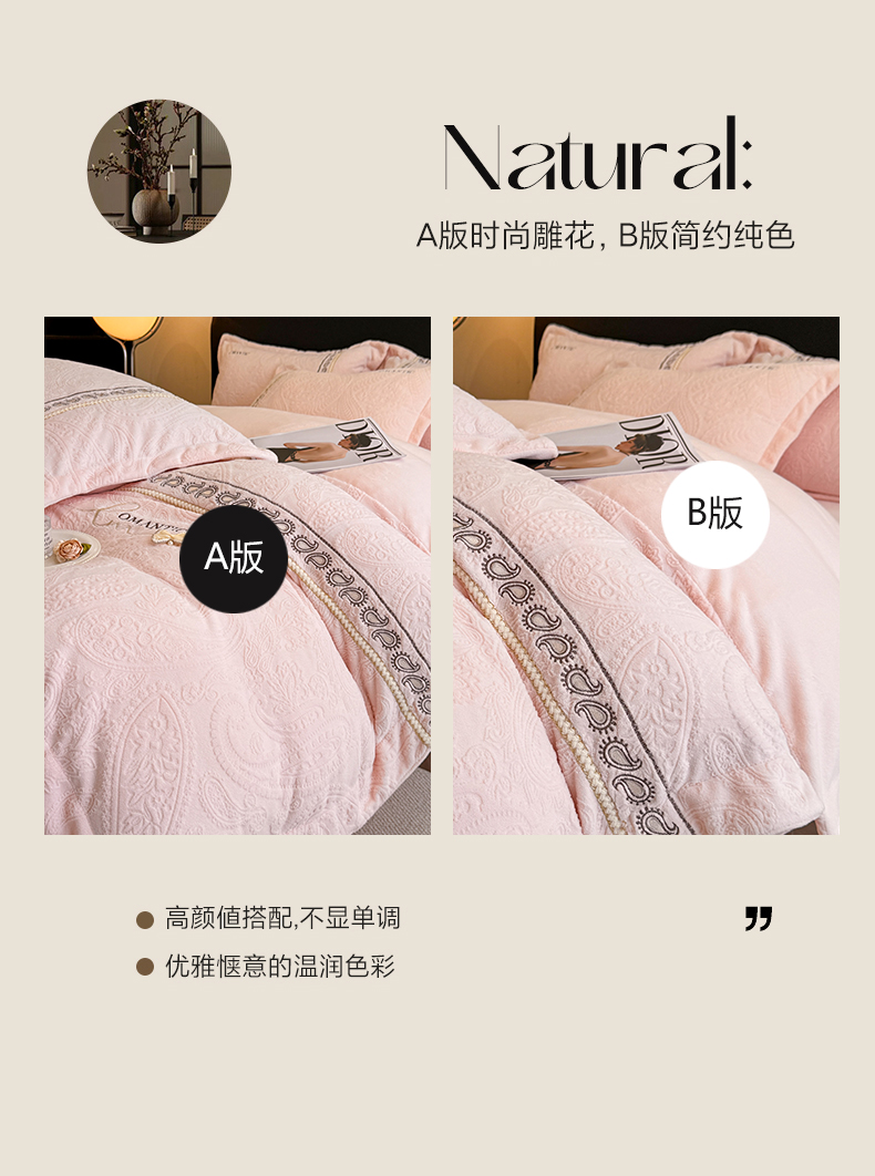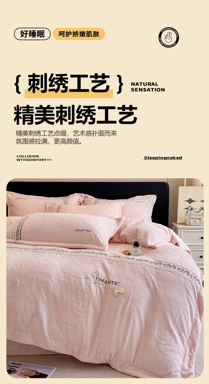 慕木家纺 2025新款A类高克重高端雕花绒工艺款刺绣拼接四件套锦绣芳华系列(直播热款)提供买家秀 锦绣芳华-玉粉