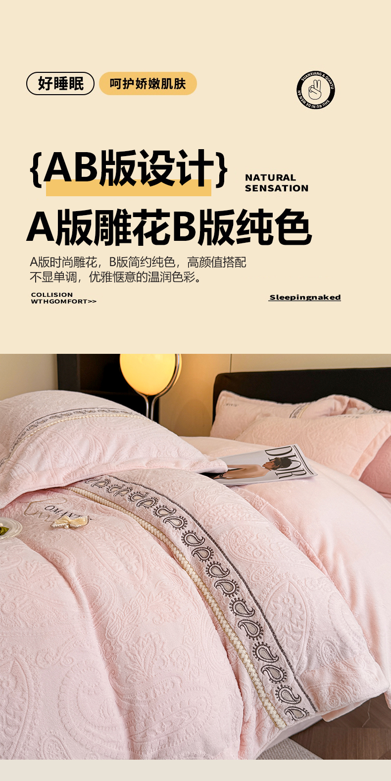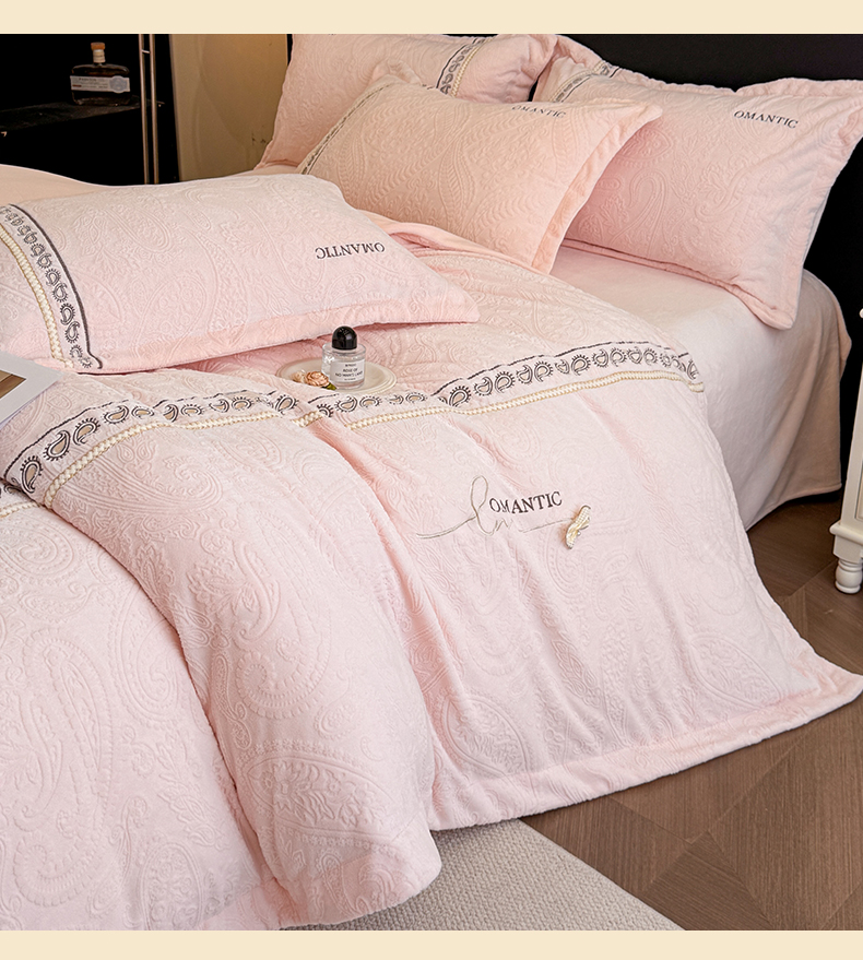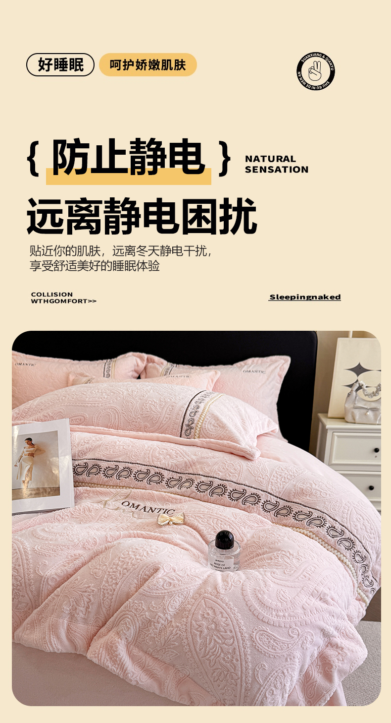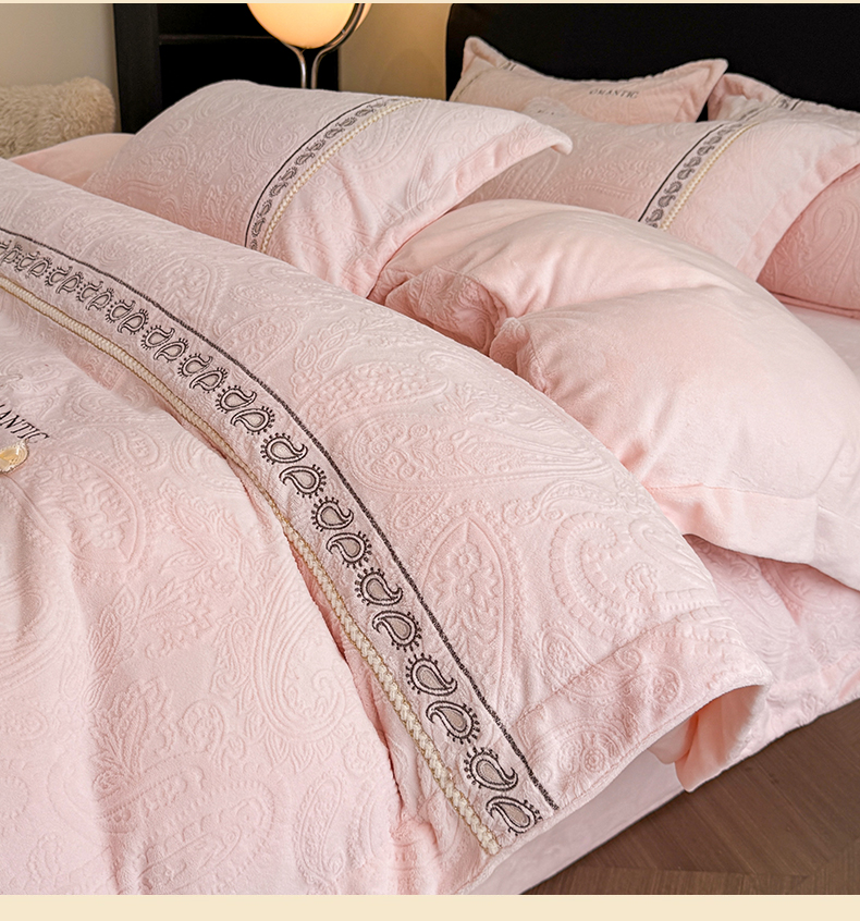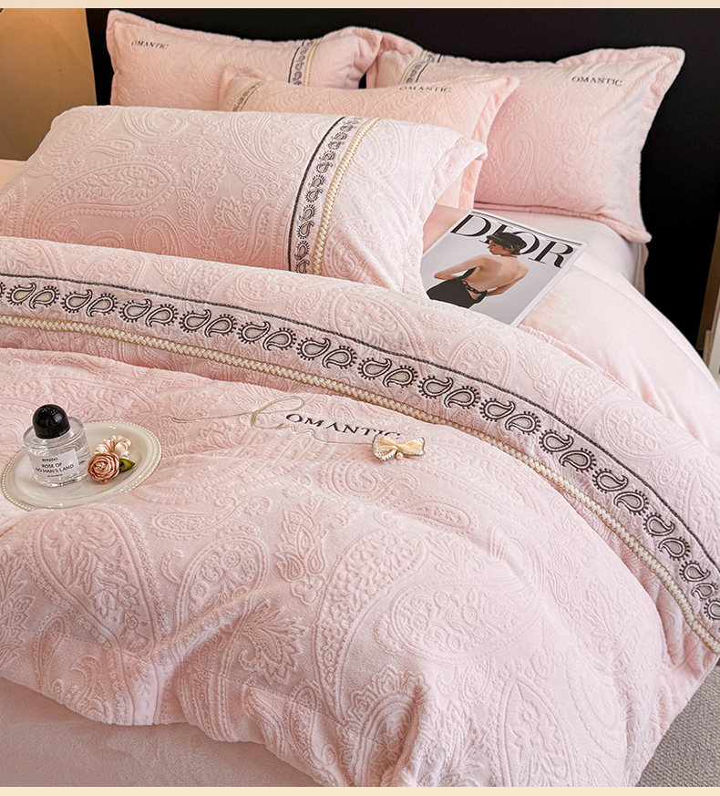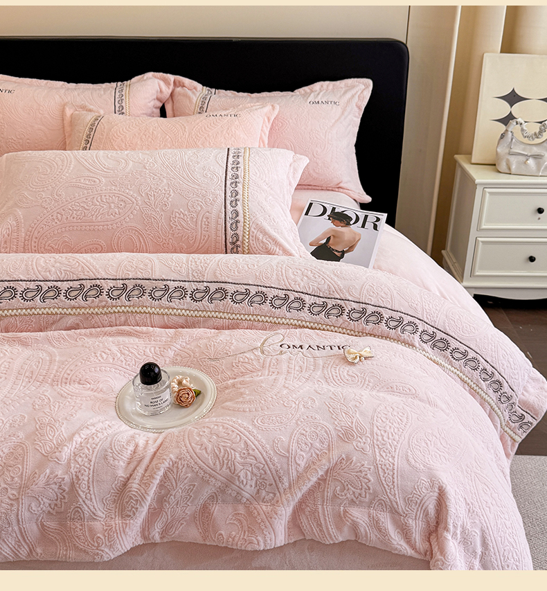 慕木家纺 2025新款A类高克重高端雕花绒工艺款刺绣拼接四件套锦绣芳华系列(直播热款)提供买家秀 锦绣芳华-玉粉