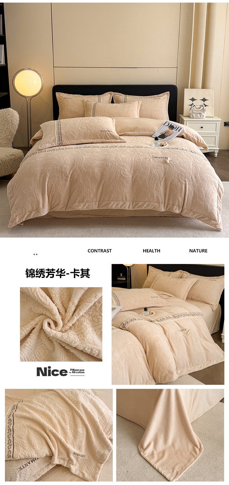 (总)慕木家纺 2025新款A类高克重高端雕花绒工艺款刺绣拼接四件套锦绣芳华系列(直播热款)提供买家秀,锦绣芳华-月岩灰,锦绣芳华-卡其,锦绣芳华-玉粉