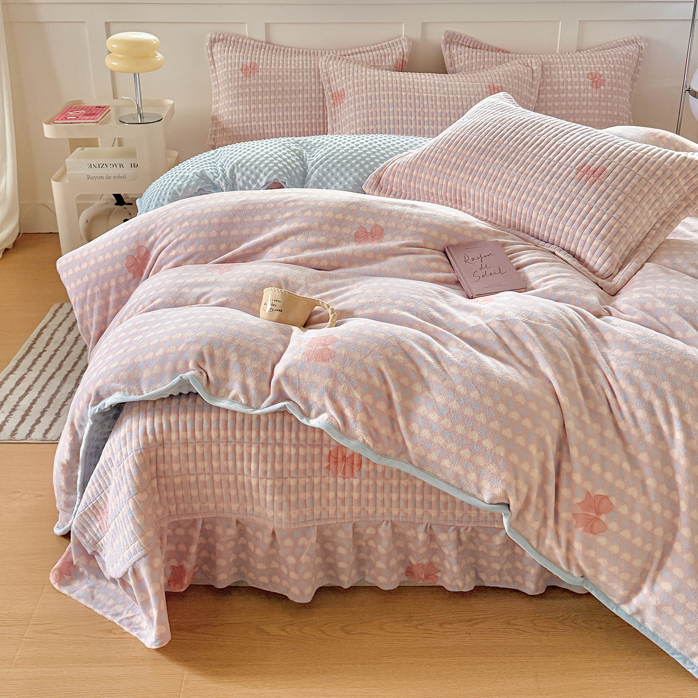 (总)欧尚 2025新款牛奶绒花边床盖四件套,粉点点,花小玉,咖色小心心,蓝点点,慕然,仙女粉,仙女紫