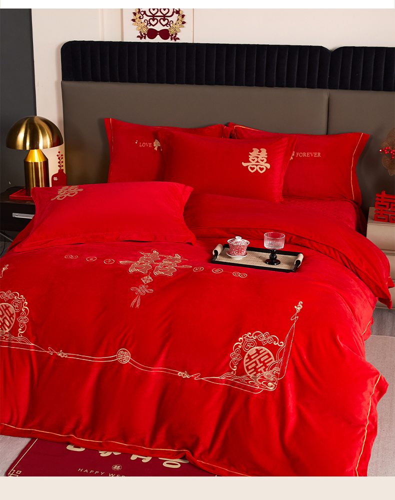 默忆 2025新款婴儿绒刺绣婚庆四件套 家家有喜
