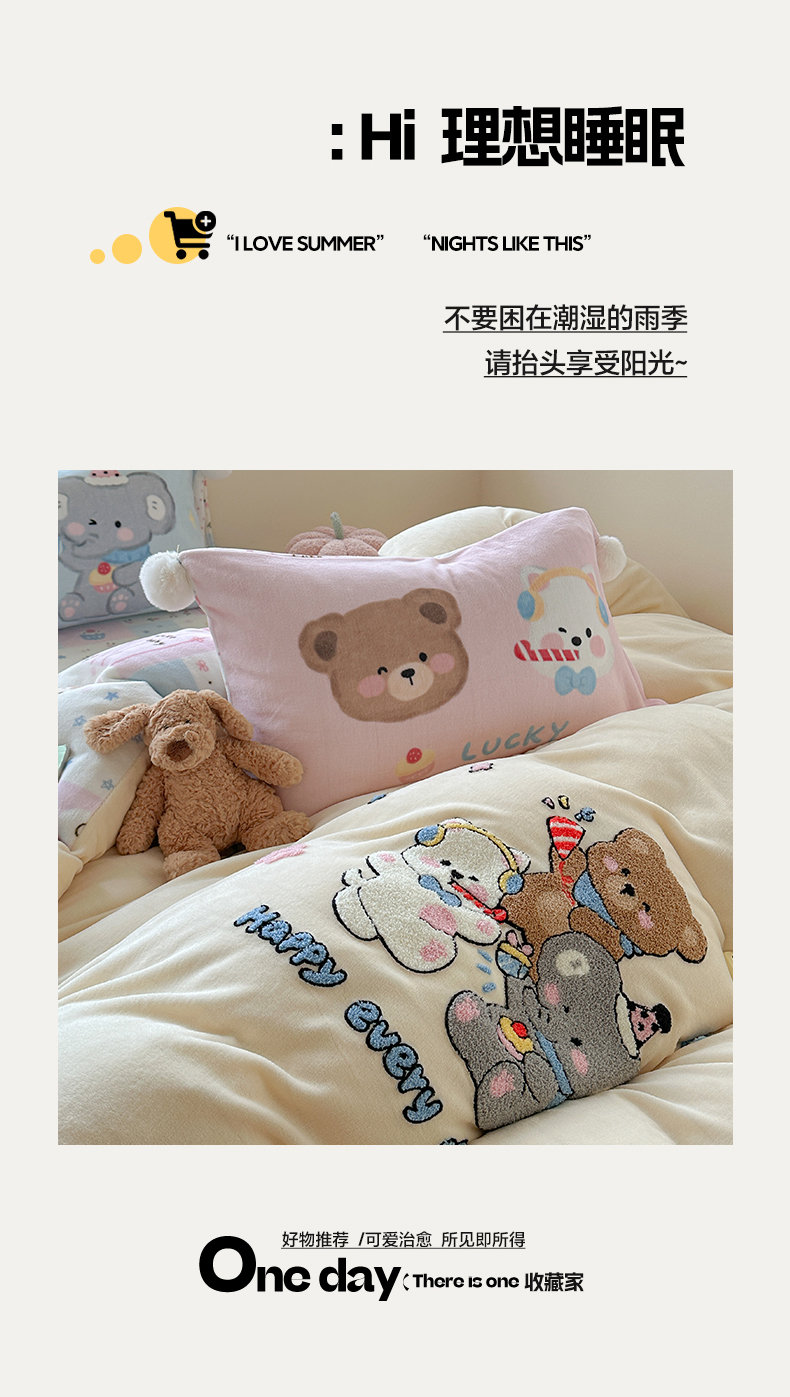 (总)眠屿家纺 2025新款加厚牛奶绒贴布绣四件套,棒球熊,动物朋友,欢乐音乐