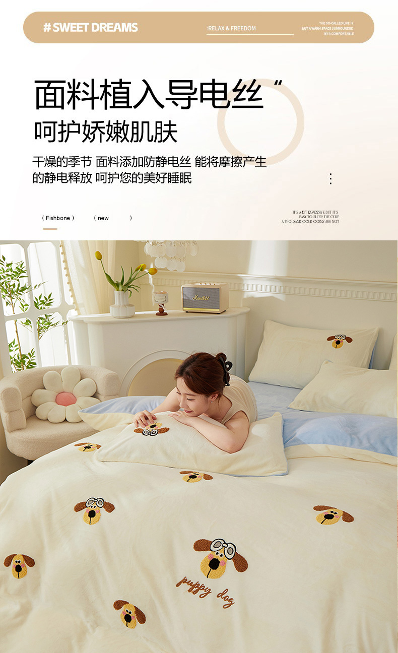 (总)楼兰公主毛毯专供 2025新款高克重230g牛奶绒数码印花毛巾绣卡通四件套,布拉拉,腊肠狗,奶油熊,淘气狗,小粉猫,小男孩,小苹果,小企鹅