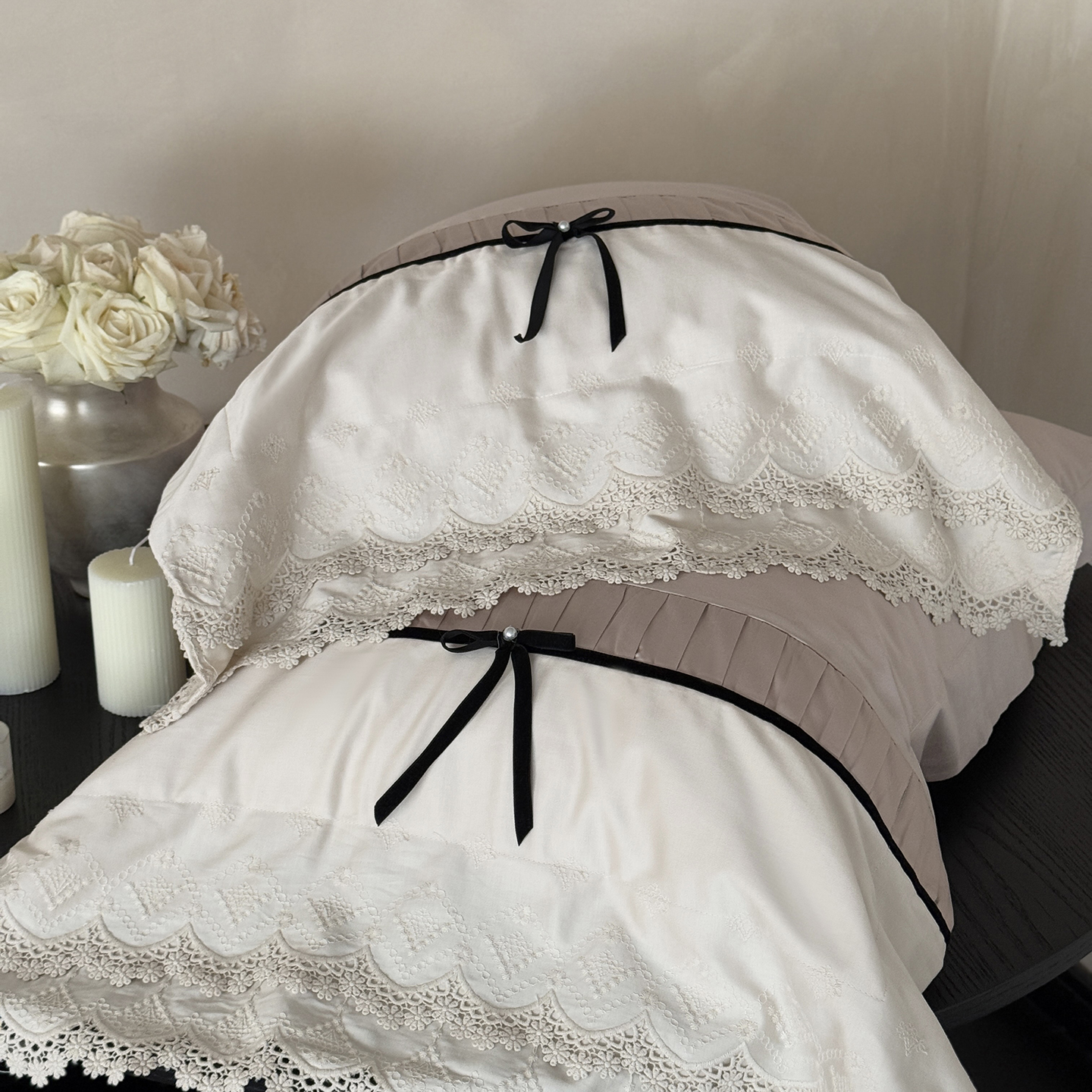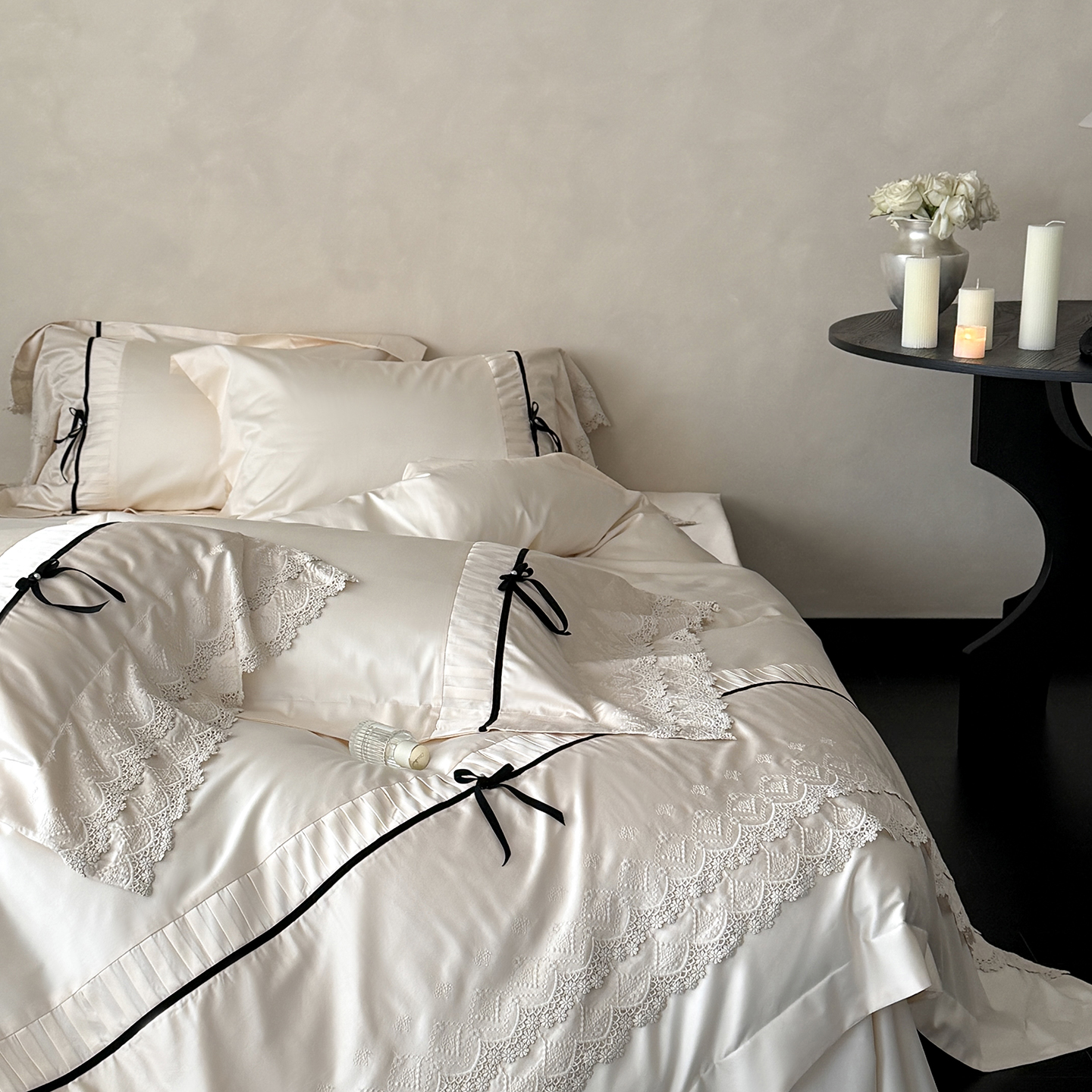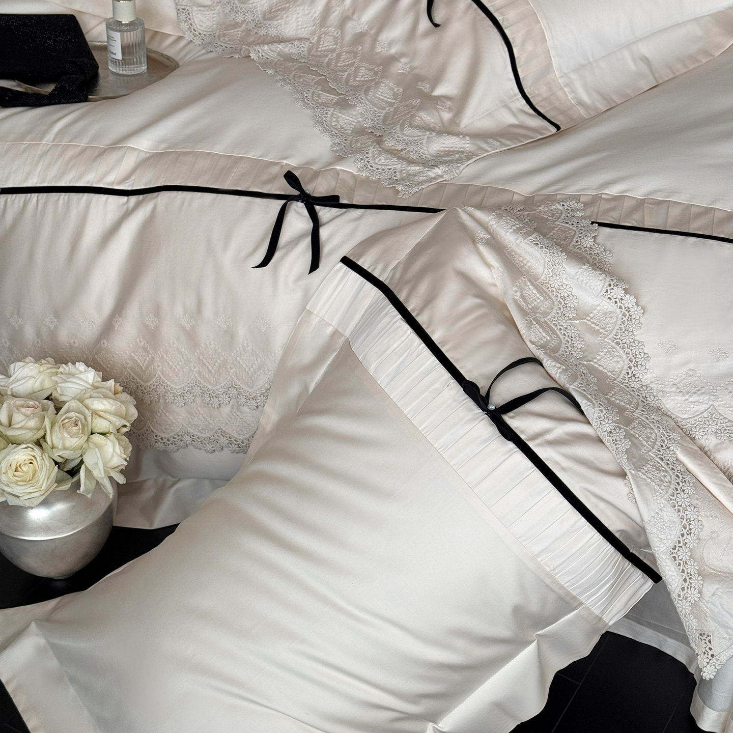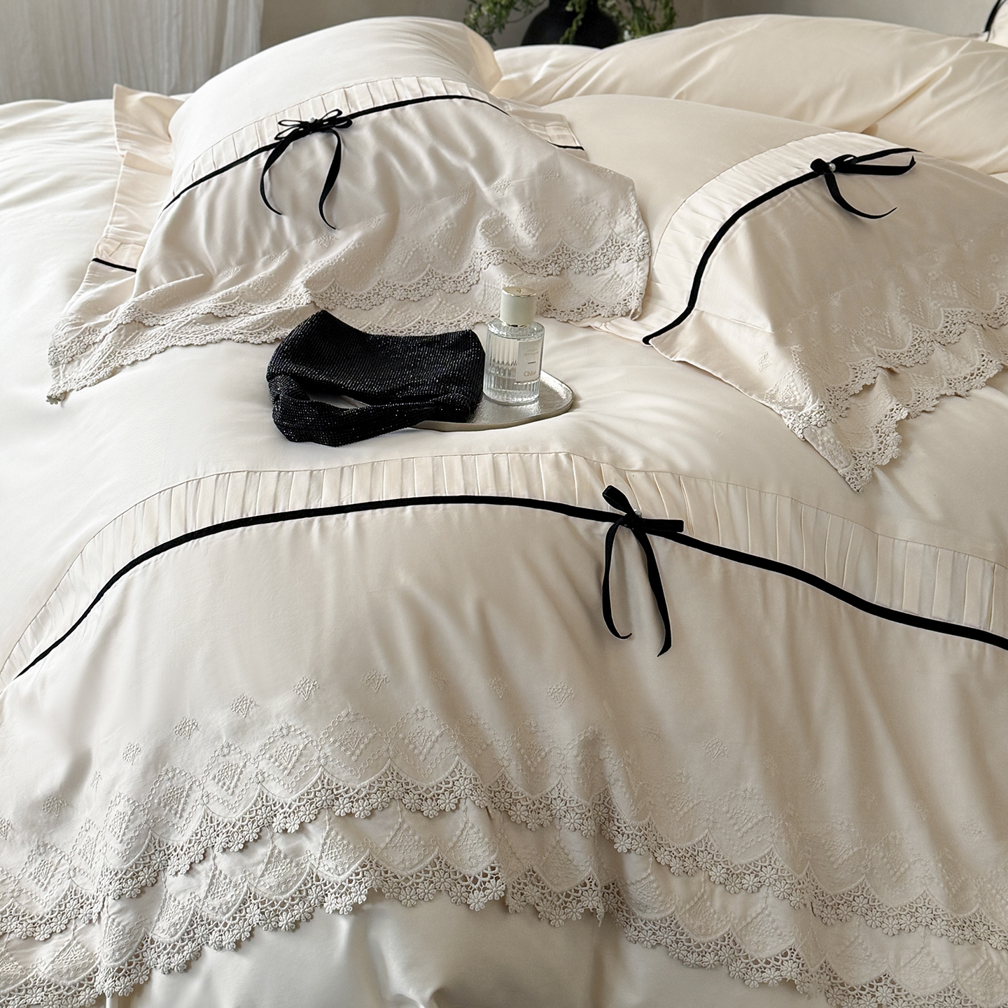 (总)佳汐蓝 2025春夏新品双层皱皱纱刺绣+织带+荷叶边四件套--白茶花,奶白,曲奇