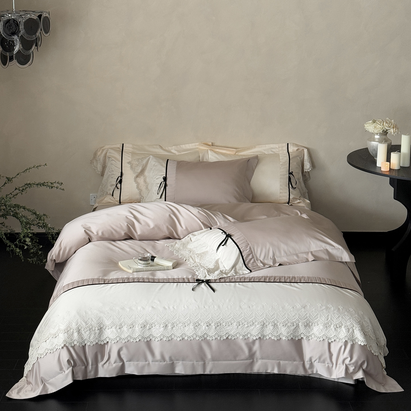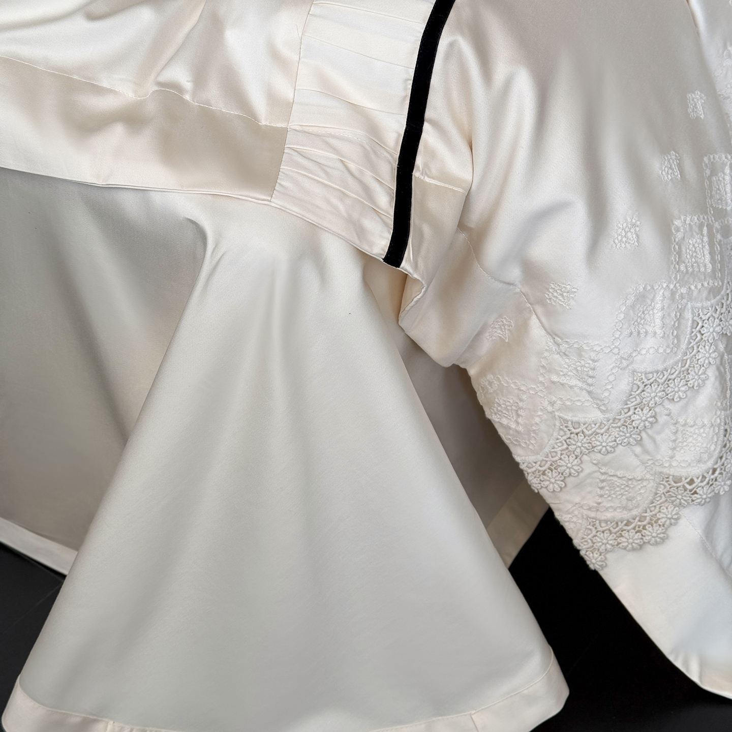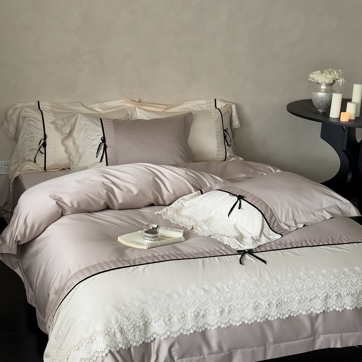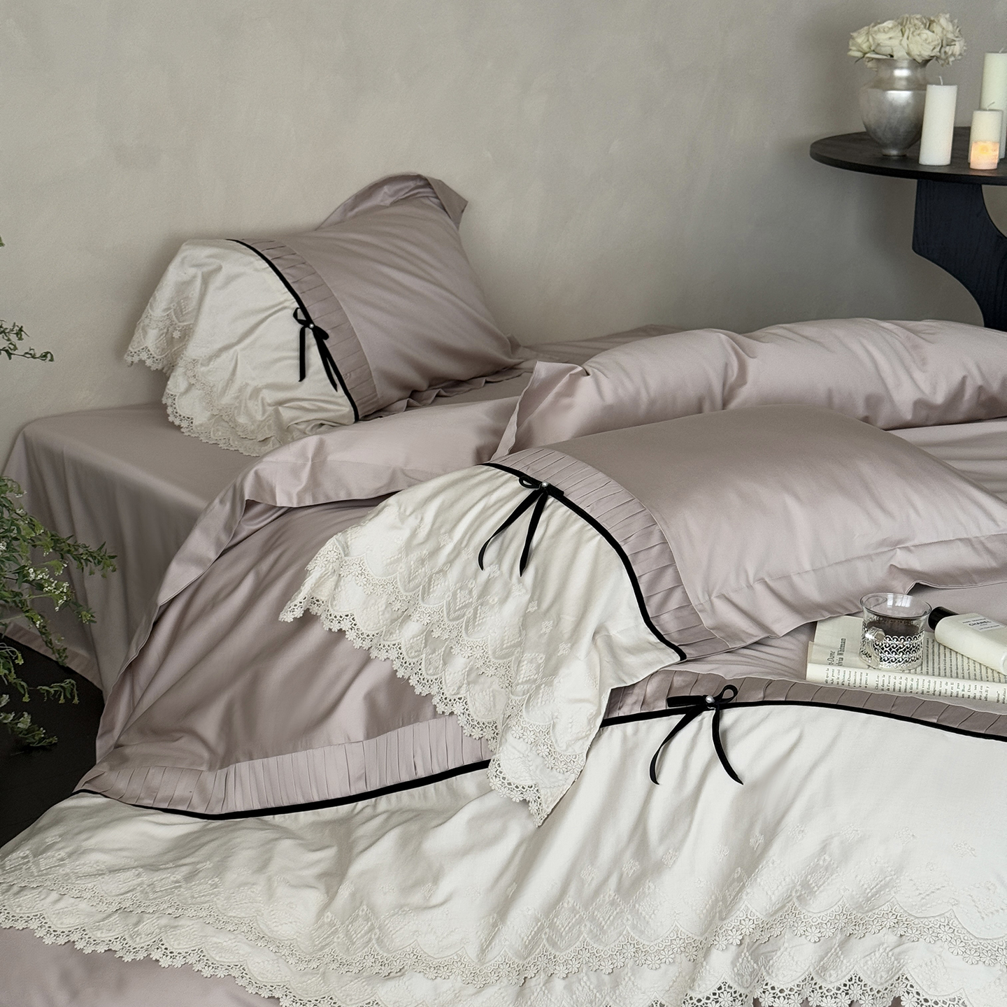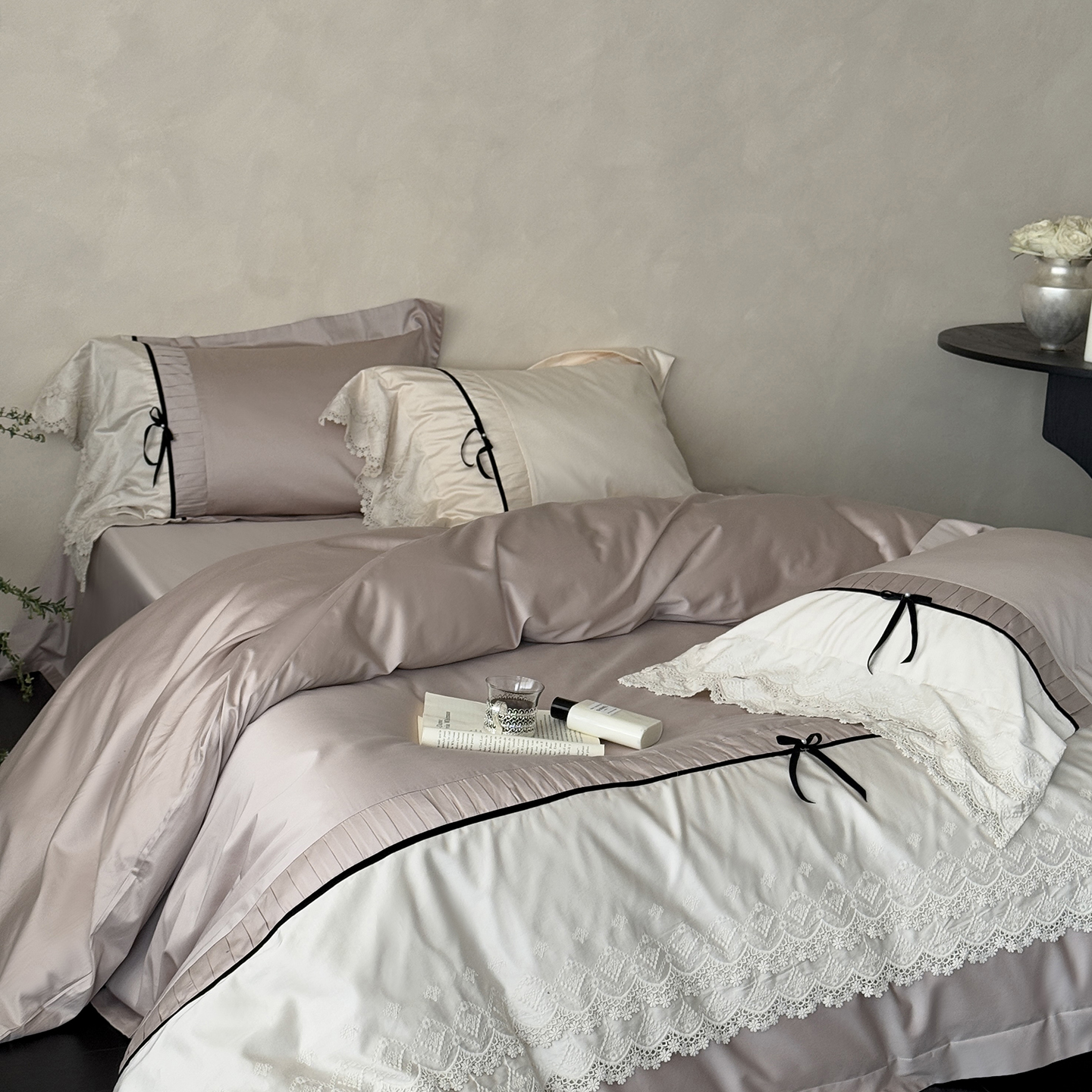 (总)佳汐蓝 2025春夏新品双层皱皱纱刺绣+织带+荷叶边四件套--白茶花,奶白,曲奇