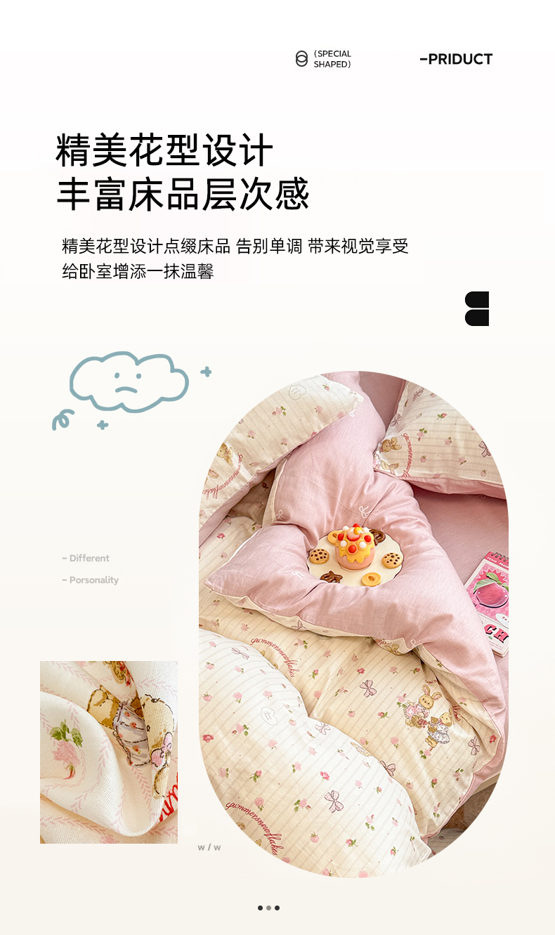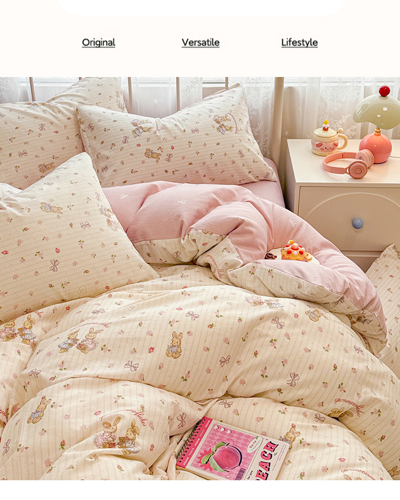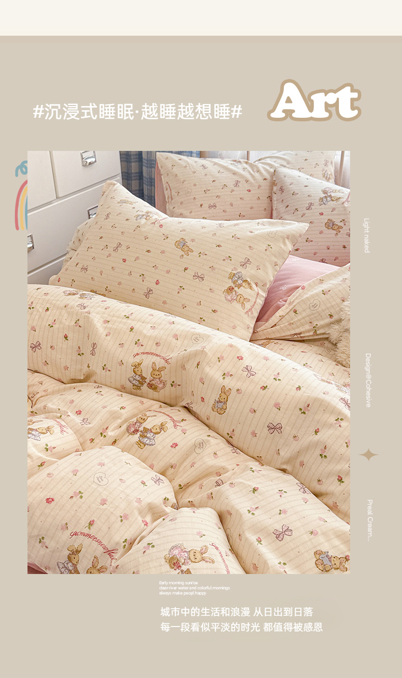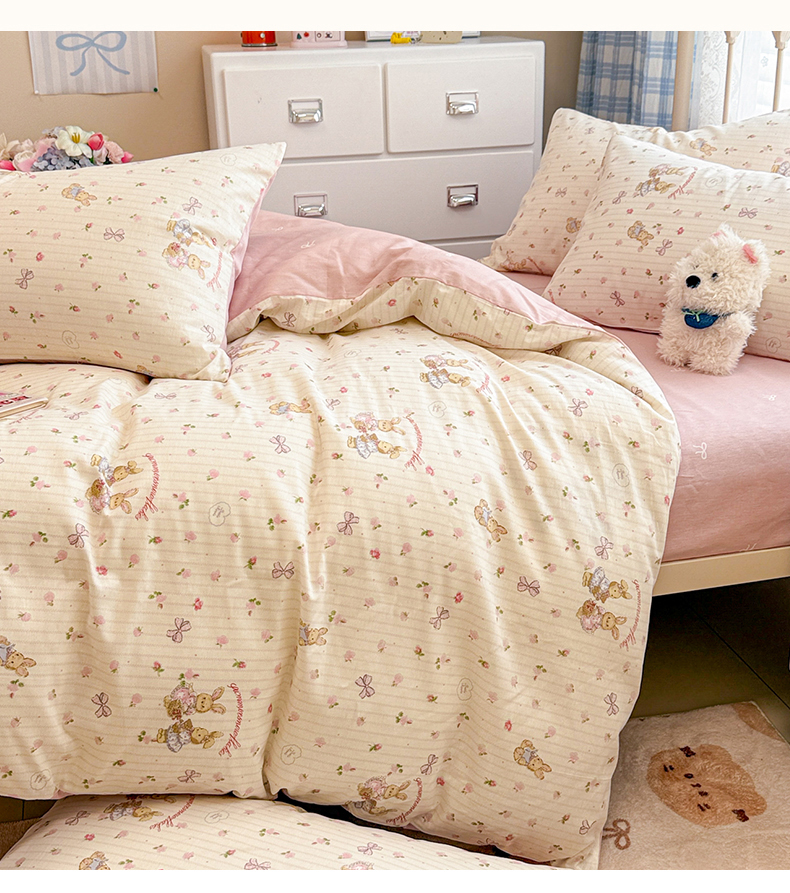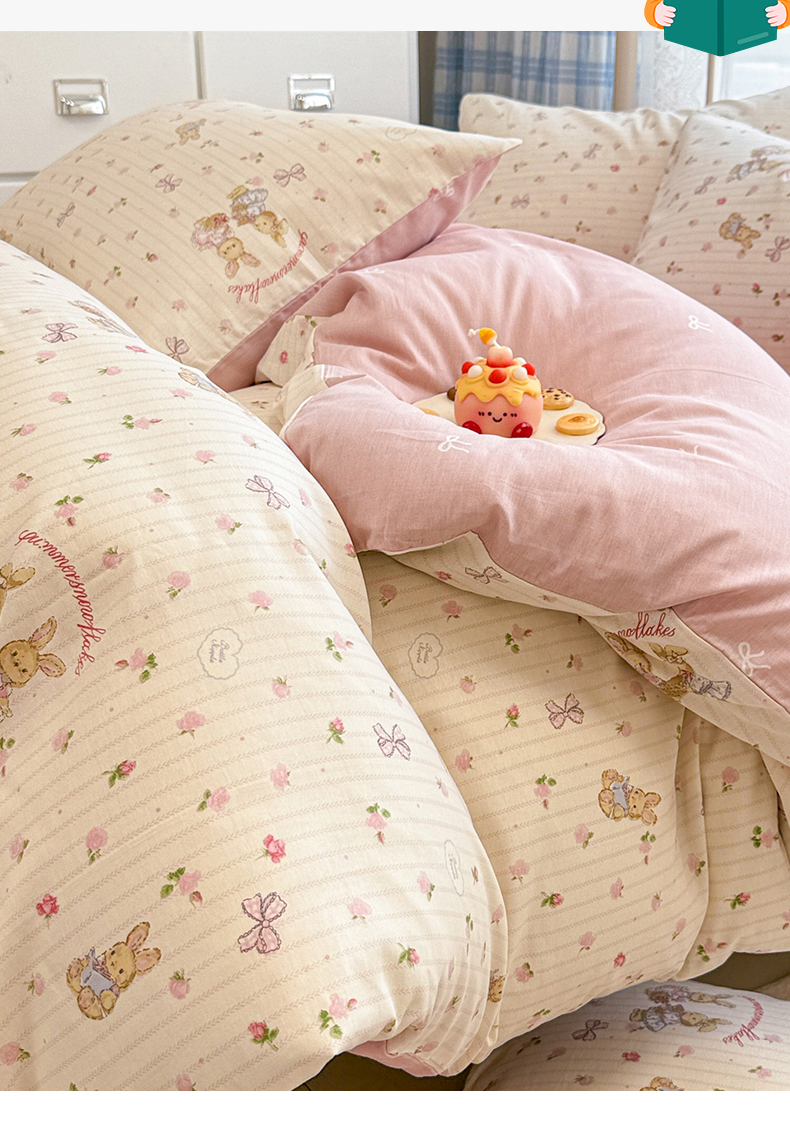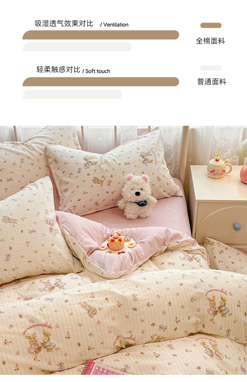 商品名称:简宜家居(朝初家纺) 2025新款12868全棉兔与花笺系列四件套 粉红可爱兔