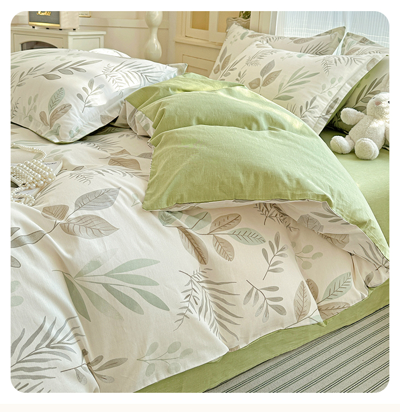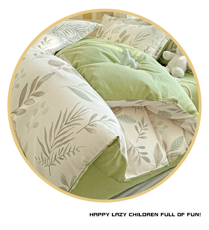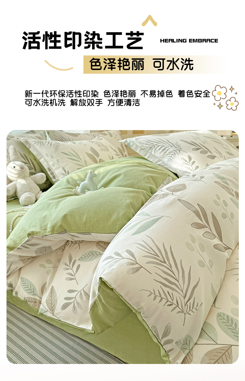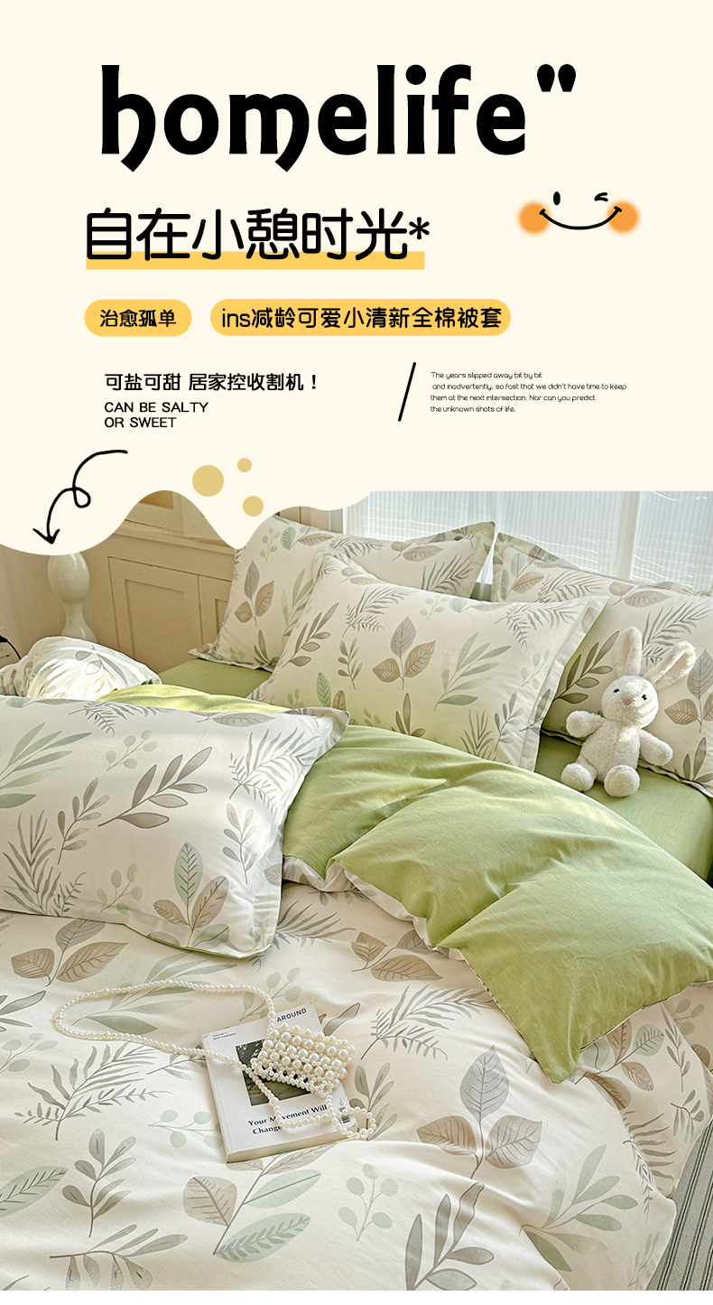 • 91家纺网 家纺一手货源 找家纺 春雨家居 2026新款全棉印花ins减龄可爱小清新单被套 叶语轻喃-绿