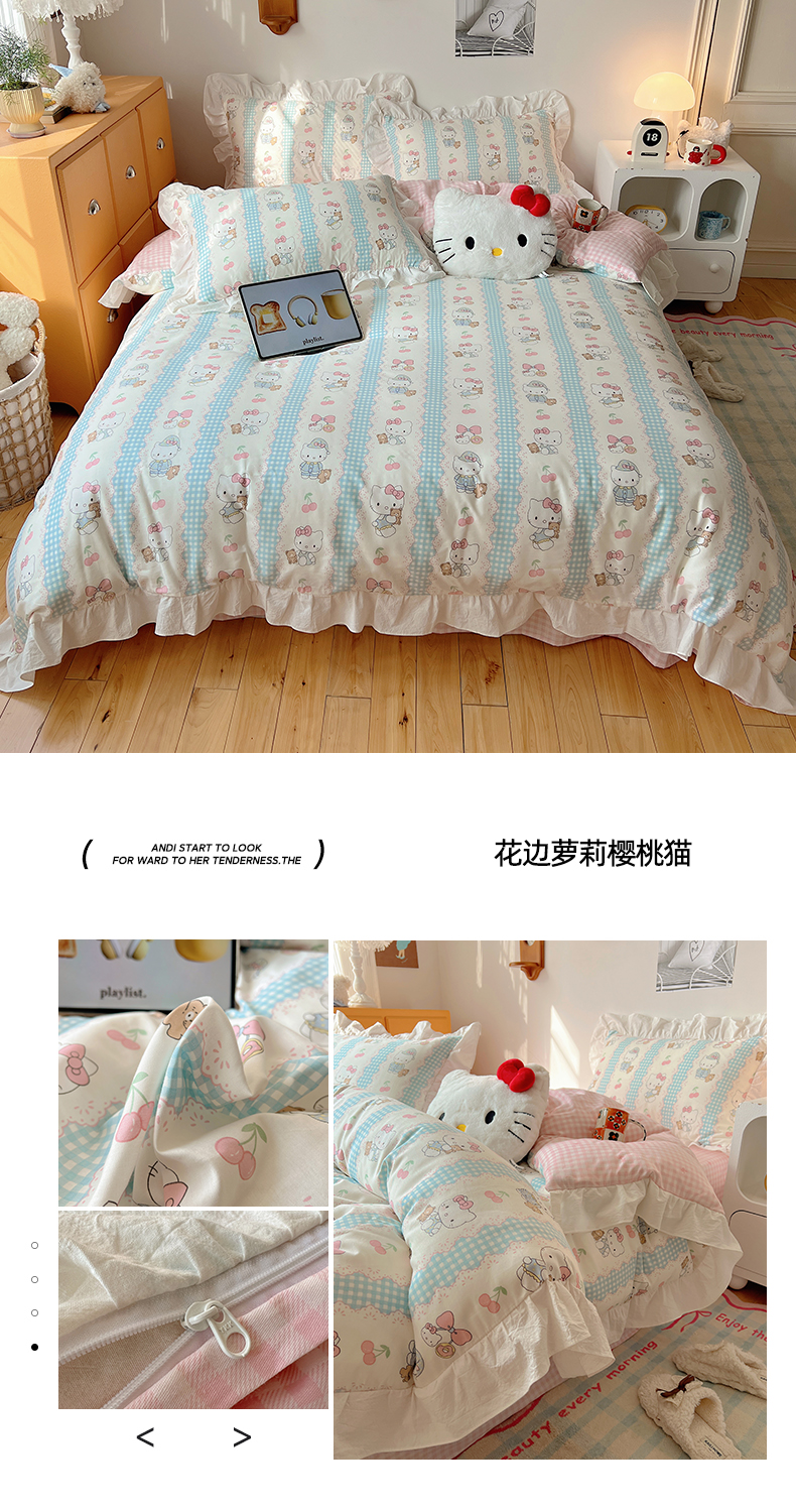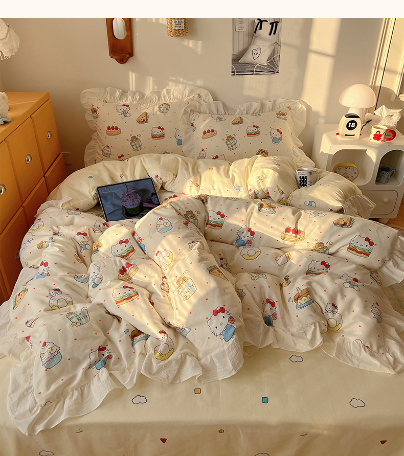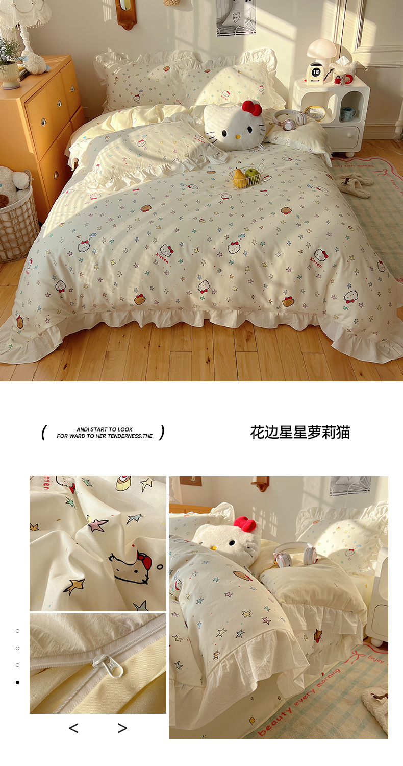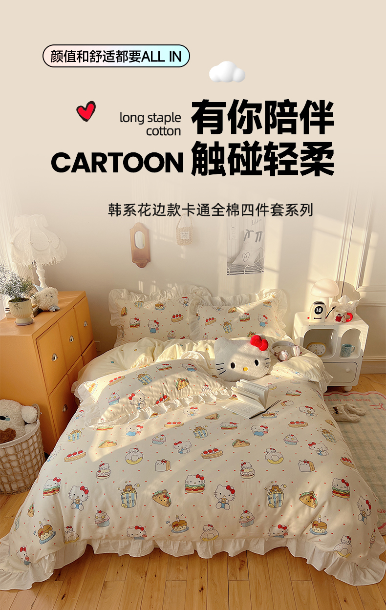 商品名称:六巷胡同 2026春夏新款韩系可爱风花边款卡通全棉四件套(第一系列) 花边爱心汉堡喵