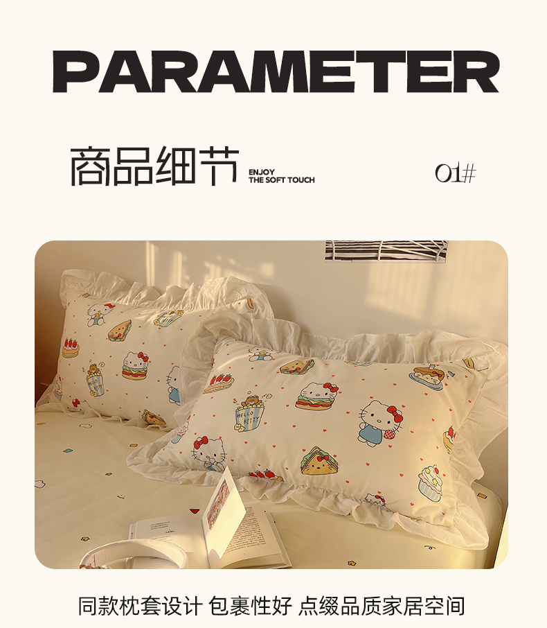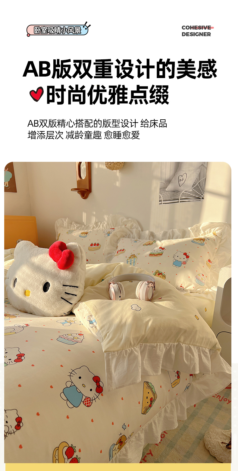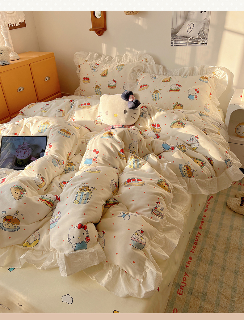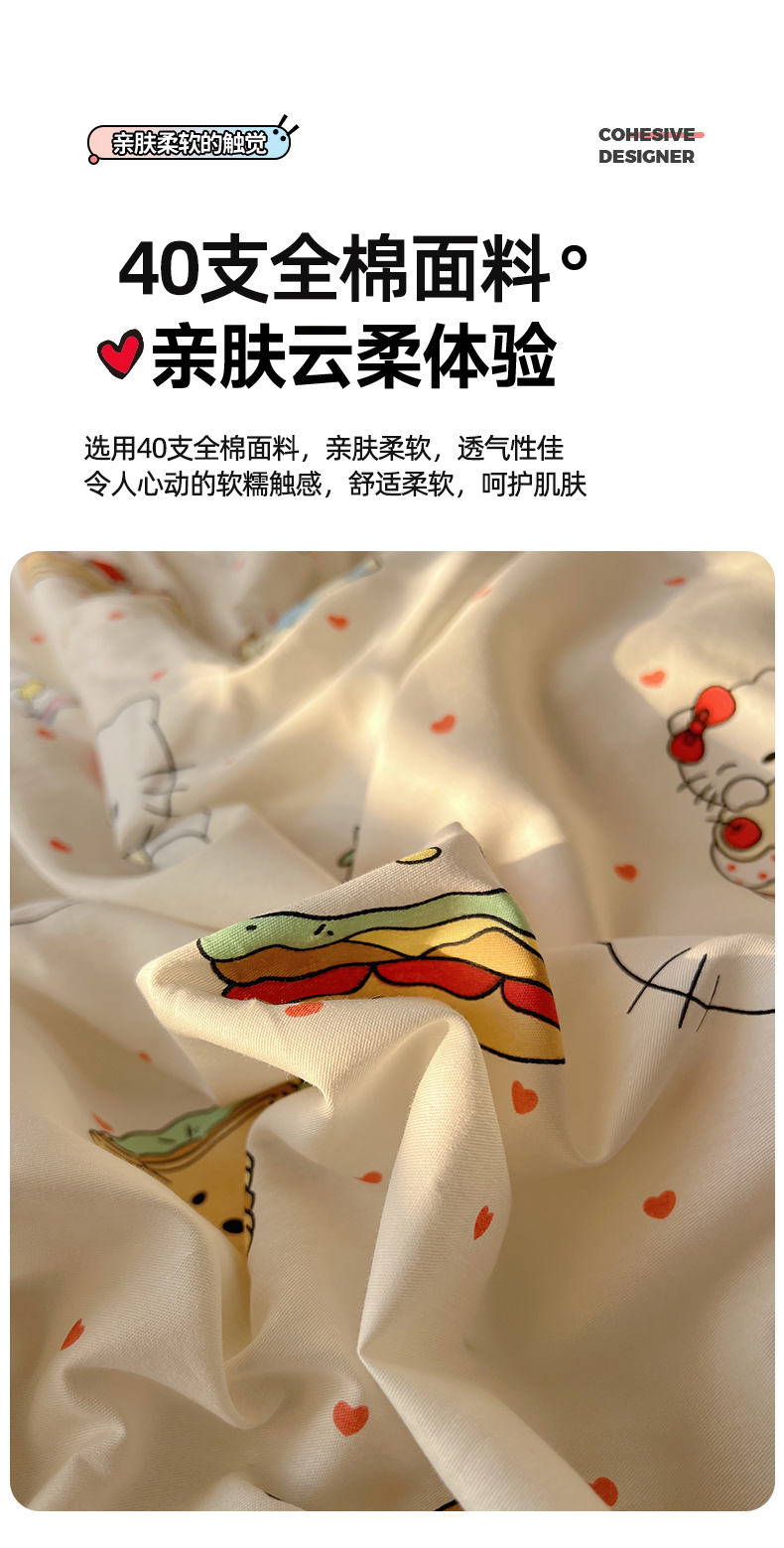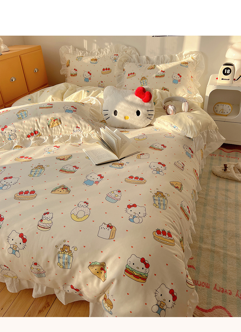 商品名称:六巷胡同 2026春夏新款韩系可爱风花边款卡通全棉四件套(第一系列) 花边爱心汉堡喵