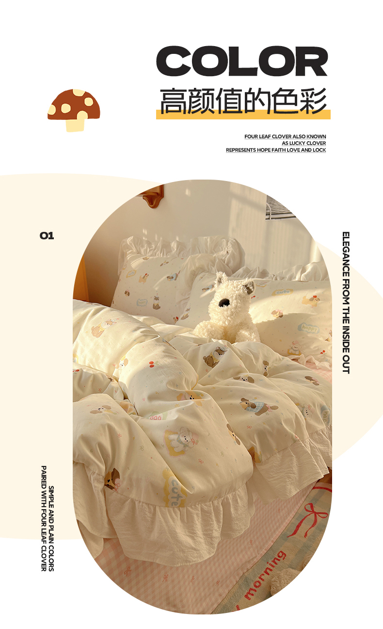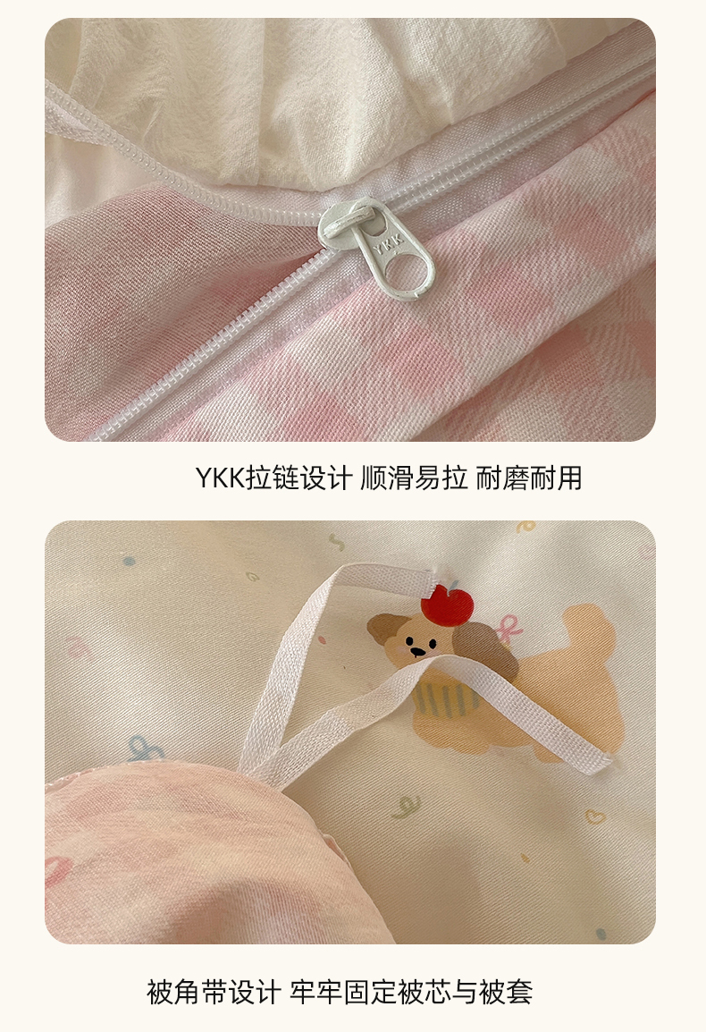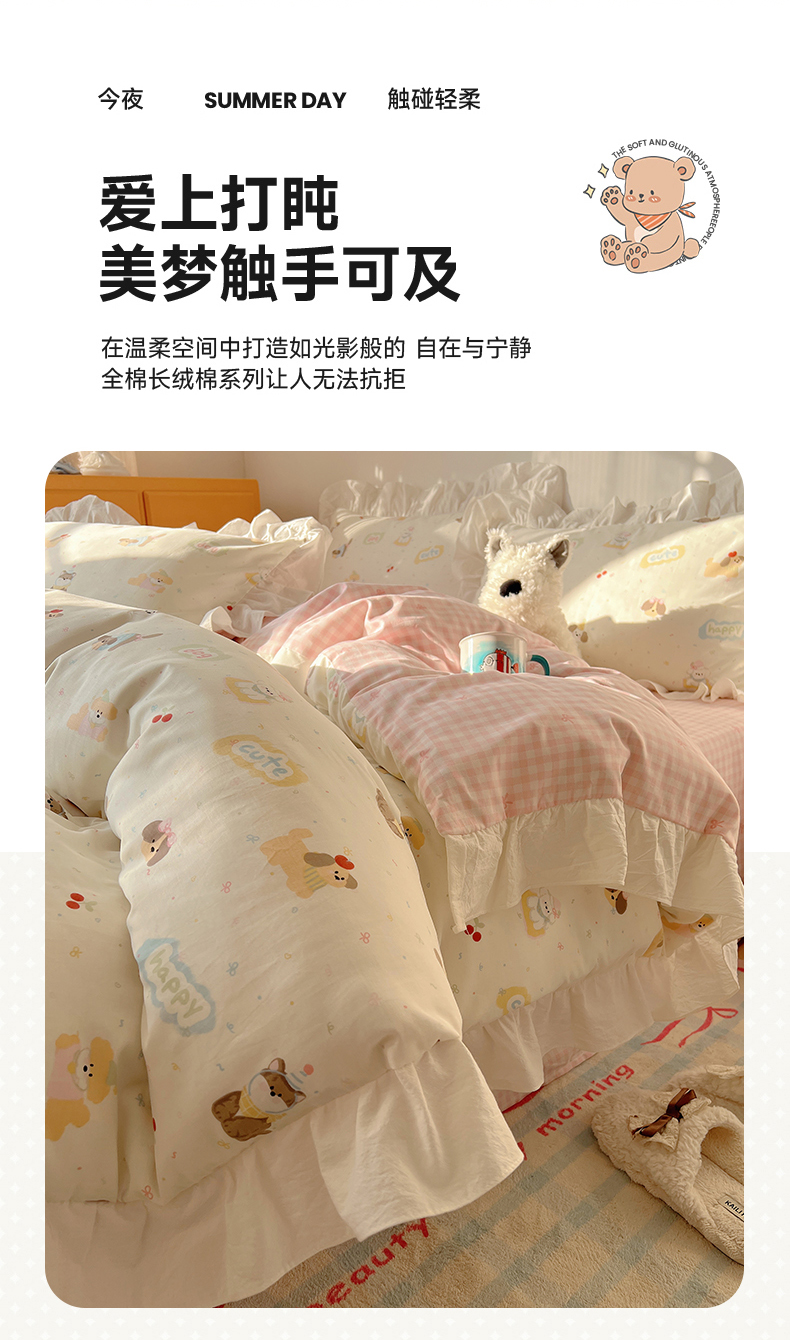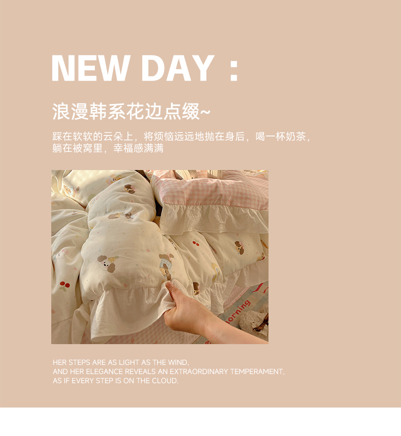 (总)六巷胡同 2026春夏新款韩式INS减龄花边款全棉卡通四件套,花边洋气柯基崽,花边欢乐课堂趴,花边假日庄园兔,花边蓝格奶油狗,花边浪漫碎花犬,花边秘境花园熊,花边奶油甜心熊