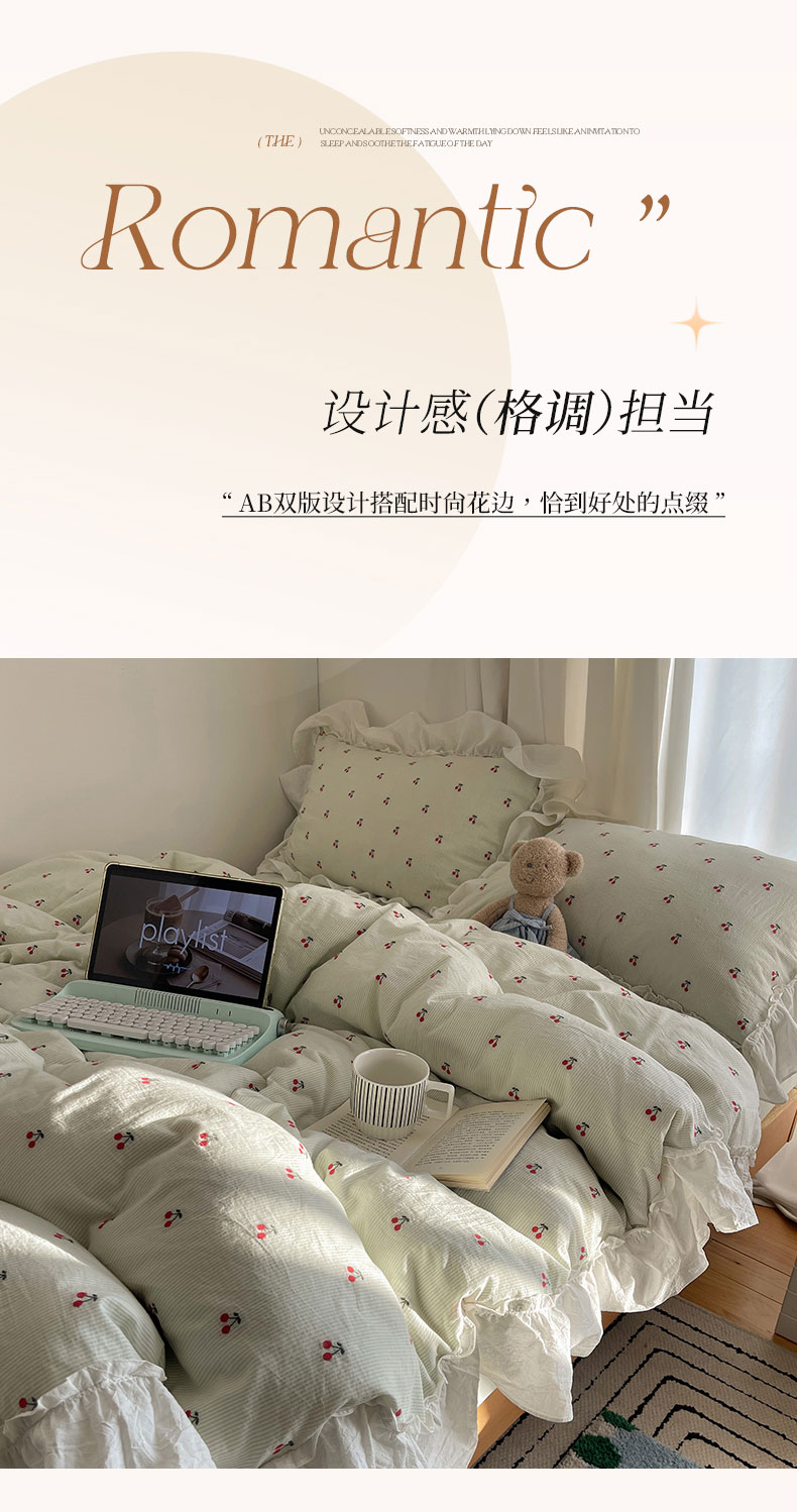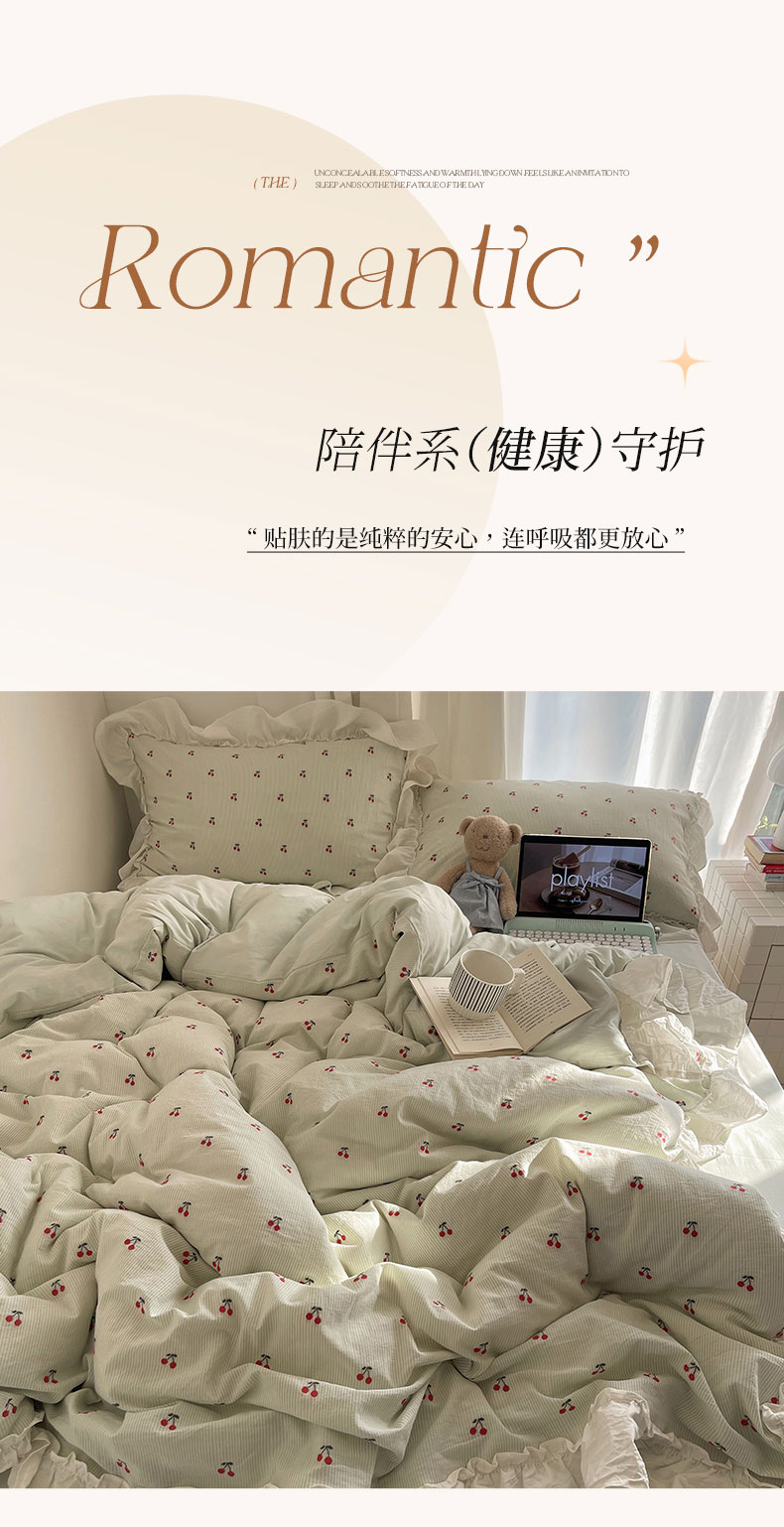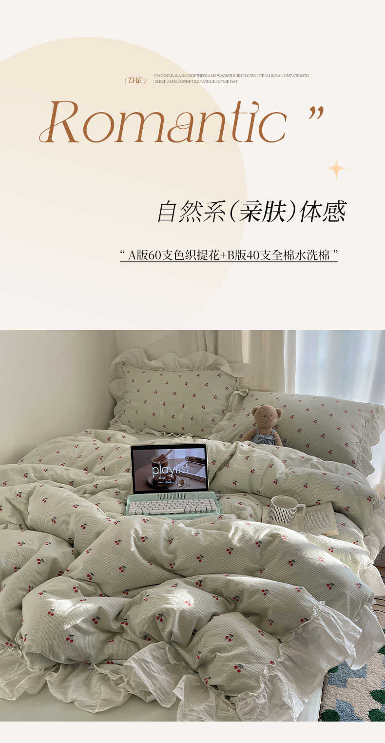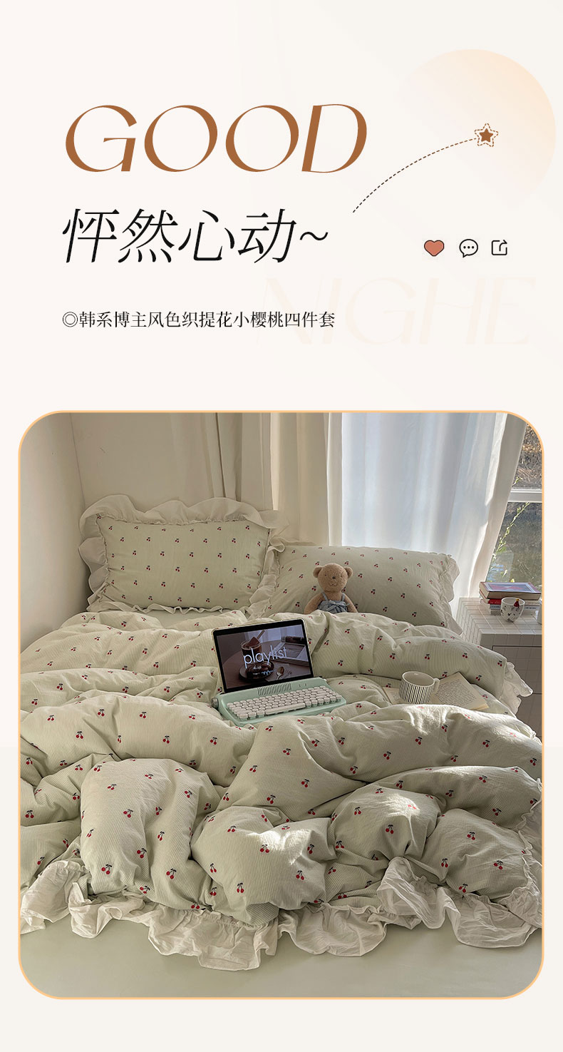 当前位置: 91家纺网 > 商品网购 > 床品套件 > 四件套 > 色织四件套 > 六巷胡同 2026新款韩系博主风60支色织提花小樱桃A类全棉水洗棉四件套 小樱桃-绿