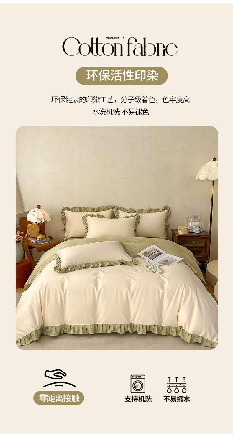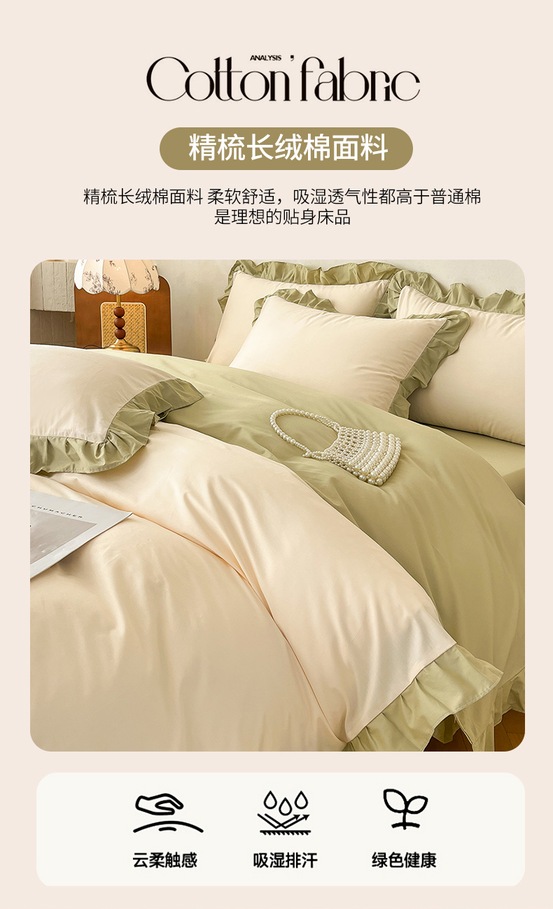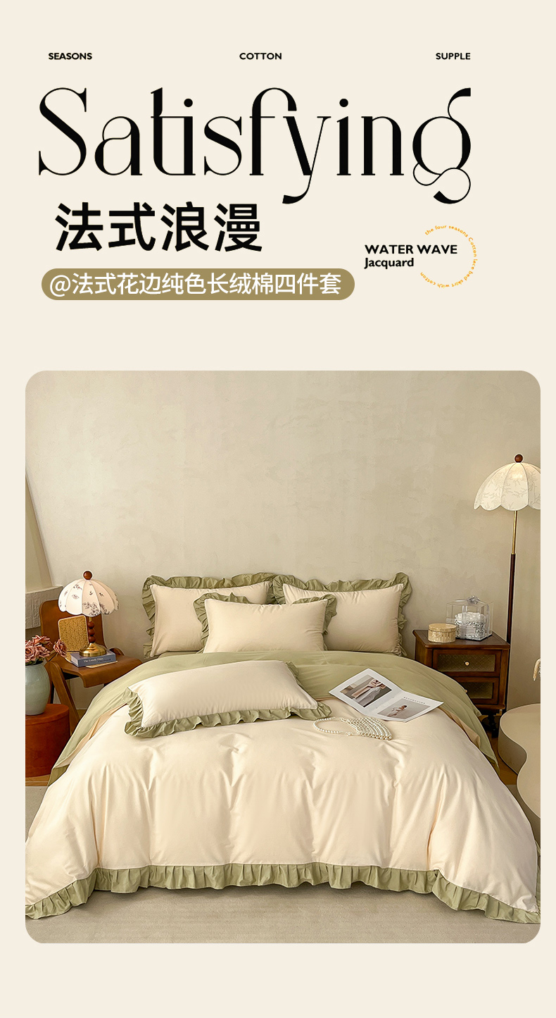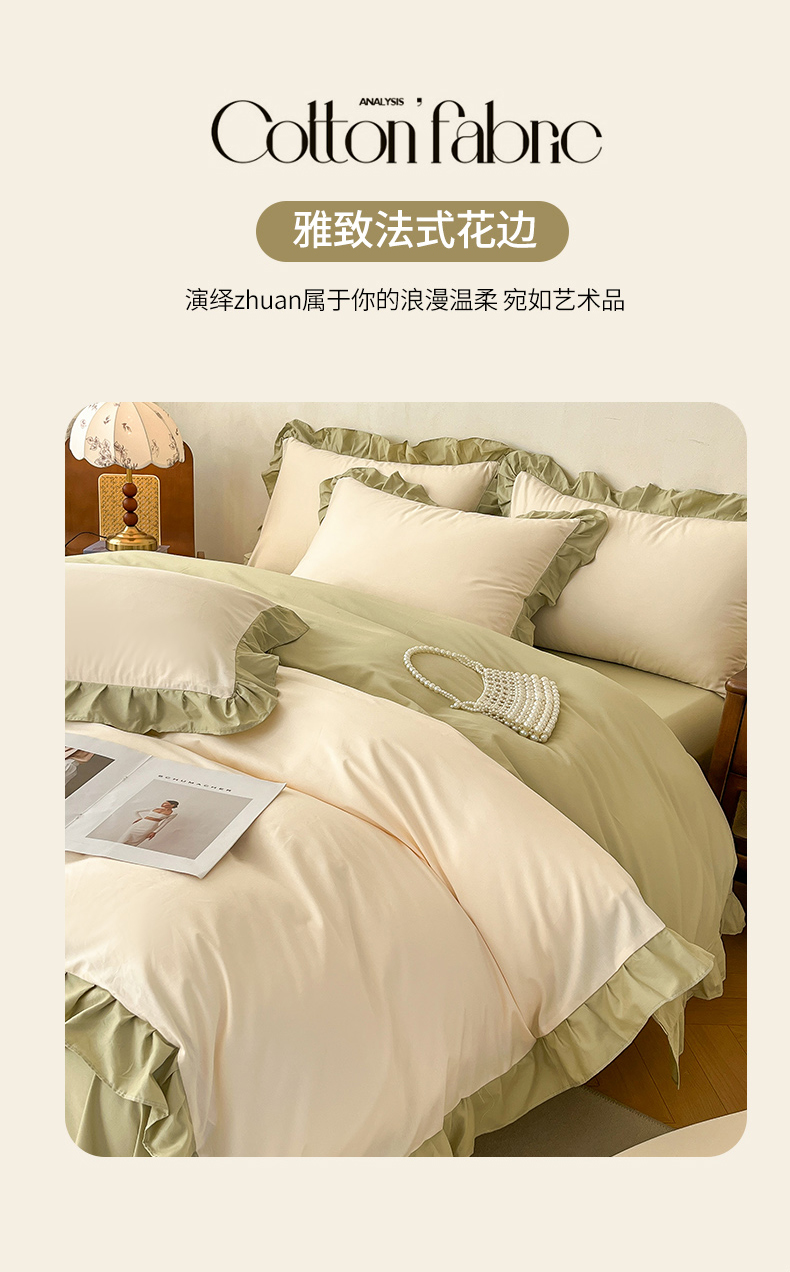 当前位置: 91家纺网 > 商品网购 > 床品套件 > 四件套 > 全棉普通四件套 > 艾迪尚家纺 2026新款法式韩版荷叶边纯色长绒棉四件套 茉绿奶芙