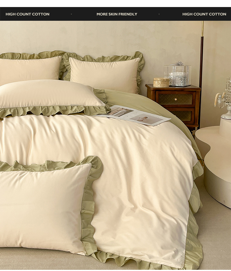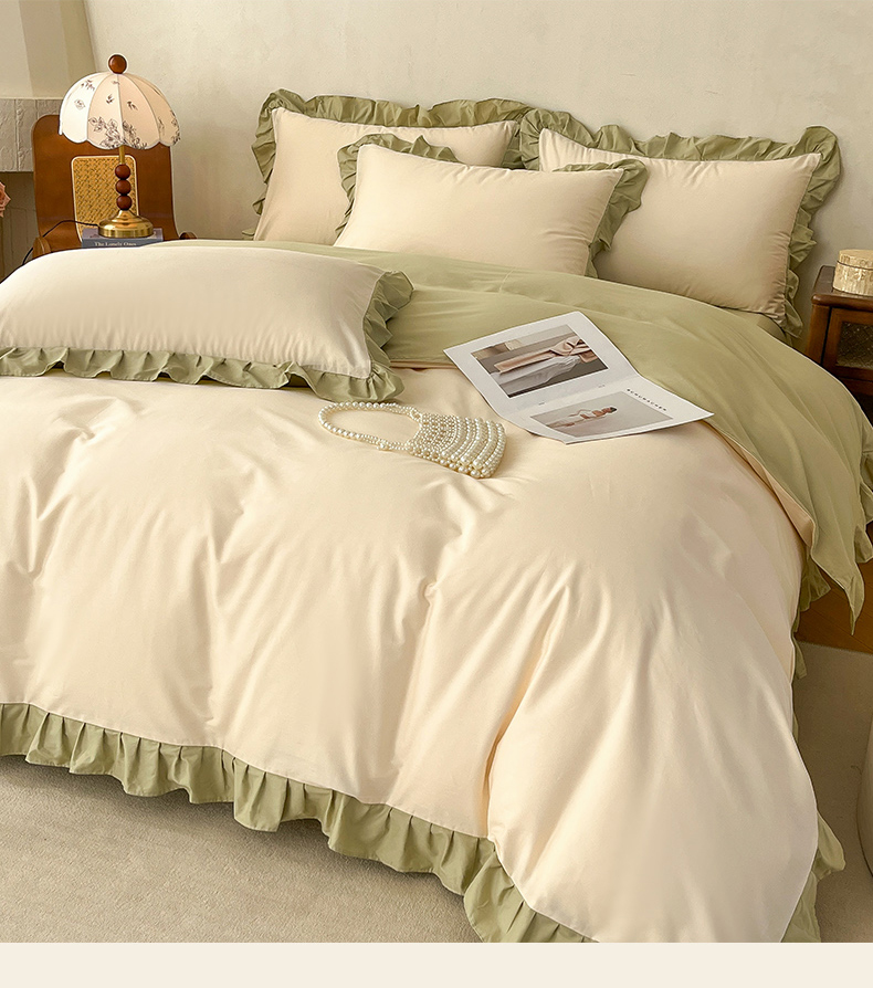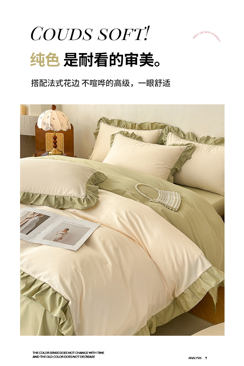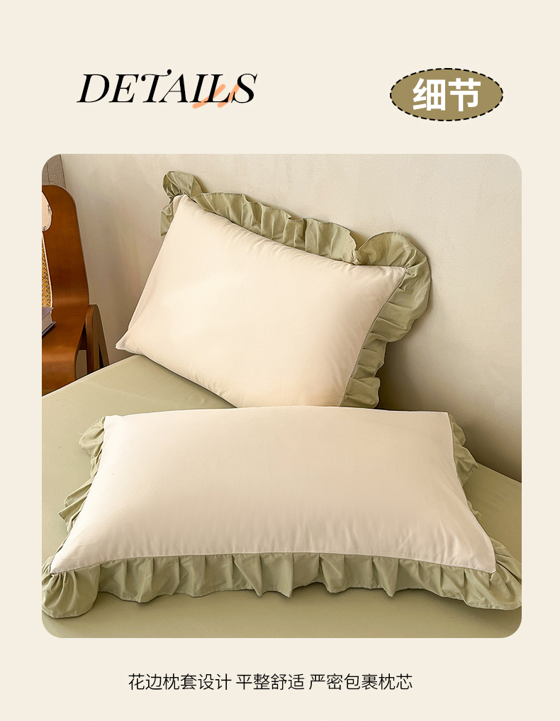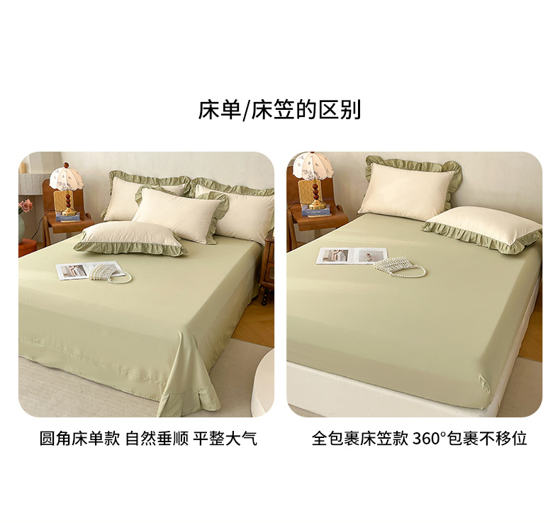当前位置: 91家纺网 > 商品网购 > 床品套件 > 四件套 > 全棉普通四件套 > 艾迪尚家纺 2026新款法式韩版荷叶边纯色长绒棉四件套 茉绿奶芙