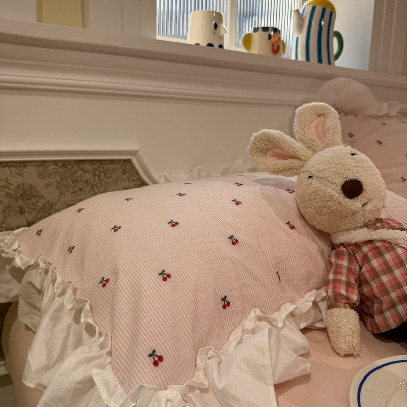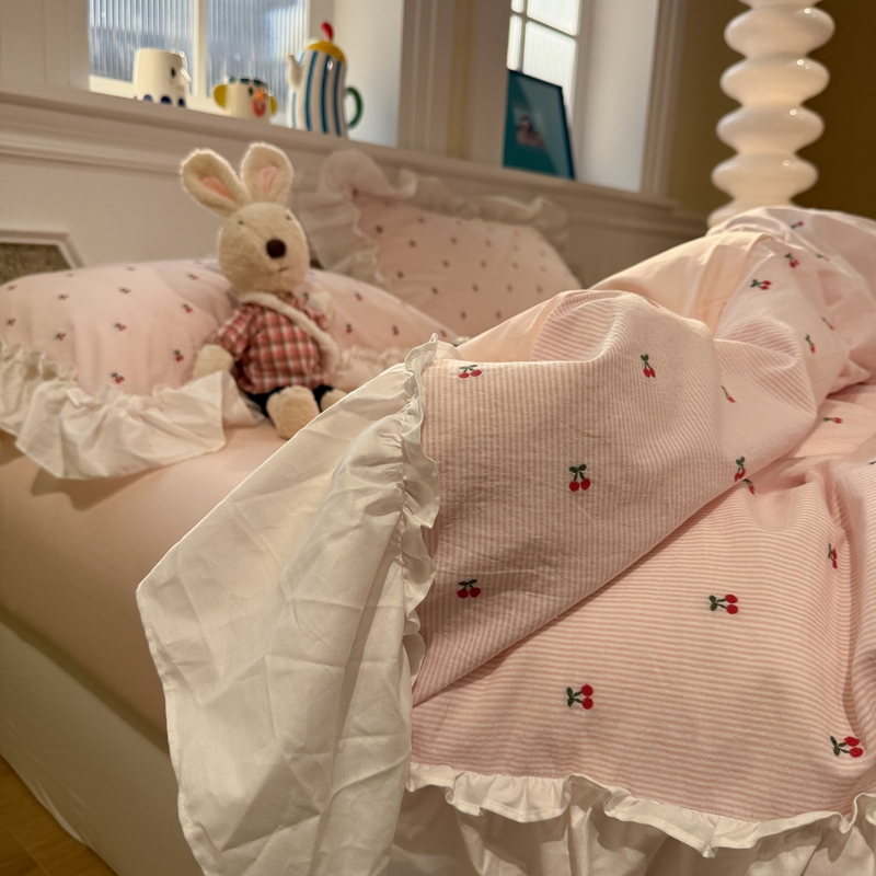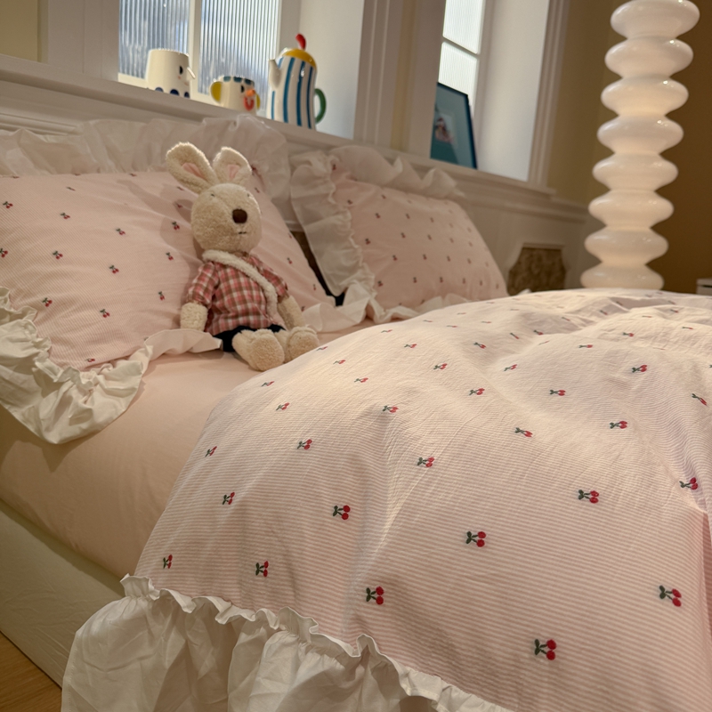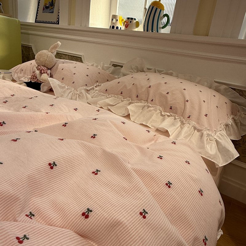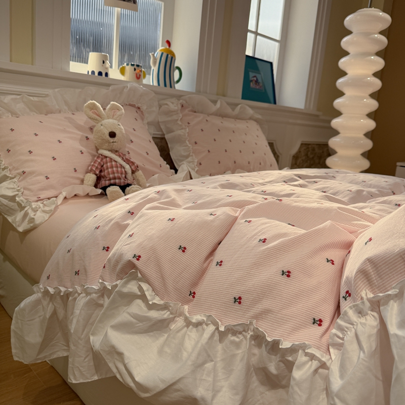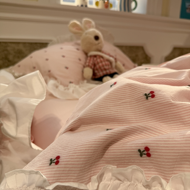觅糖家纺 2026新款全棉水洗棉色织提花四件套-樱桃甜梦(会员-5) 樱桃甜梦粉