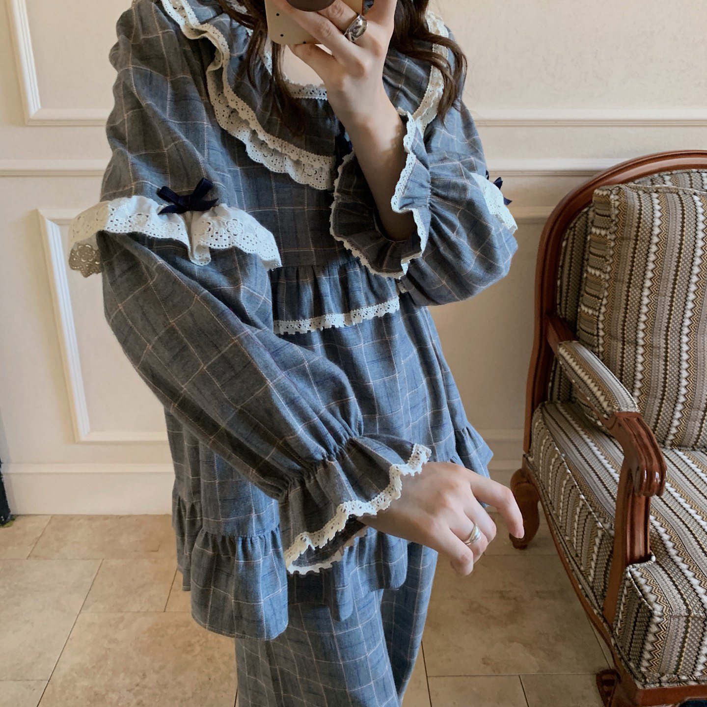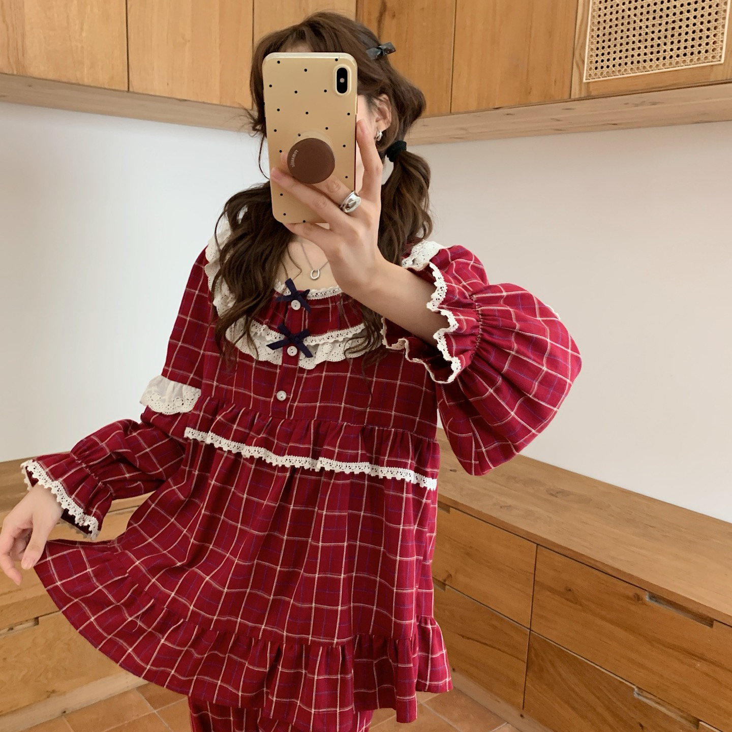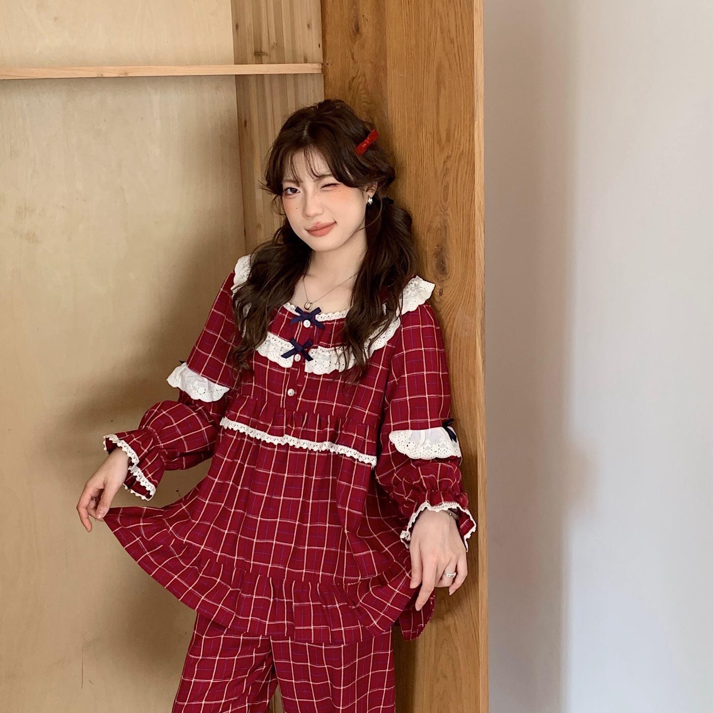 当前位置: 91家纺网 > 商品网购 > 居家日用 > 睡衣/家居服套装 > 妍景家居生活馆 2026新款韩系甜美蕾丝花边格子套装 红色