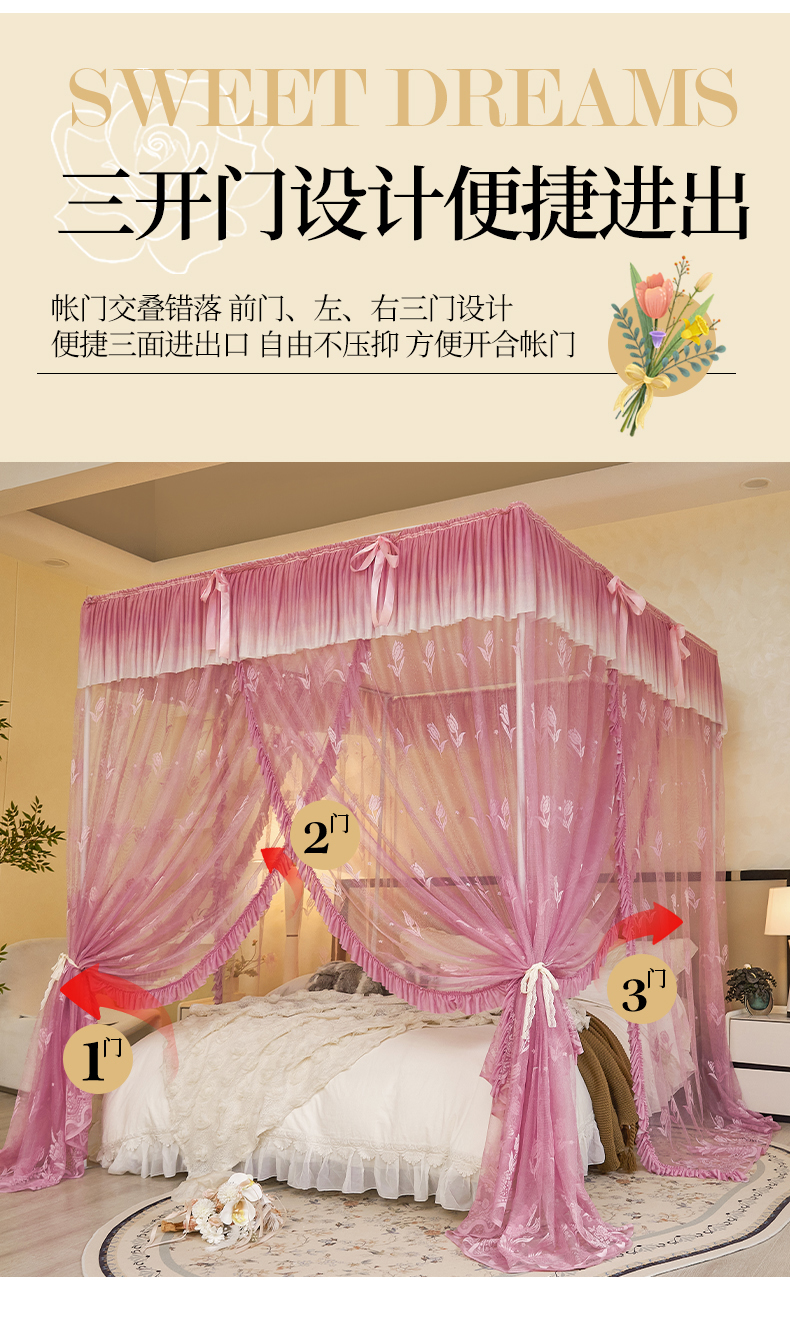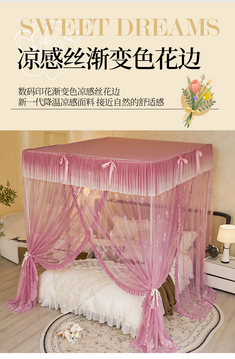(总)世婕 2026新款双丝提花落地花边蚊帐-浪漫满屋,浪漫满屋-香妃玉,浪漫满屋-海岛蓝,浪漫满屋-灰色,浪漫满屋-柔粉白,浪漫满屋-樱花粉