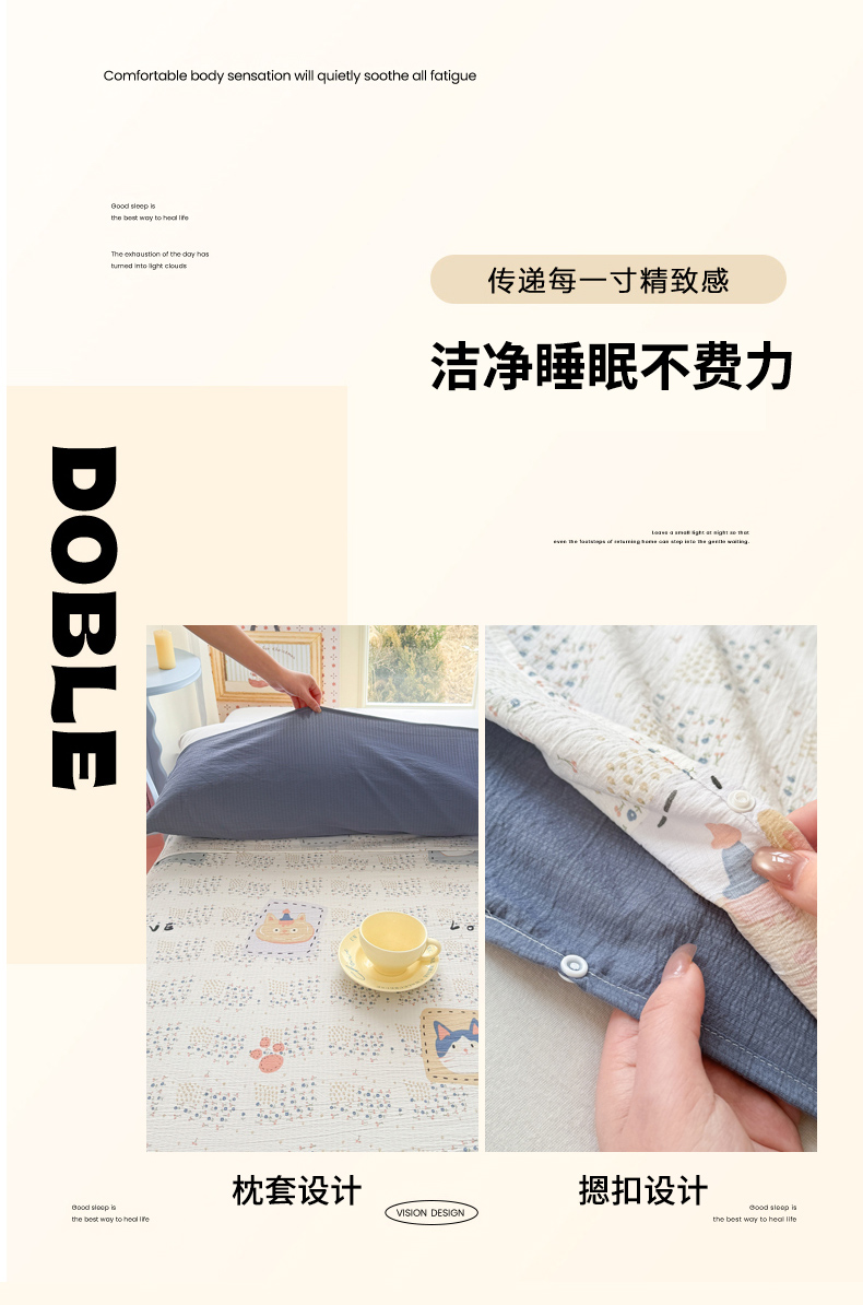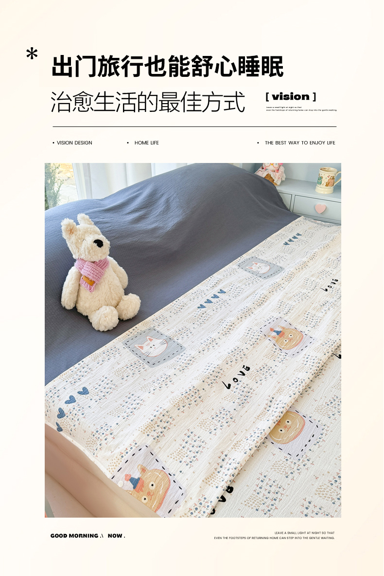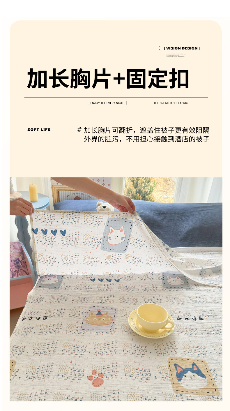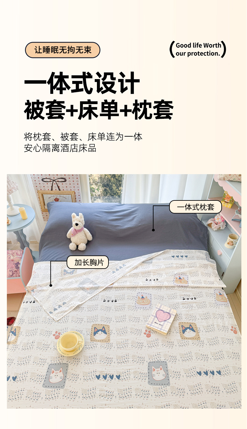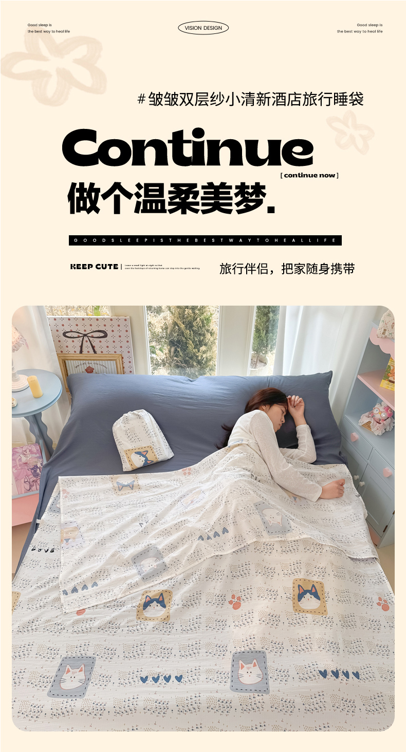 商品名称:Sweet dreams甜梦 2026新款A类皱皱双层纱小清新酒店一体式旅行睡袋 大脸猫