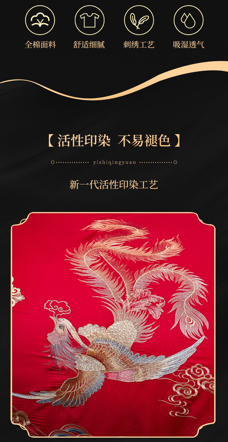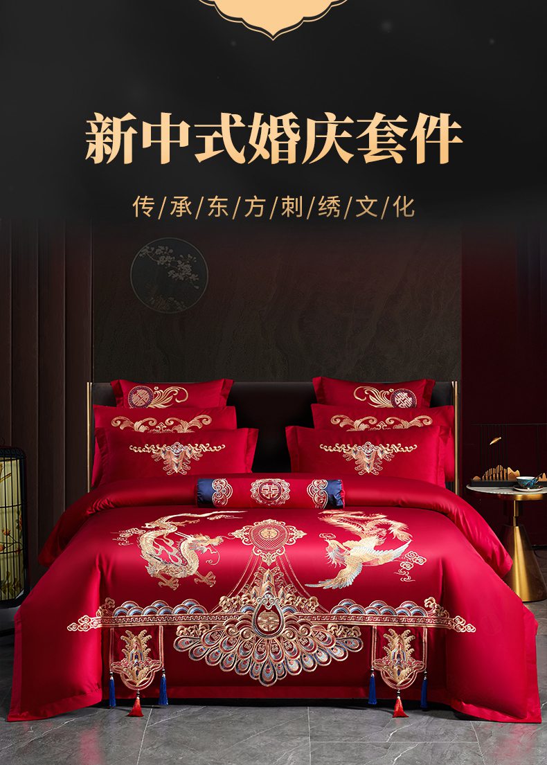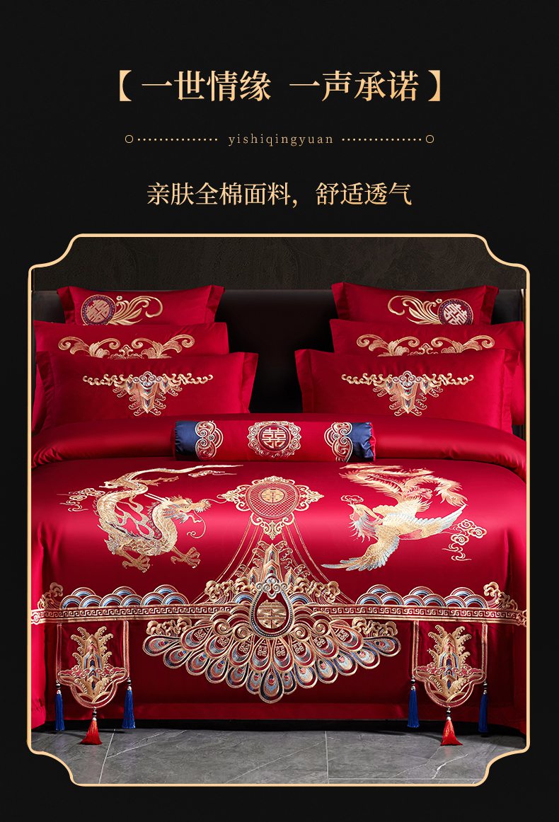 当前位置: 91家纺网 > 商品网购 > 床品套件 > 四件套 > 婚庆四件套 > 慕她家纺 2026慕她大花工艺款全棉纯棉婚庆四件套大红色刺绣结婚床上用品 龙翔凤舞