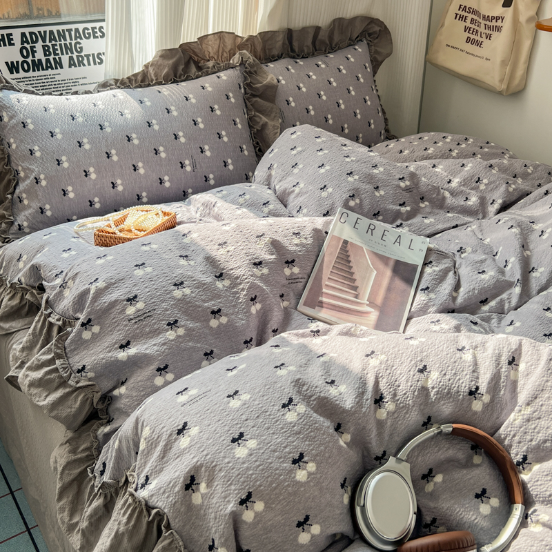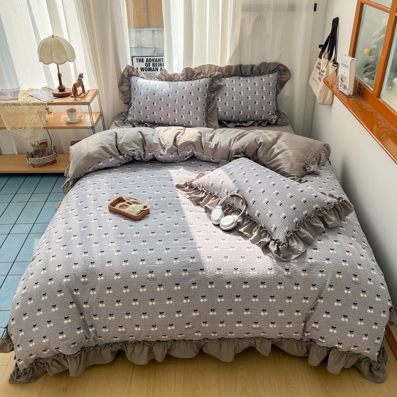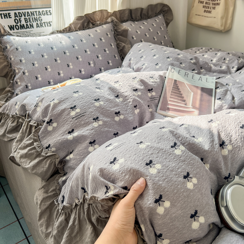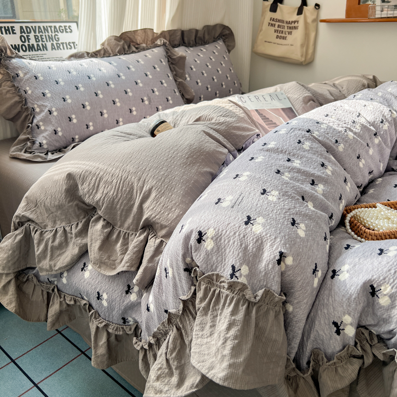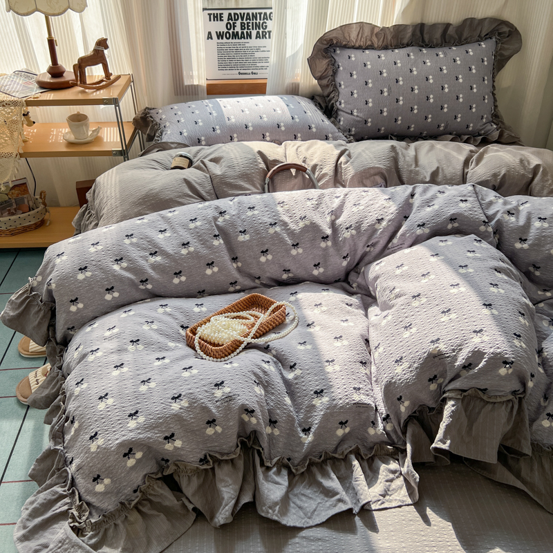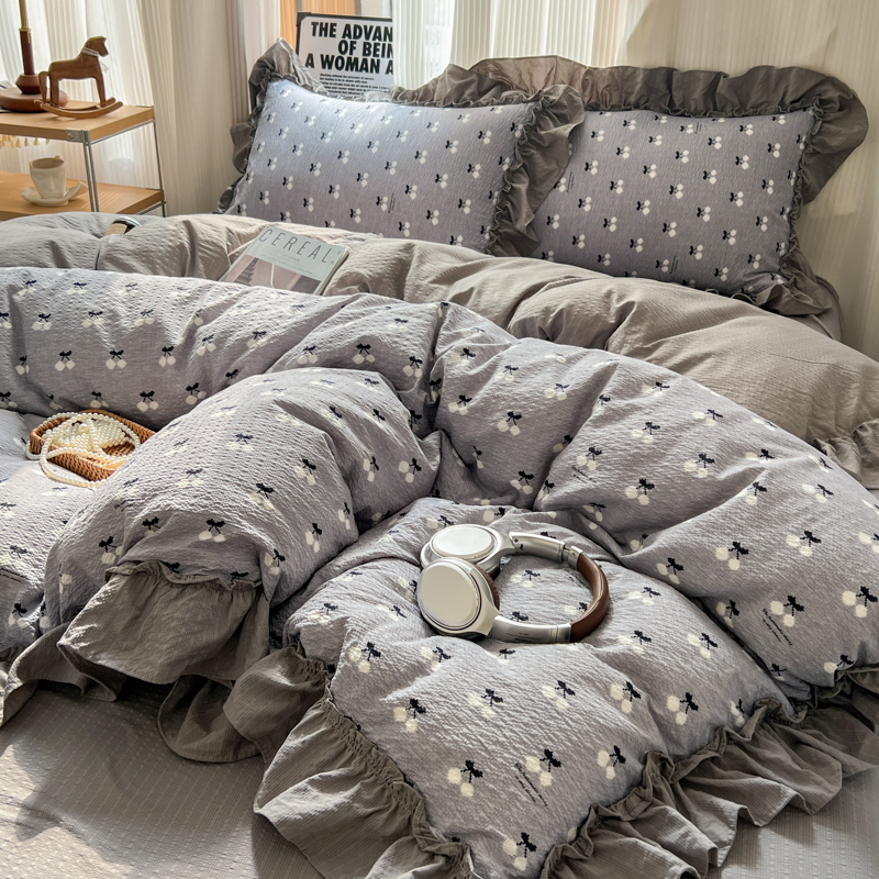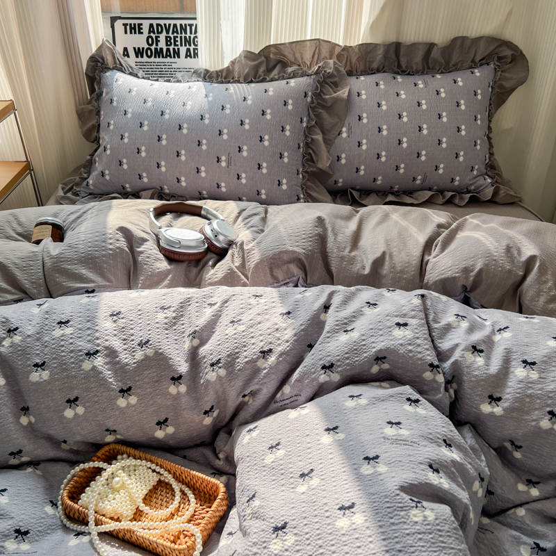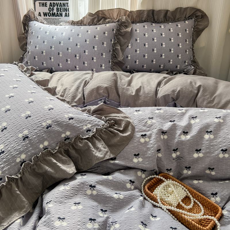 当前位置: 91家纺网 > 商品网购 > 床品套件 > 四件套 > 化纤活性四件套 > 2026新款泡芙纱花边四件套 灰樱桃