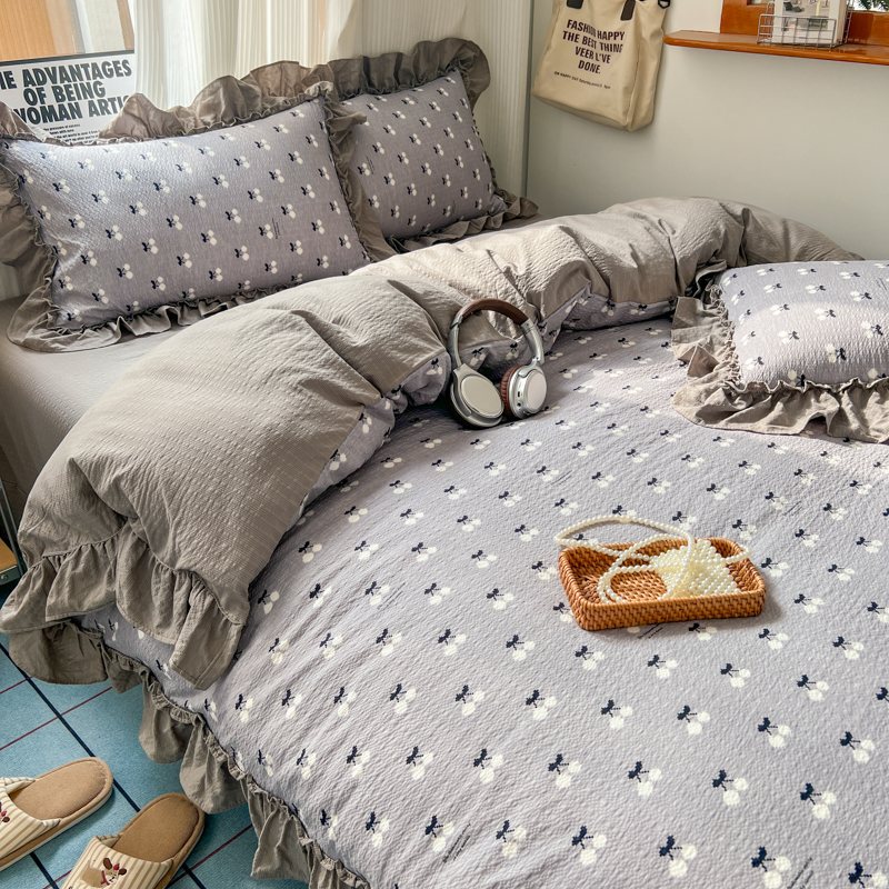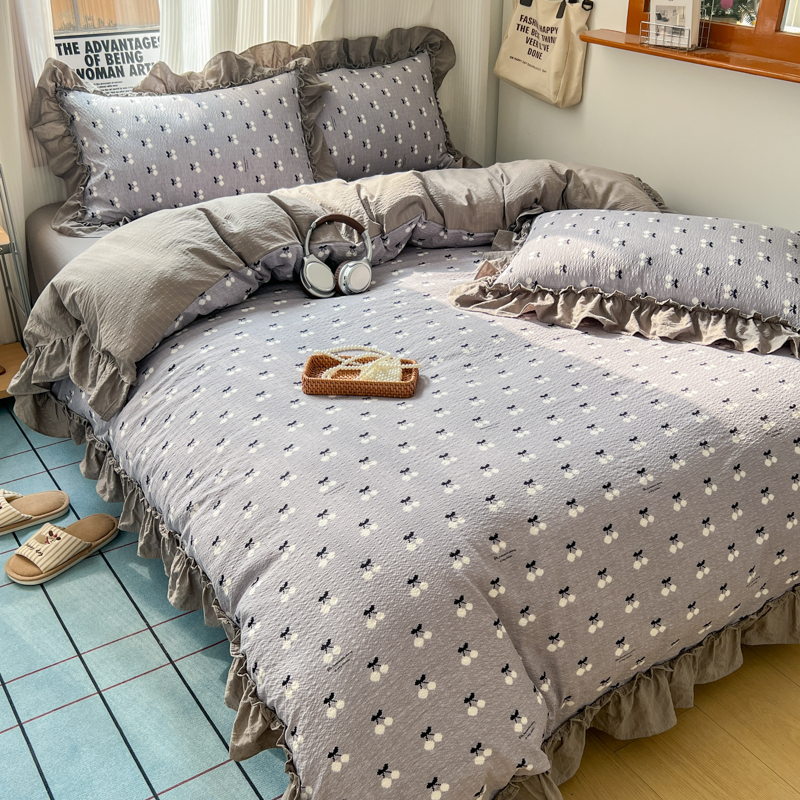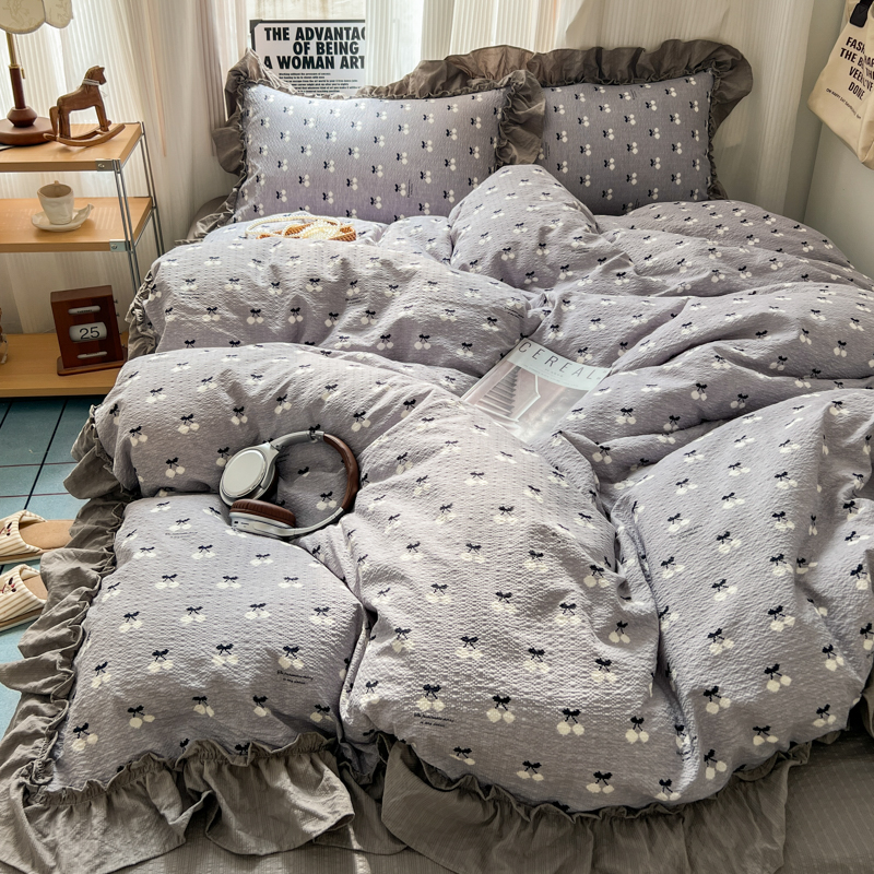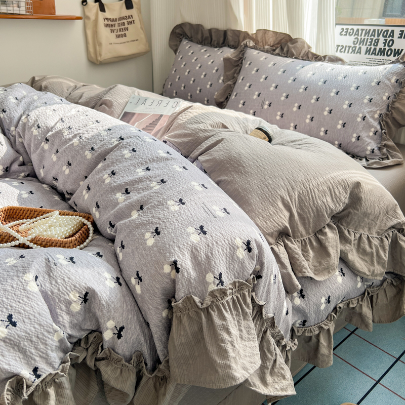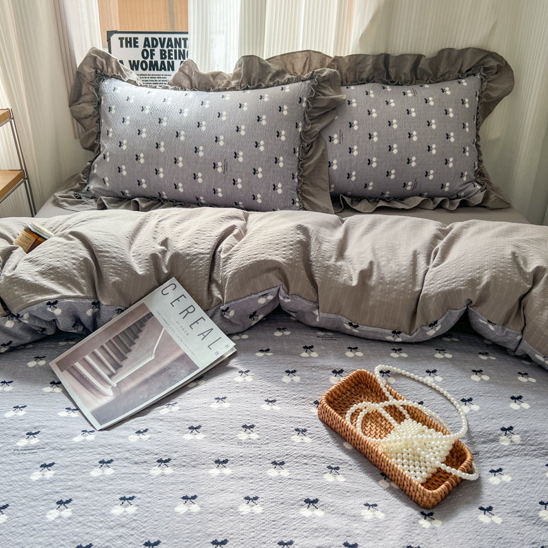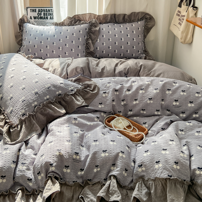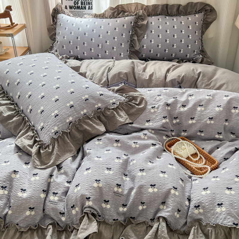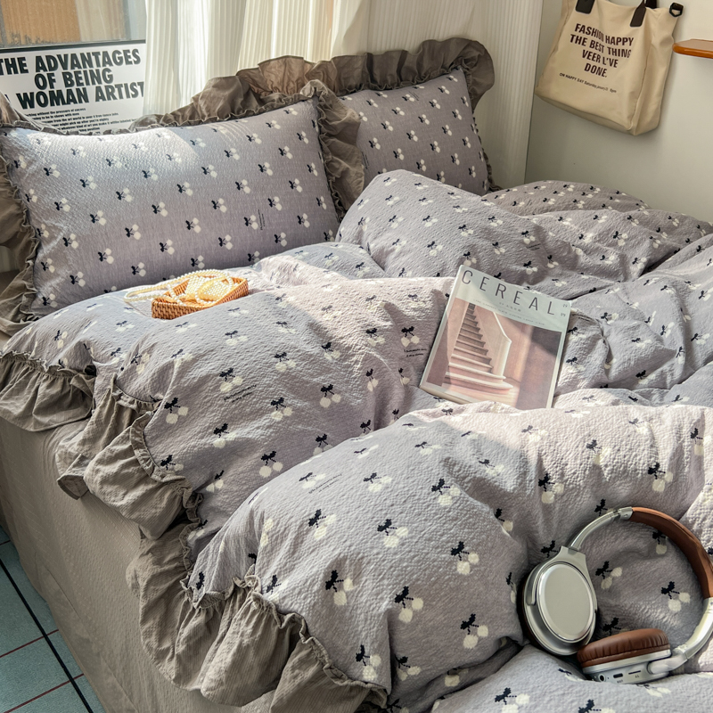 当前位置: 91家纺网 > 商品网购 > 床品套件 > 四件套 > 化纤活性四件套 > 2026新款泡芙纱花边四件套 灰樱桃