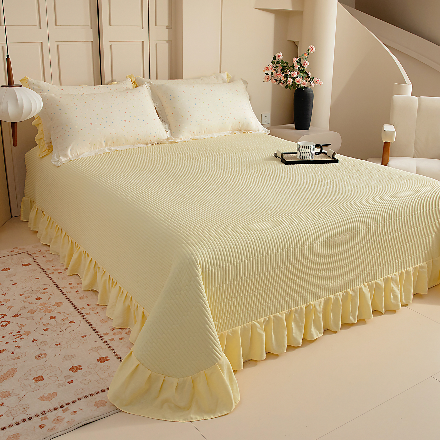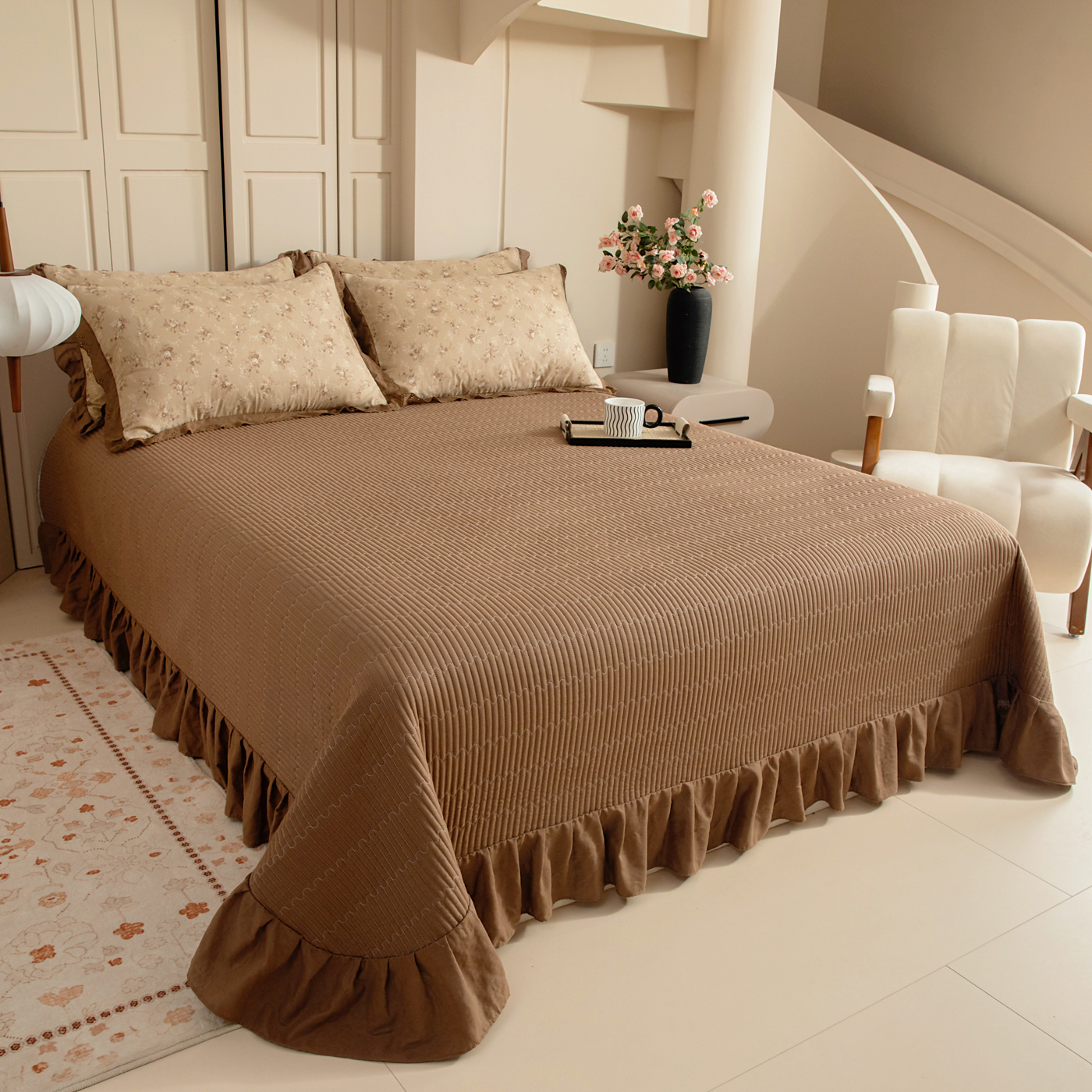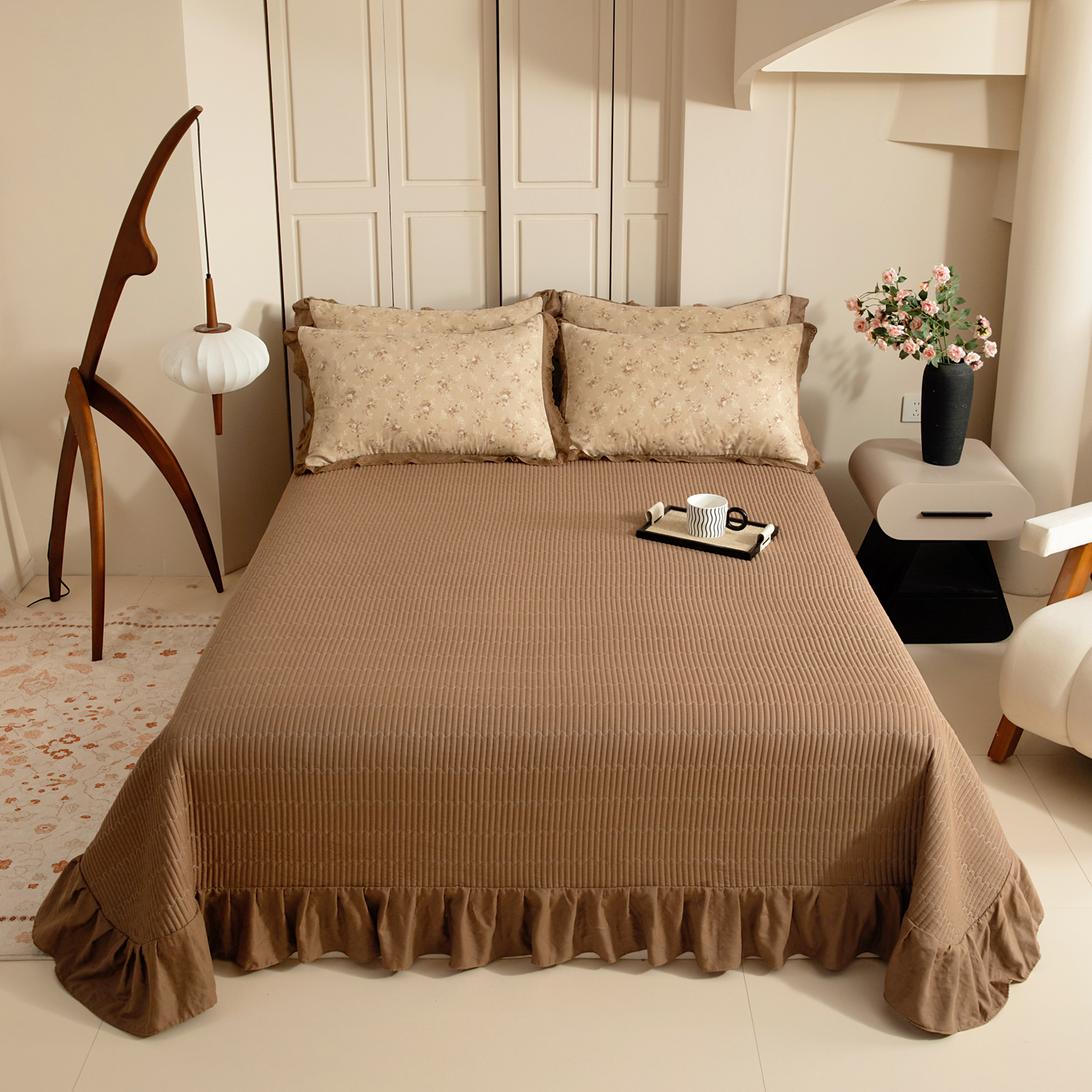 (总)情煊家纺 2026新款全棉双层纱单品床盖,焦糖,奶油黄,深咖,仙霞,胭脂红