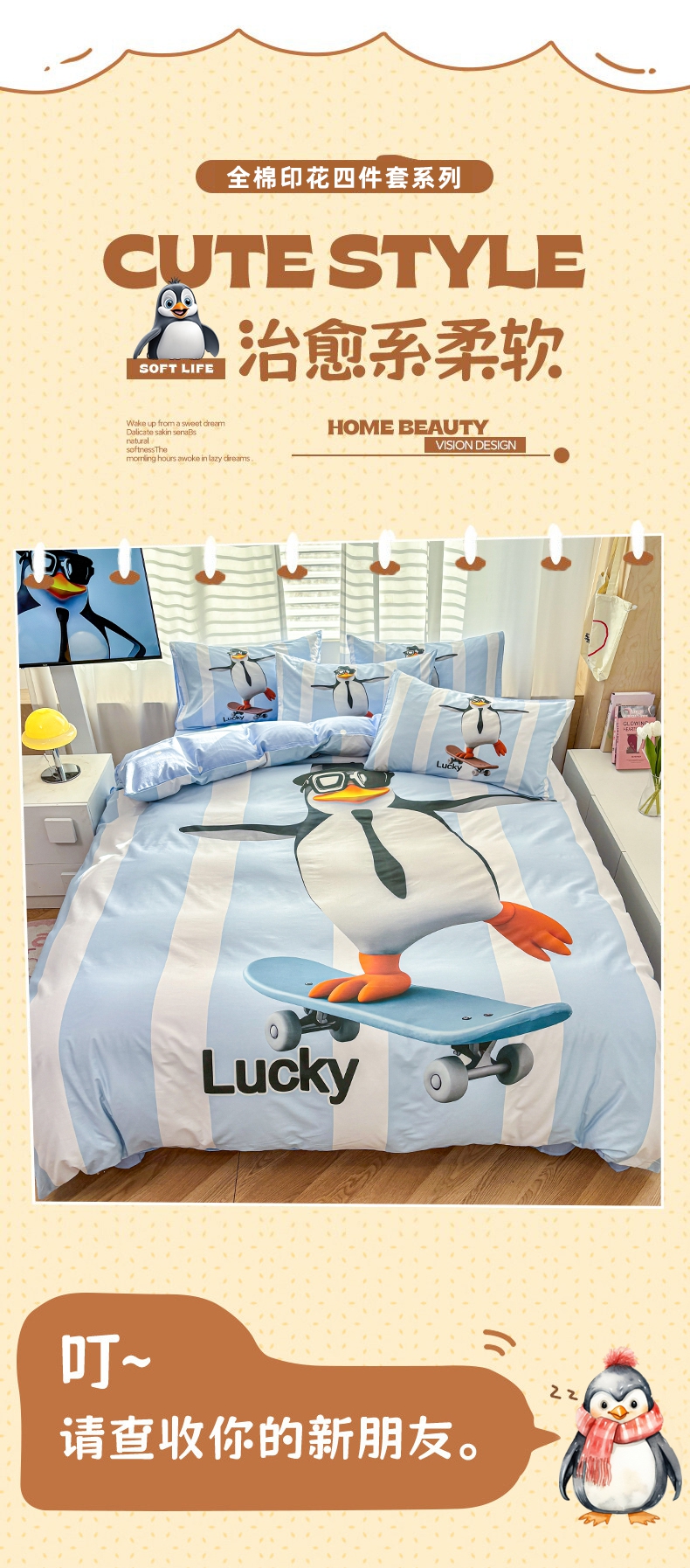 当前位置: 91家纺网 > 商品网购 > 床品套件 > 四件套 > 全棉普通四件套 > 孩子王家纺 2026新款卡通亲肤活性大版全纯棉专版企鹅系列四件套 冬日企鹅
