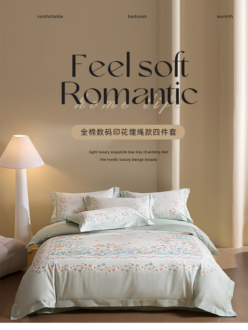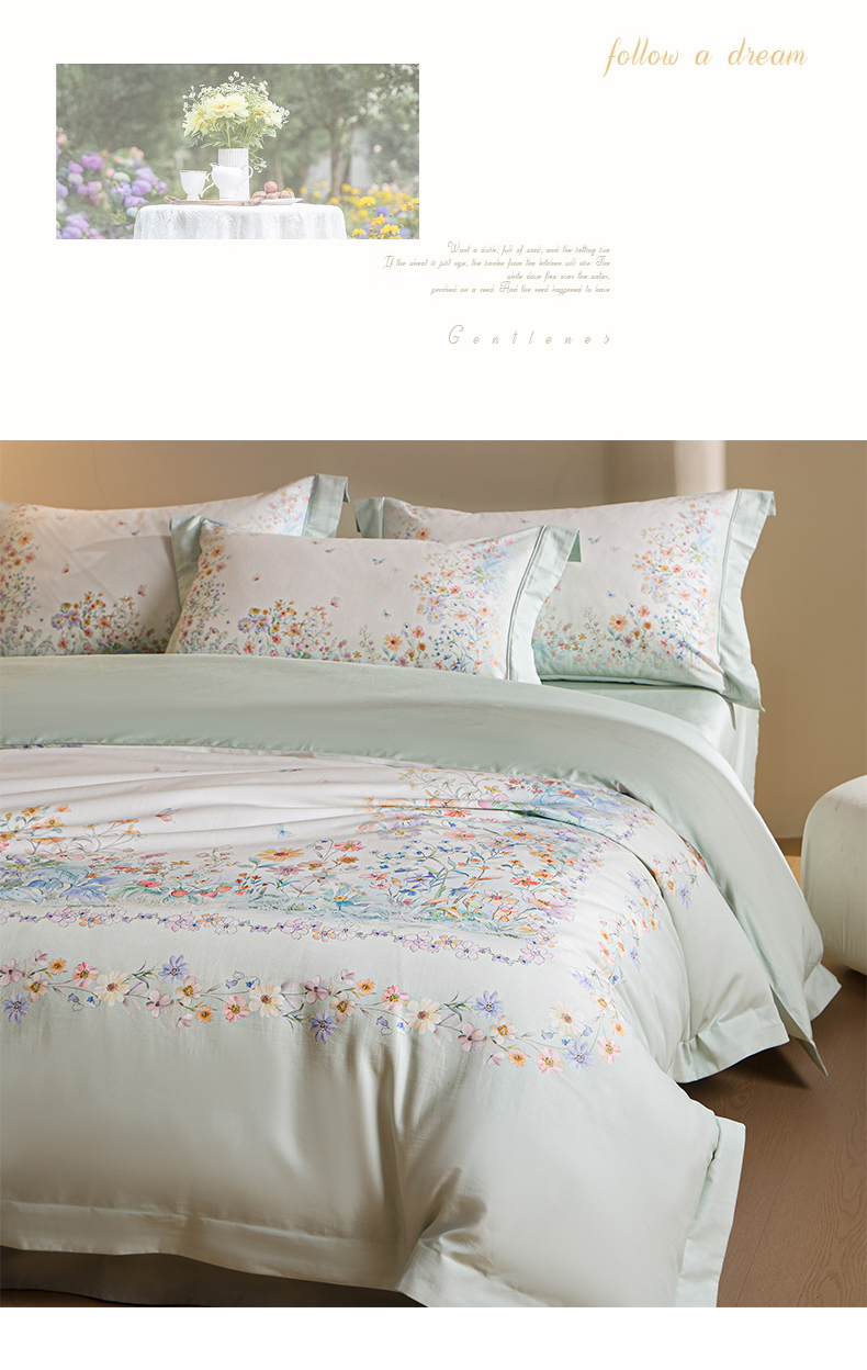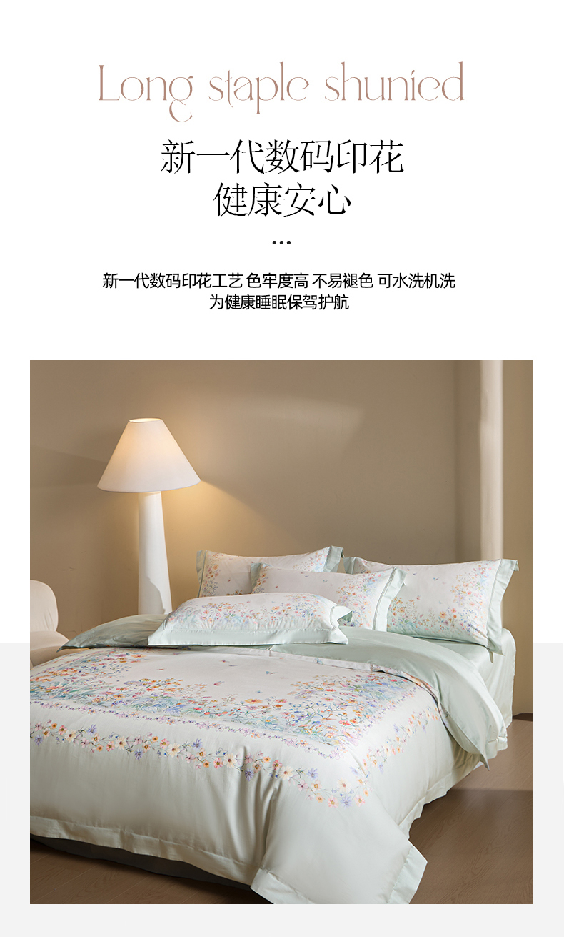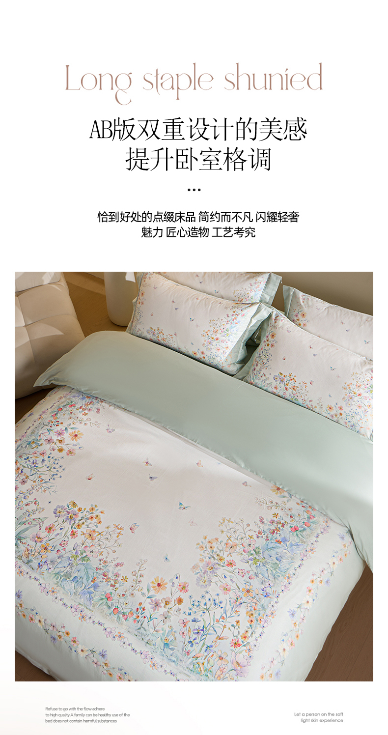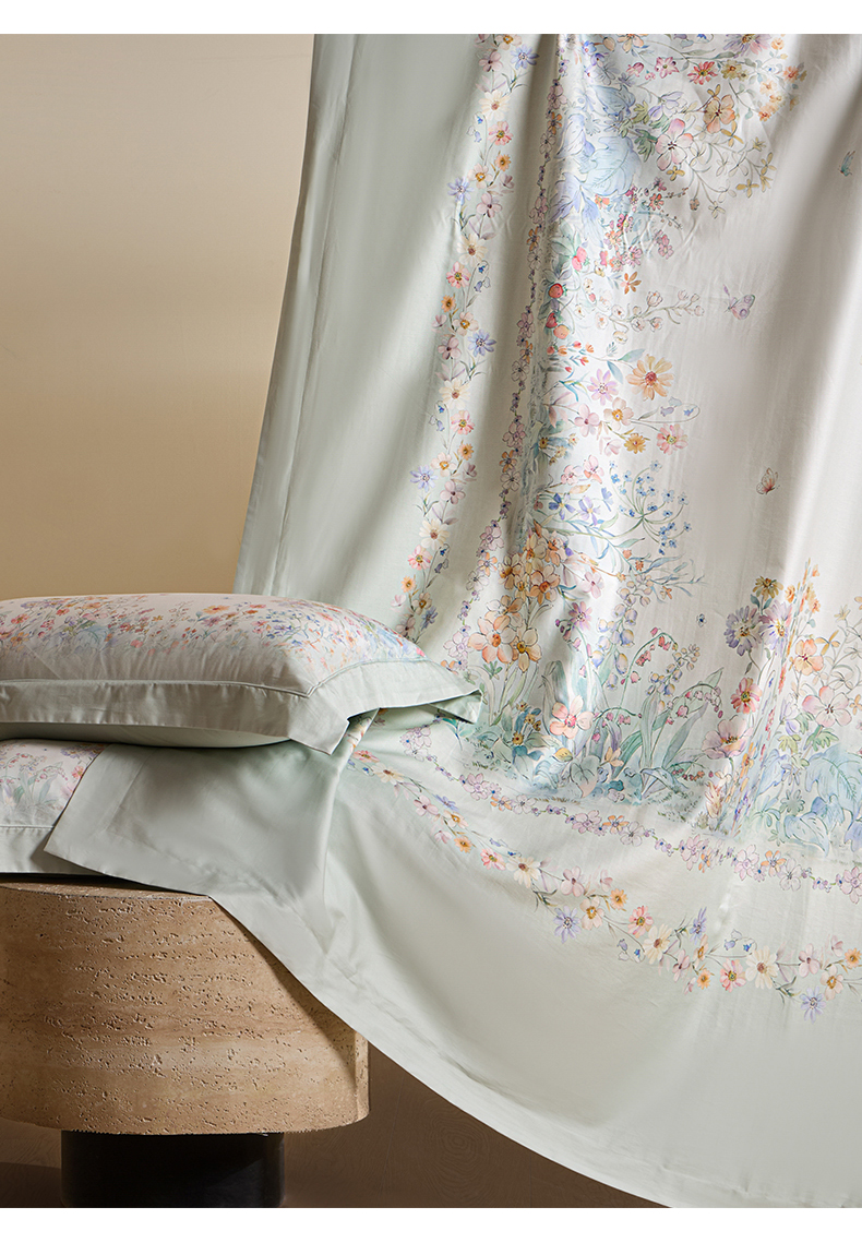 U品汇 2026新品纯棉全棉平网大版数码印花四件套高端60支长绒棉贡缎埋绳宽边系列 花间逐梦(绿)