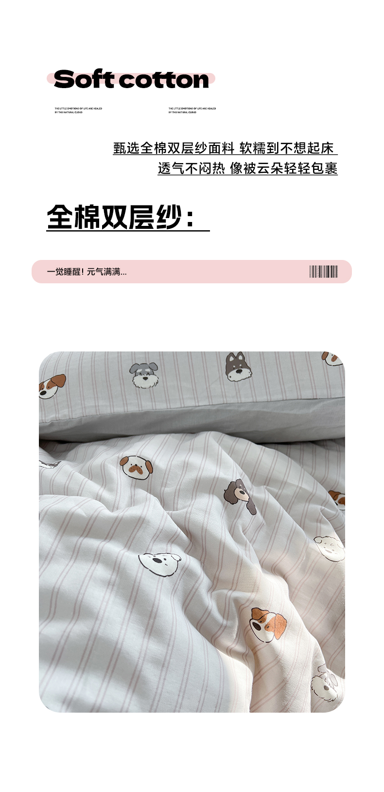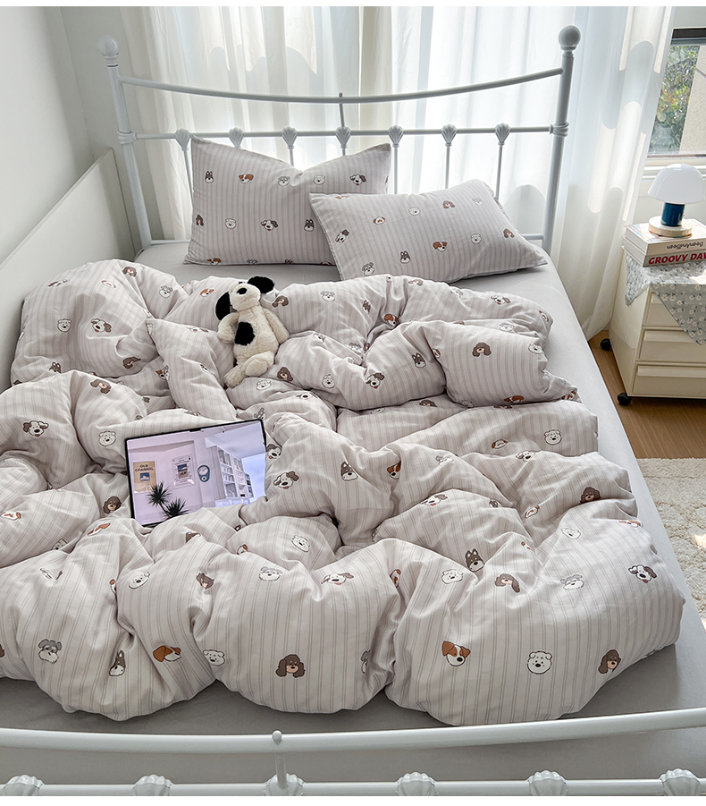 (总)早晨家纺 2026新款INS博主风卡通A类全棉纯棉双层纱四件套,奶狗日记-灰,奶狗日记-蓝,腊肠狗,气球城堡,软萌喵趴,森林小窝,樱桃小兔