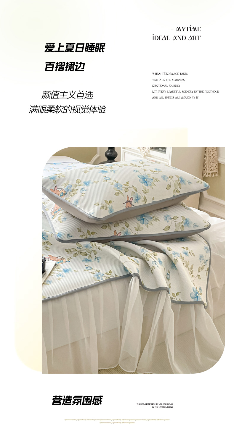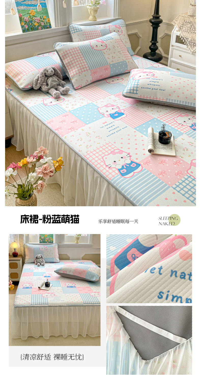 (总)柒月家居 2026新款斜纹凉感豆豆床裙款凉席,床裙-蓝雾花枝,床裙-粉豹黑皮,床裙-粉花软熊,床裙-粉蓝萌猫,床裙-花花精灵,床裙-花筐奶兔,床裙-玫瑰园,床裙-浅夏花兔,床裙-青叶萌物