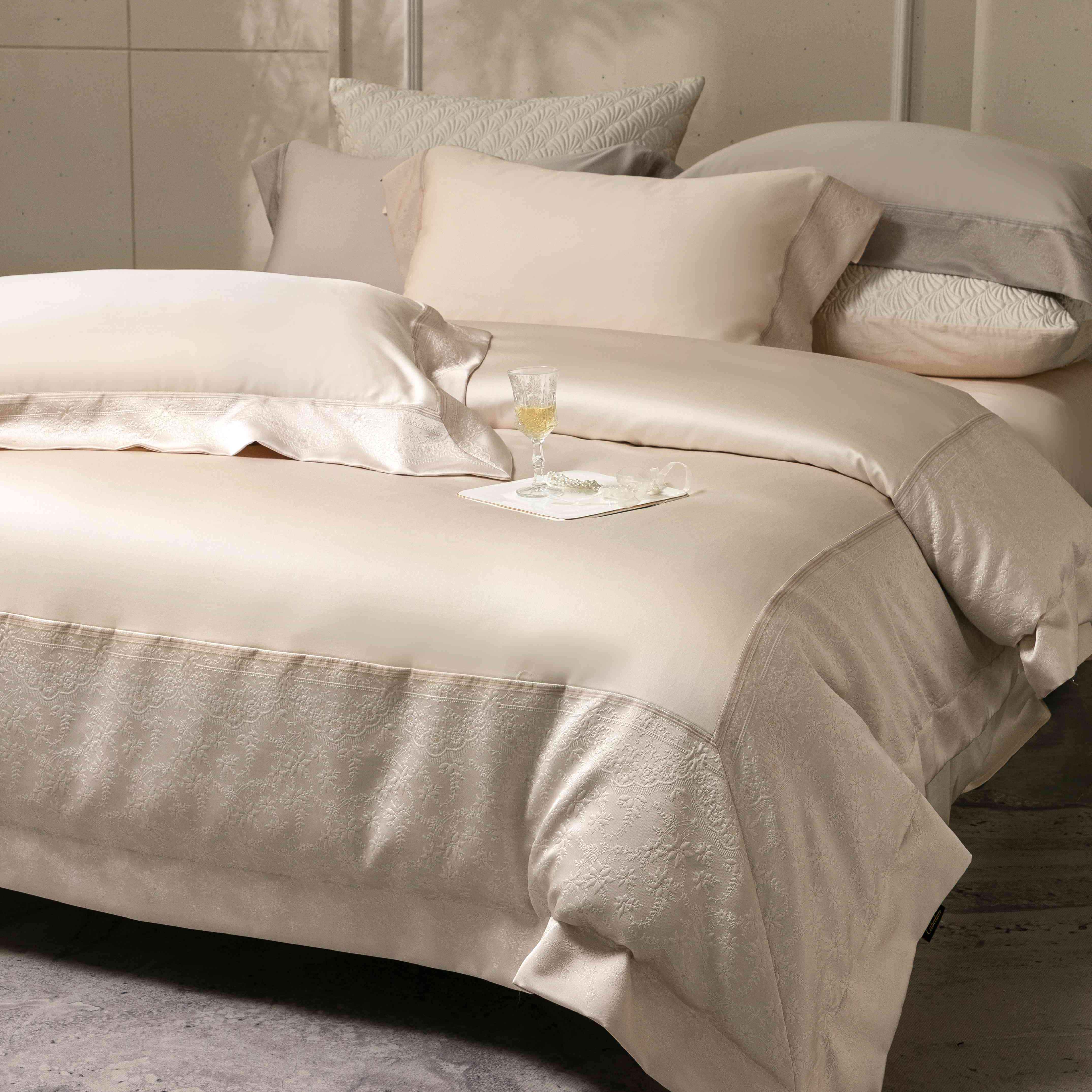卡巴伦家纺 2026春夏新款全棉纯棉贡缎高精密提花边条款式四件套 南法庄园-高级灰