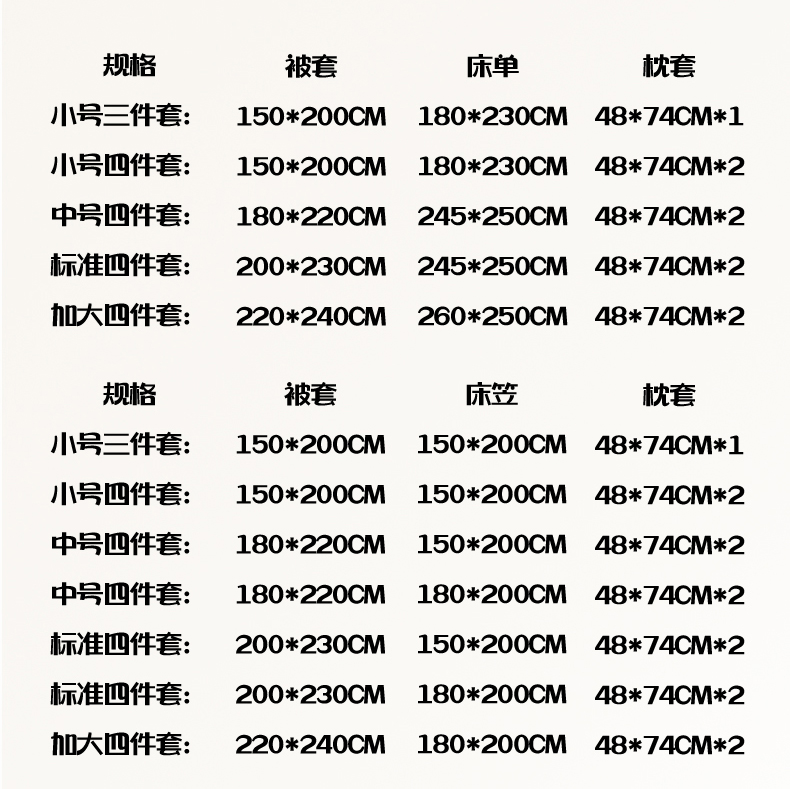 中号四件套:被套180*220床笠150*200 | ¥48.00 |