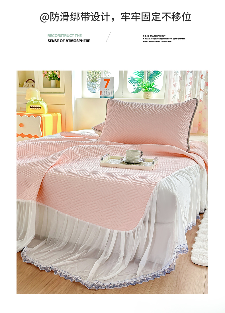 • 91家纺网 家纺一手货源 找家纺 丹本家纺 2026新款凉感夏被空调被凉席空调席冰丝席纯色床裙乳胶席三件套四件套菱形格 菱形格床裙款-粉色